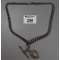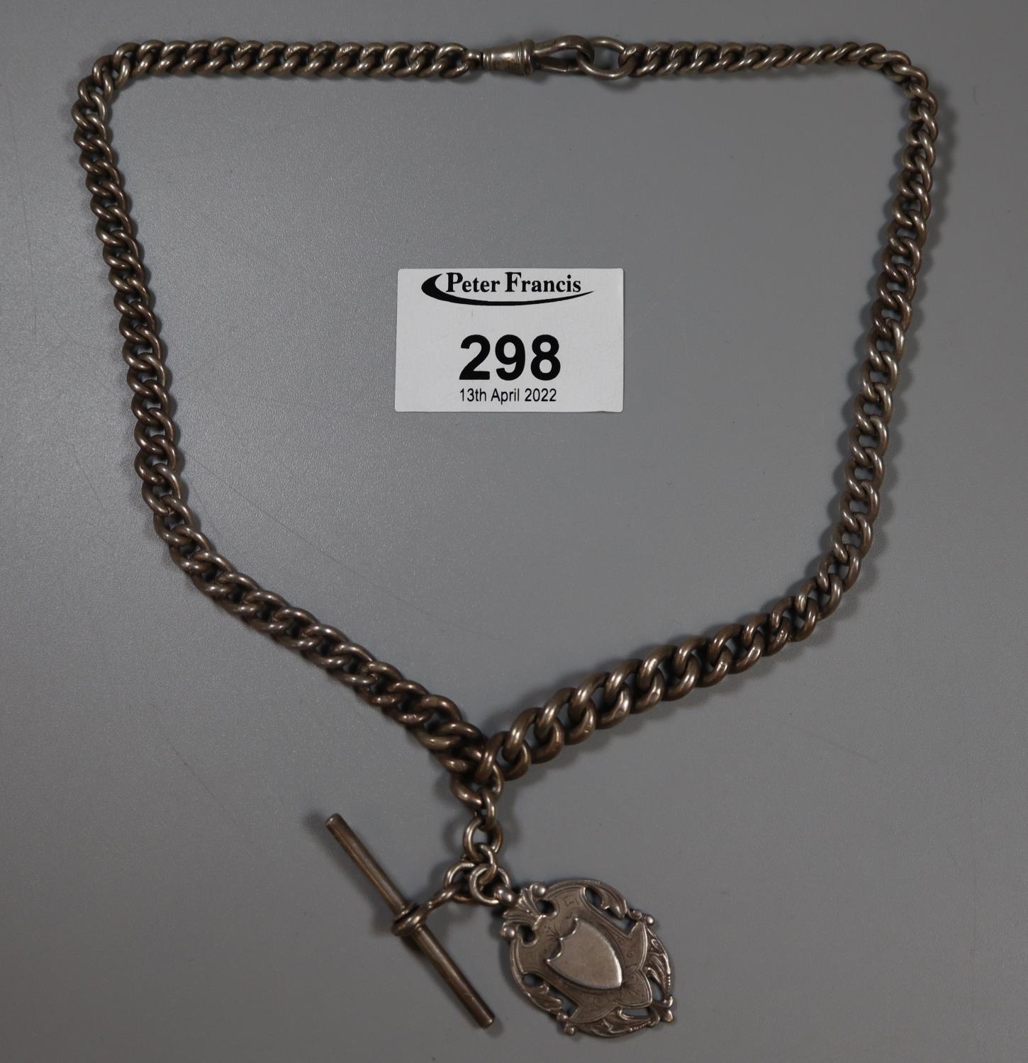 Victorian silver Albert chain with shield shaped fob and T Bar. Approx weight 63.5 grams.
