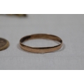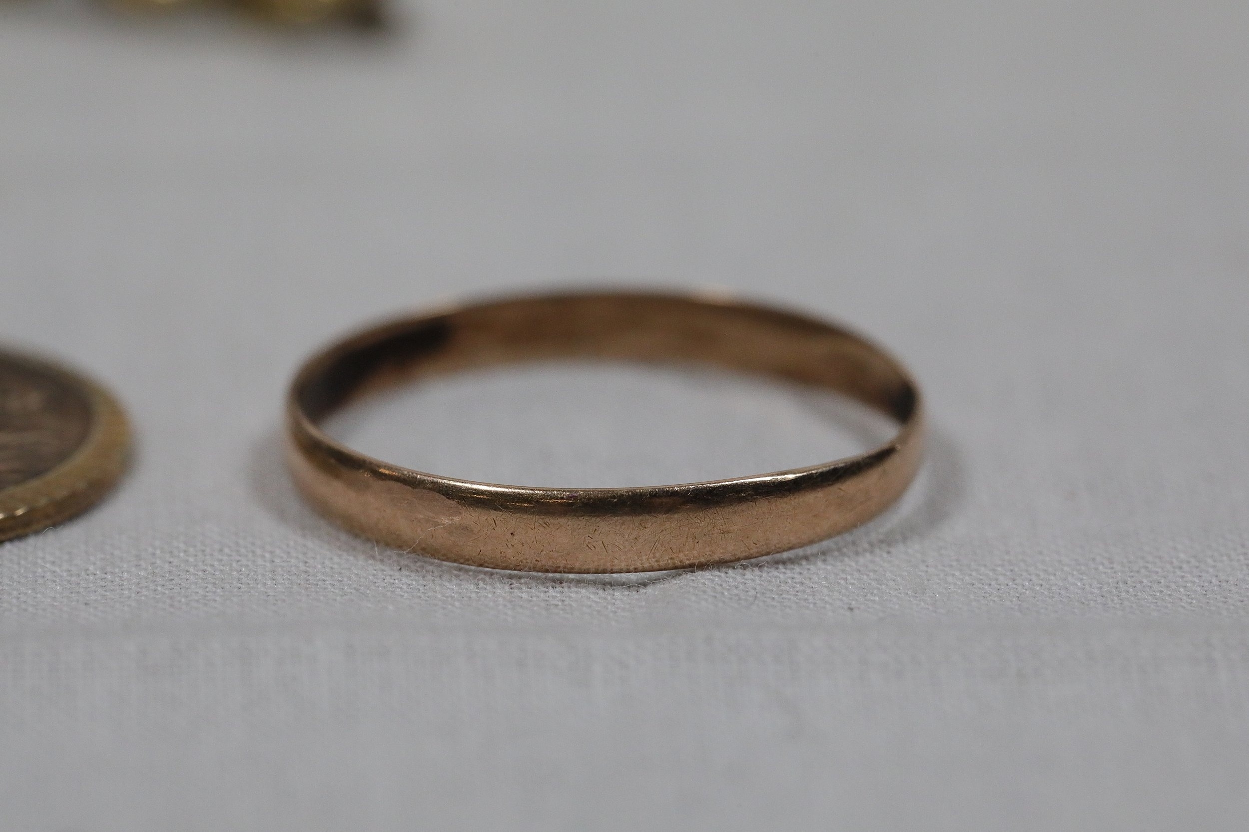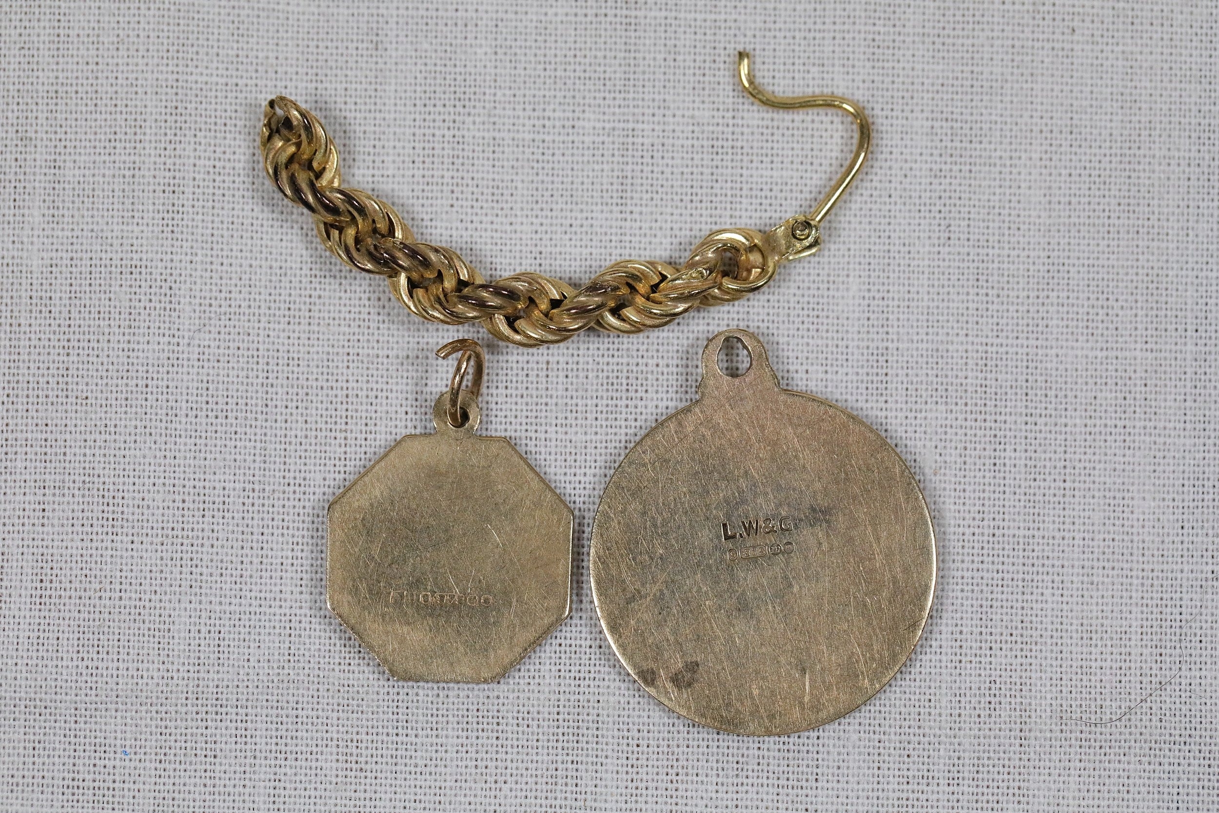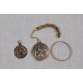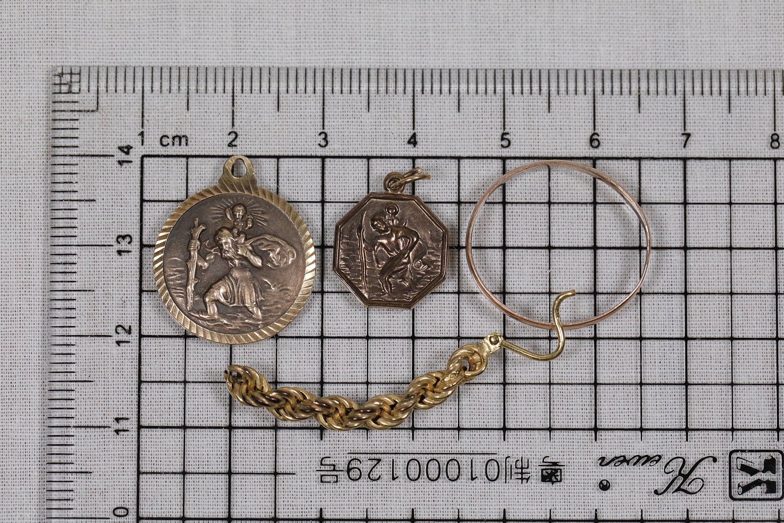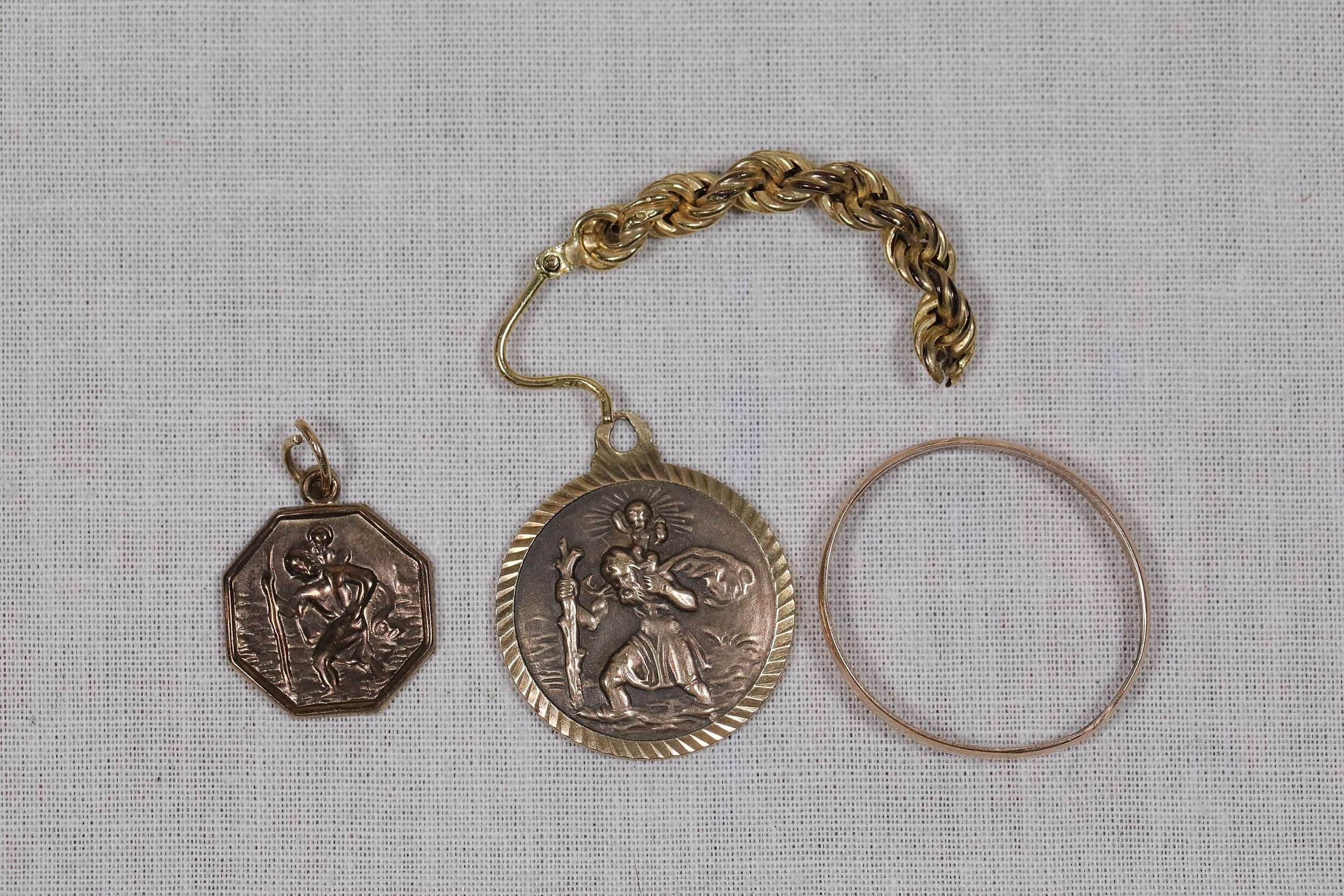 Mid 20th century gold devotional jewellery collection comprising an octagonal Saint Christopher pendant, a circular Saint Christopher medal with radiating border, a short rope twist chain with hook fastener, a thin circular bangle and a plain band ring. The octagonal pendant is stamped T OTOOLE. The circular medal is marked LW and Co and DIE 830. Approximate dimensions: circular medal 2.7 cm diameter, octagonal pendant 2 cm across, chain 4.5 cm length, bangle 5.5 cm diameter, band ring 2 to 3 mm wide. Total weight approximately 6 grams. The medals depict the traditional protective Christian iconography of Saint Christopher carrying the Christ child.