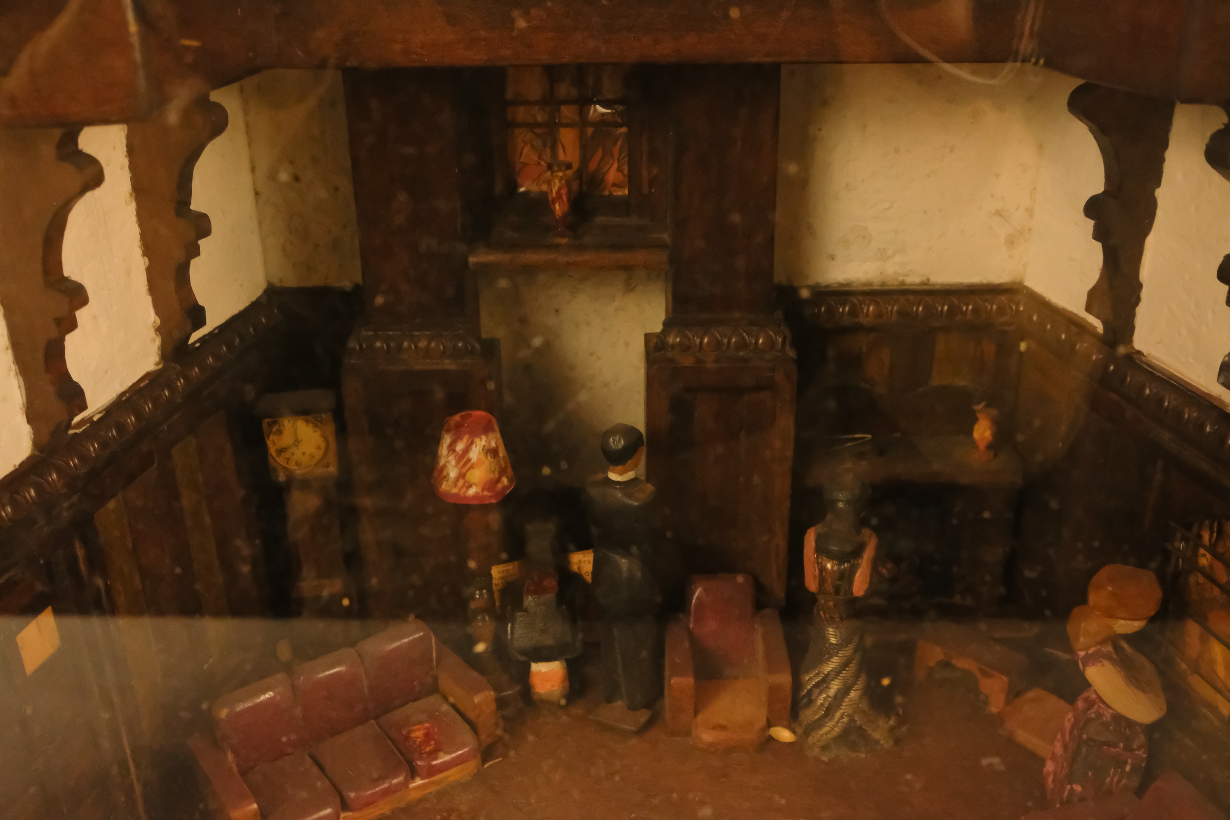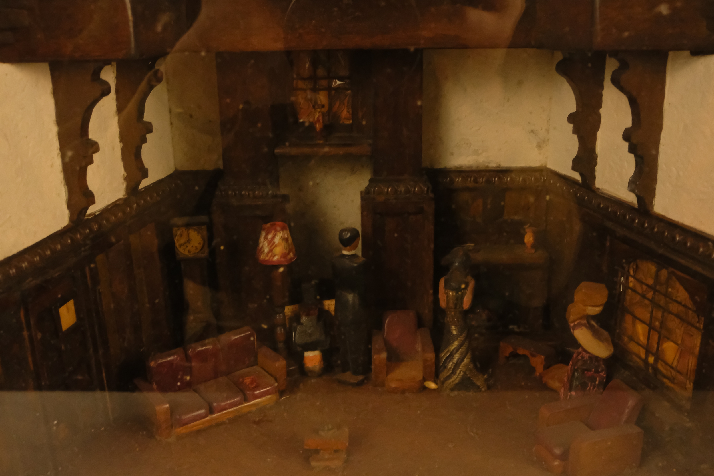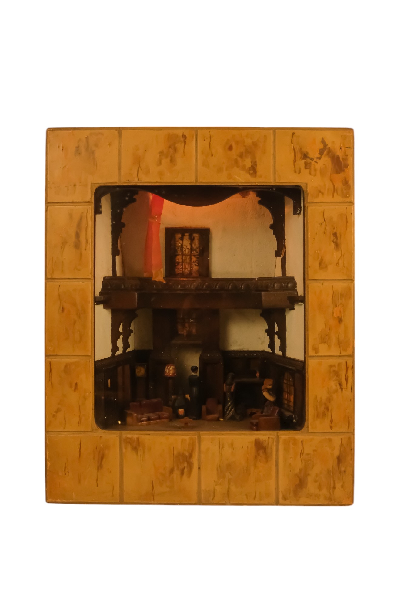A vintage illuminated diorama - showing a 1930's mock Tudor country house interior with figures, 42 x 31 x 25cm.