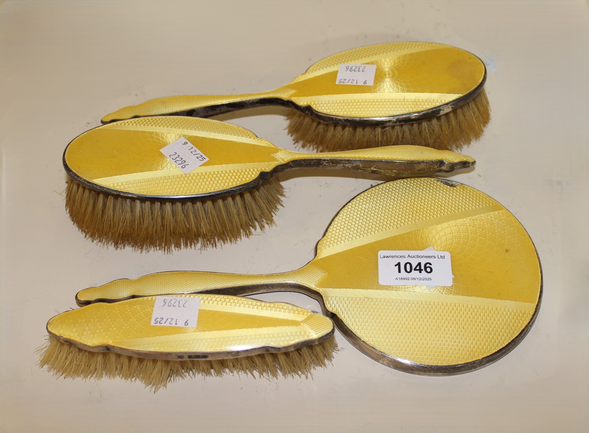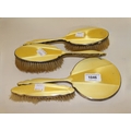 Birmingham silver and yellow translucent enamel decorated four piece dressing table set