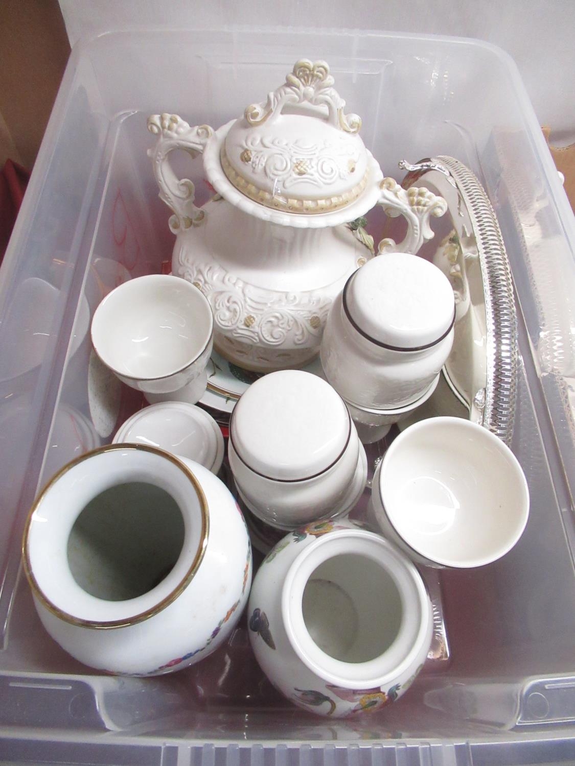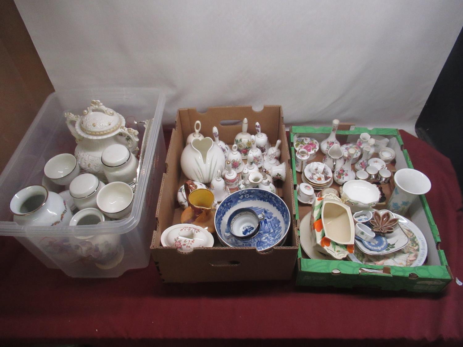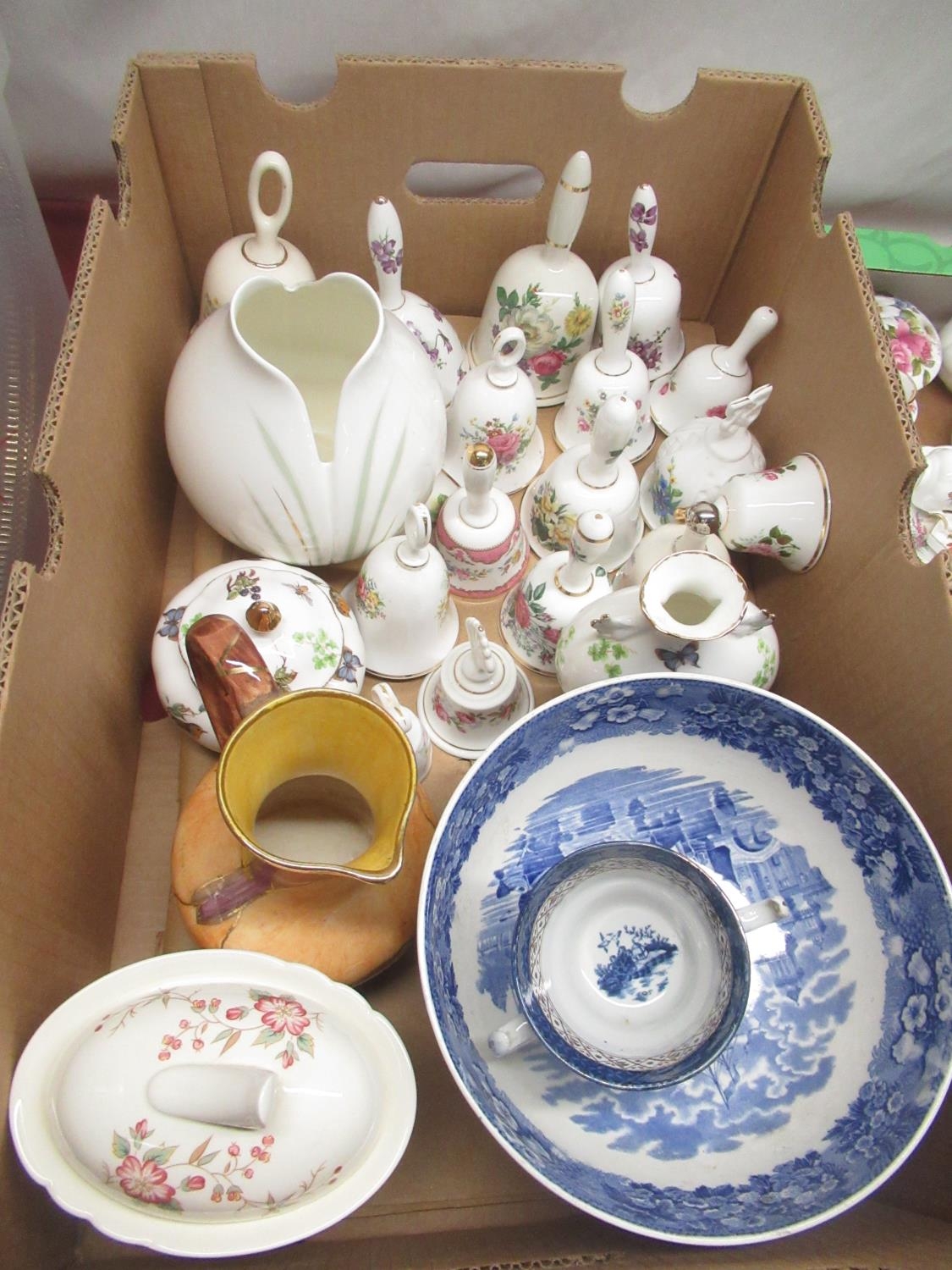 Collection of mixed ceramics and decorative bells, blue and white ware etc (3 boxes