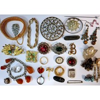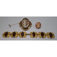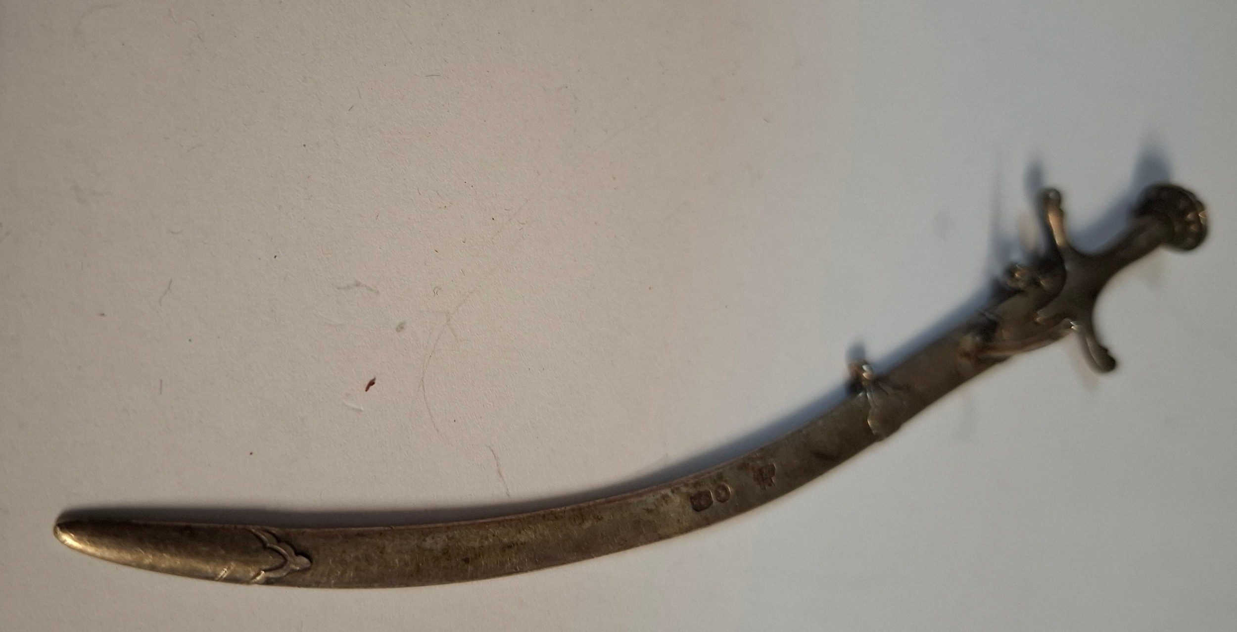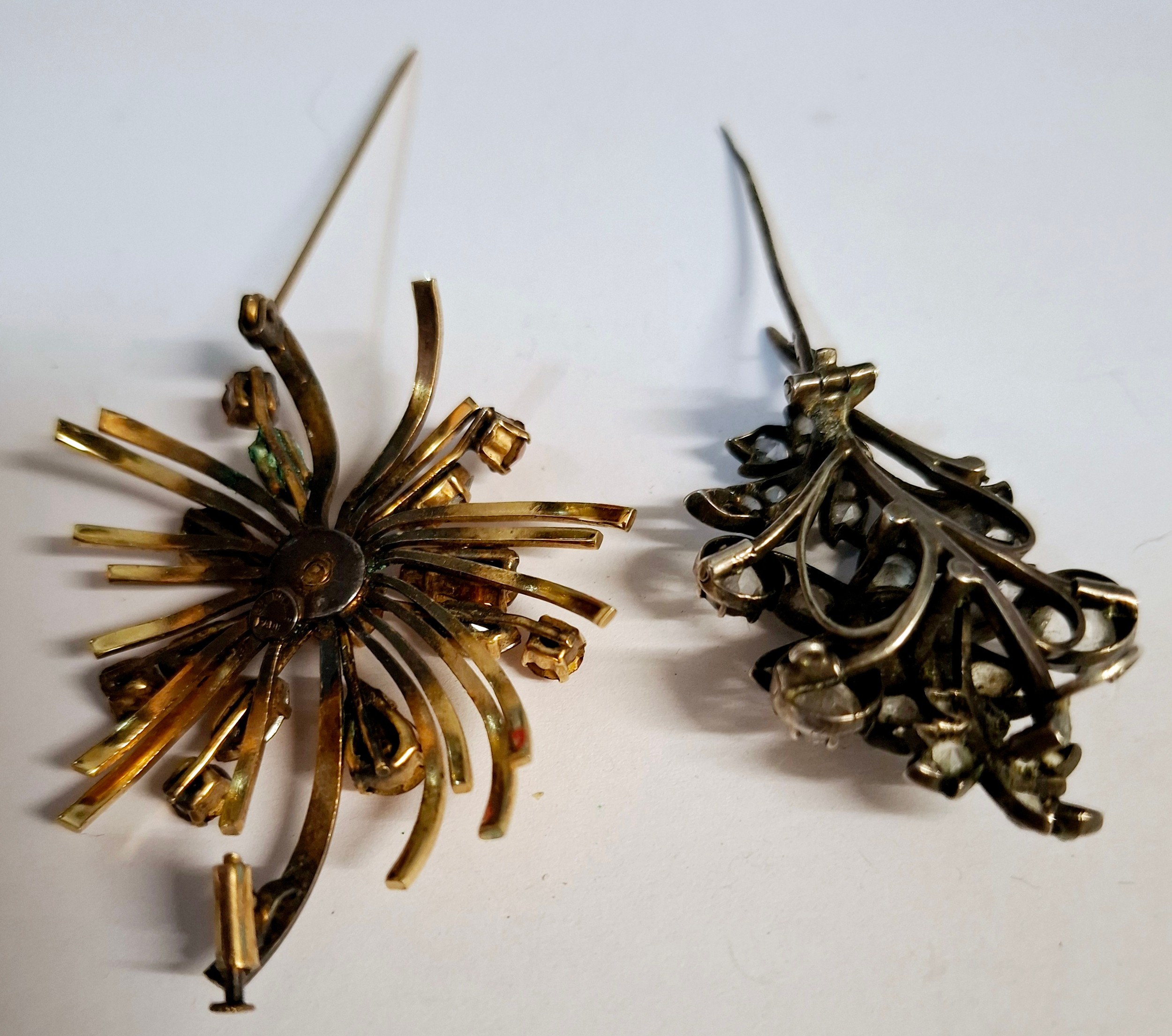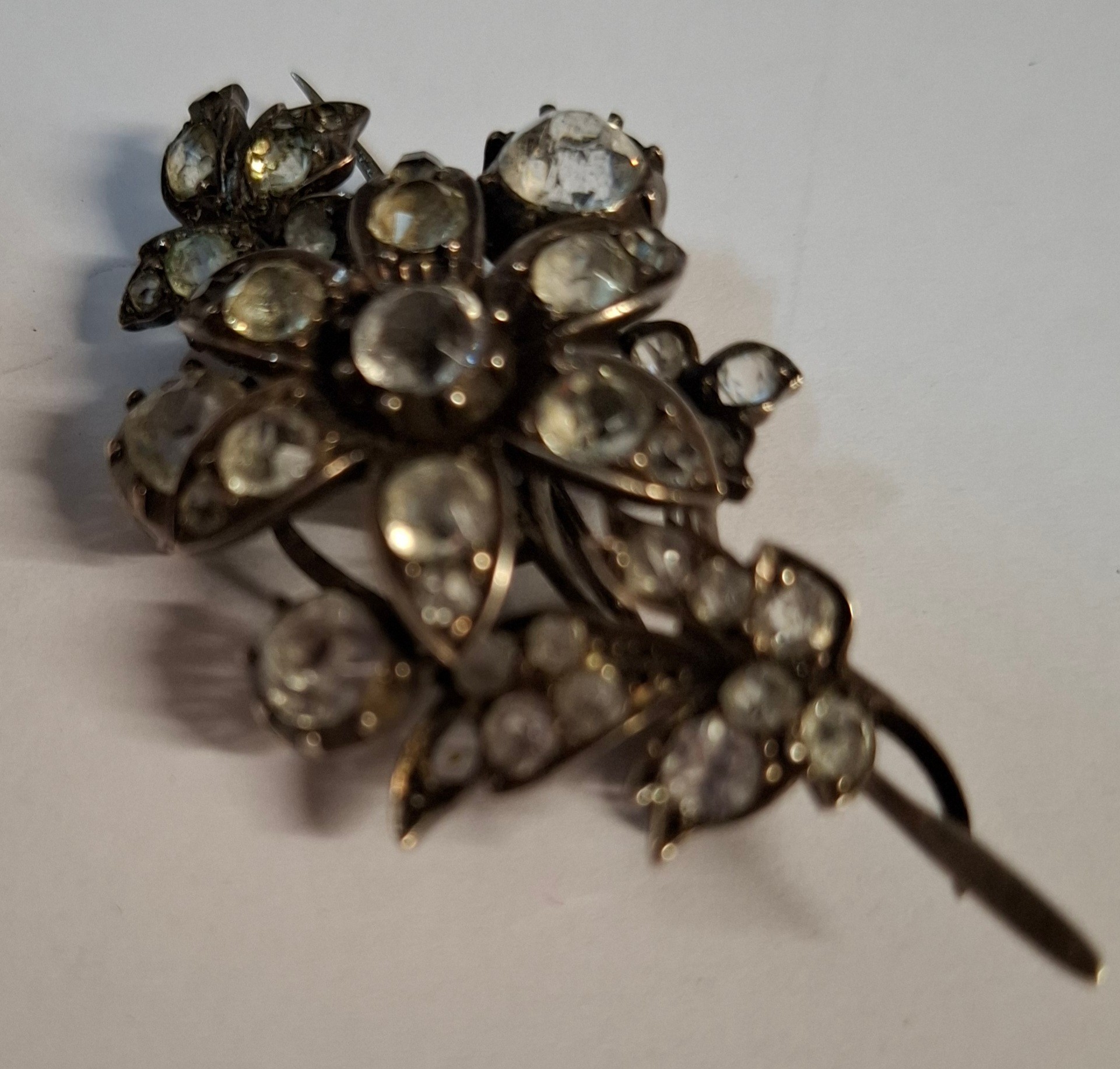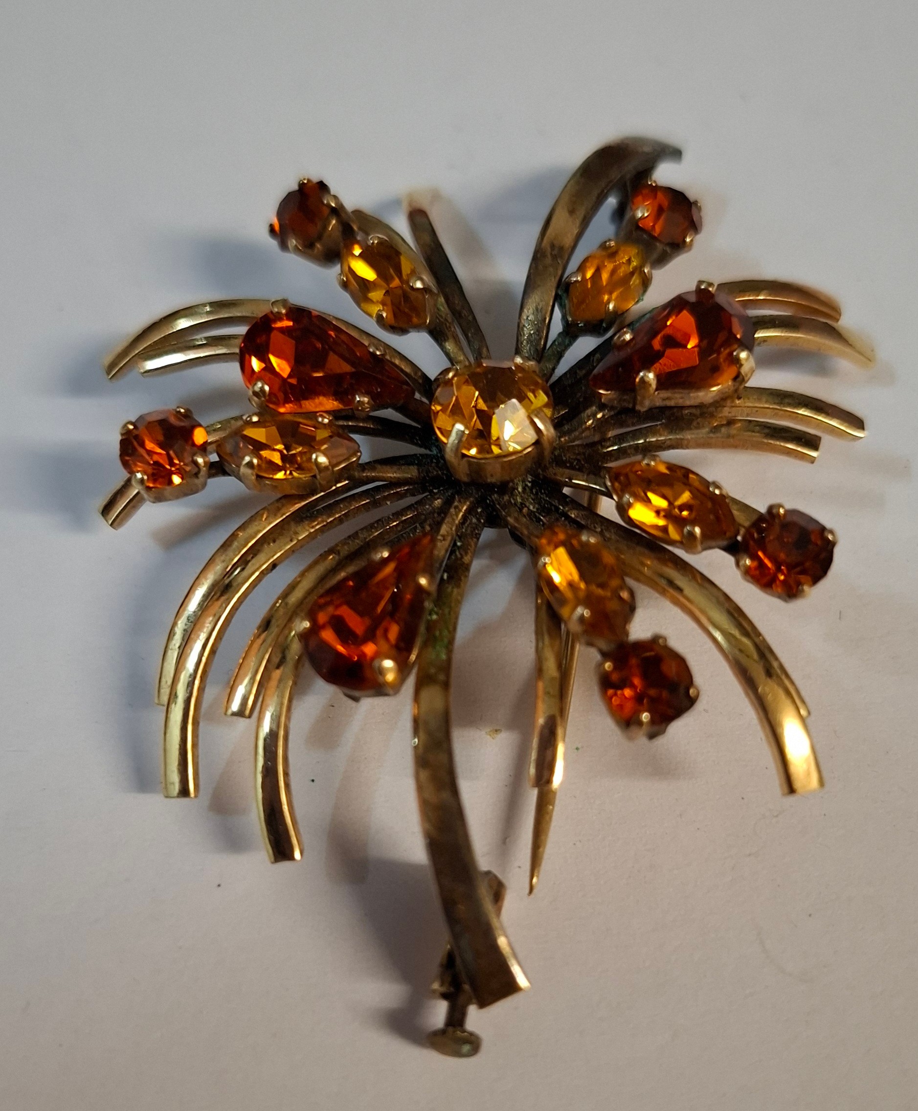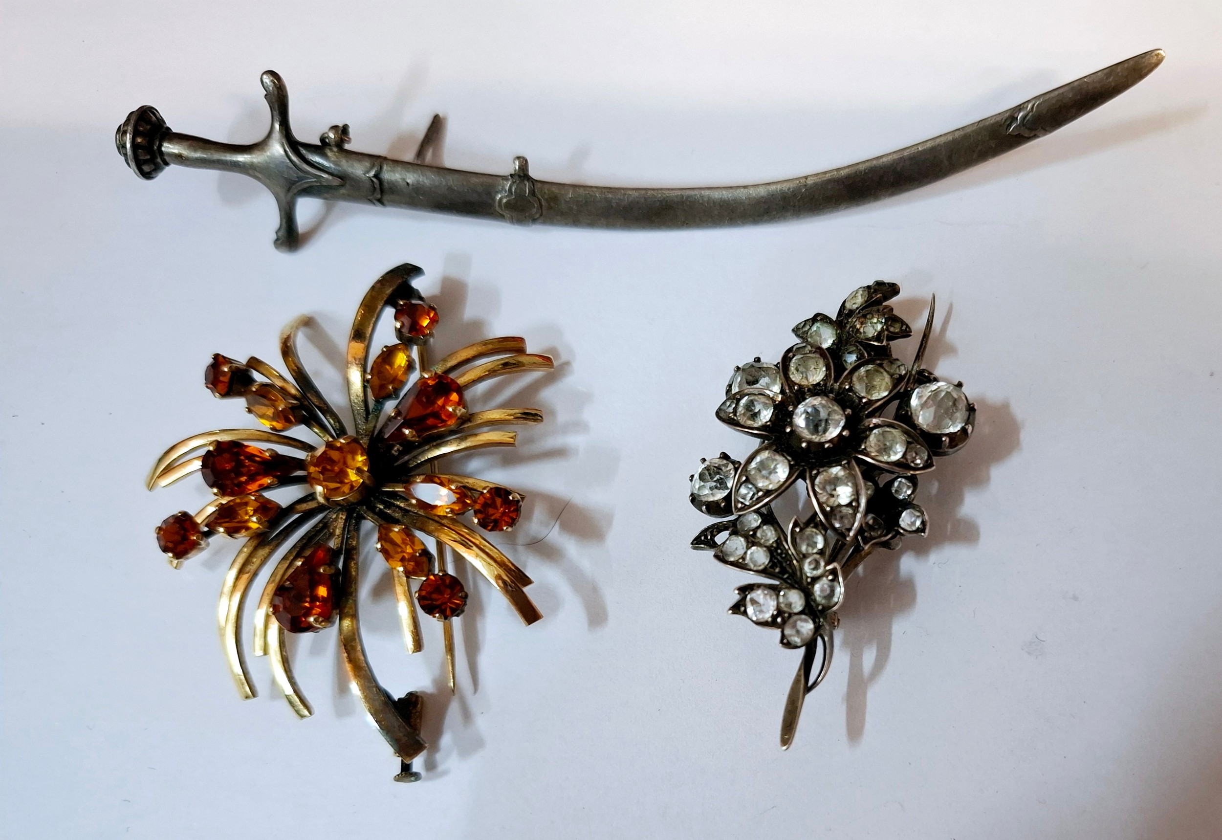 A Sharmaine of Paris gold plated floral brooch with inset amber and citrine coloured glass stones, approx 6.5cm long, an Edwardian white metal floral brooch with white glass stones and a 19th Century Robert Garrard II miniature white metal sword A/F makers mark RG, approx 12cm long