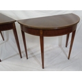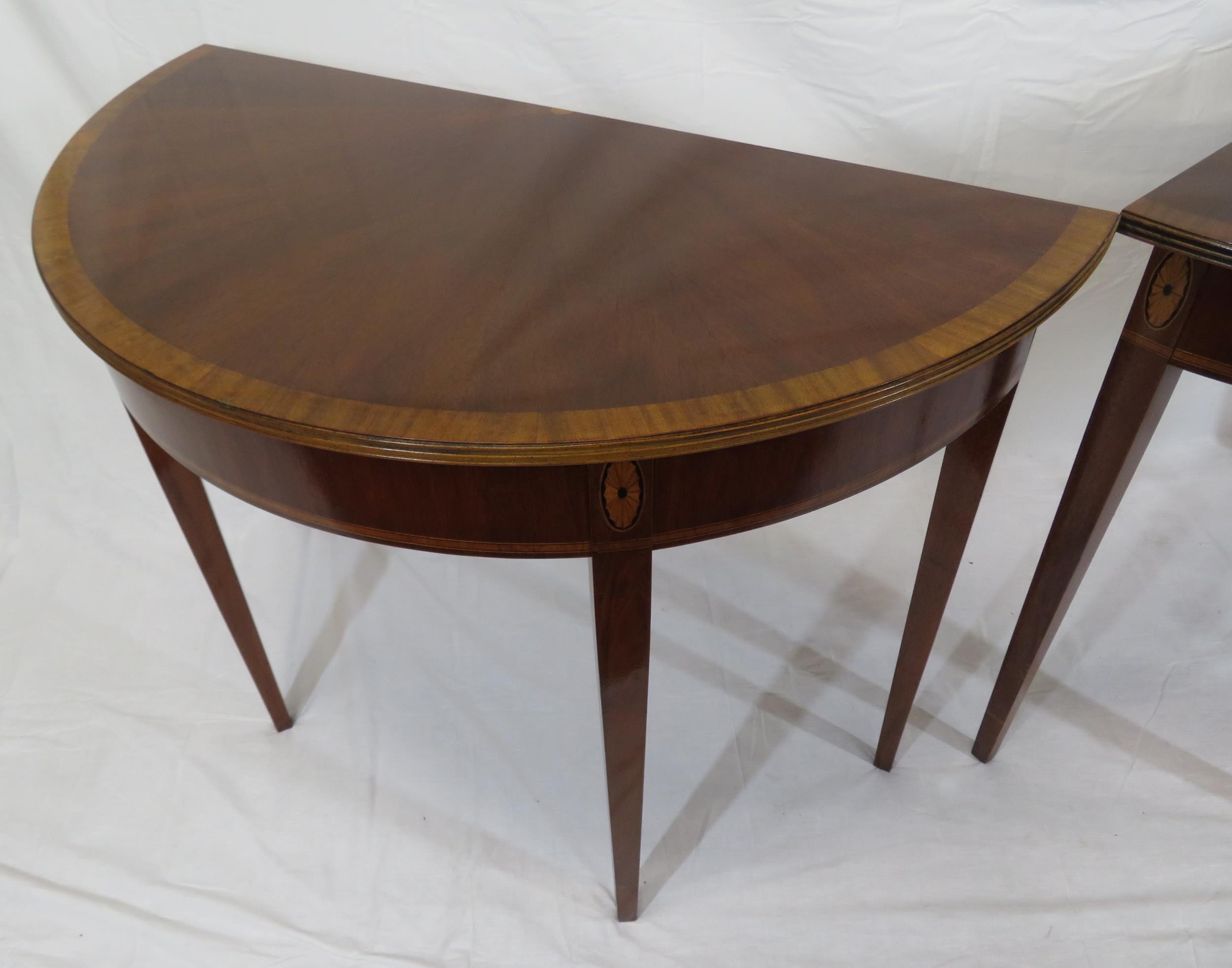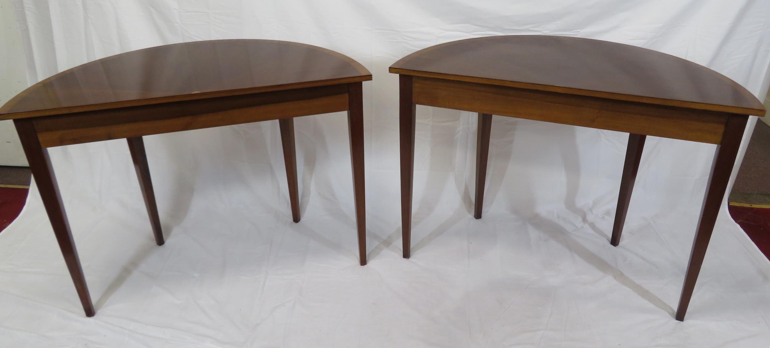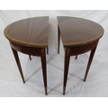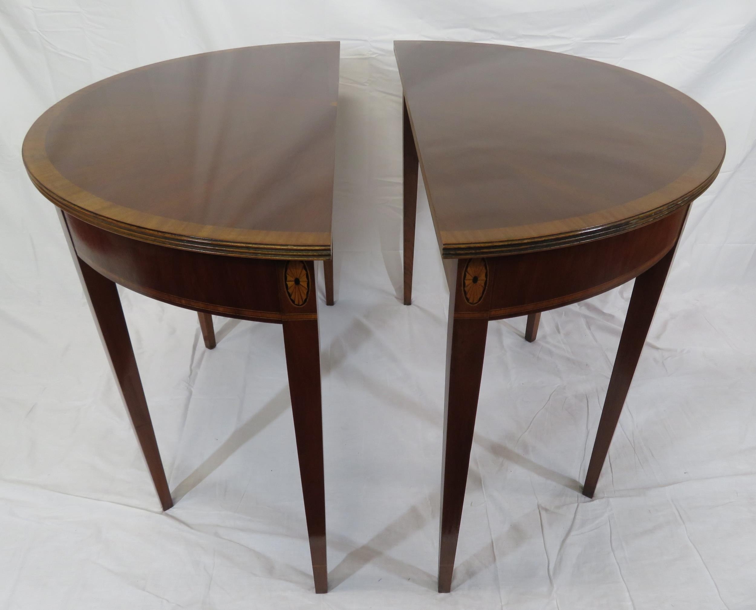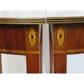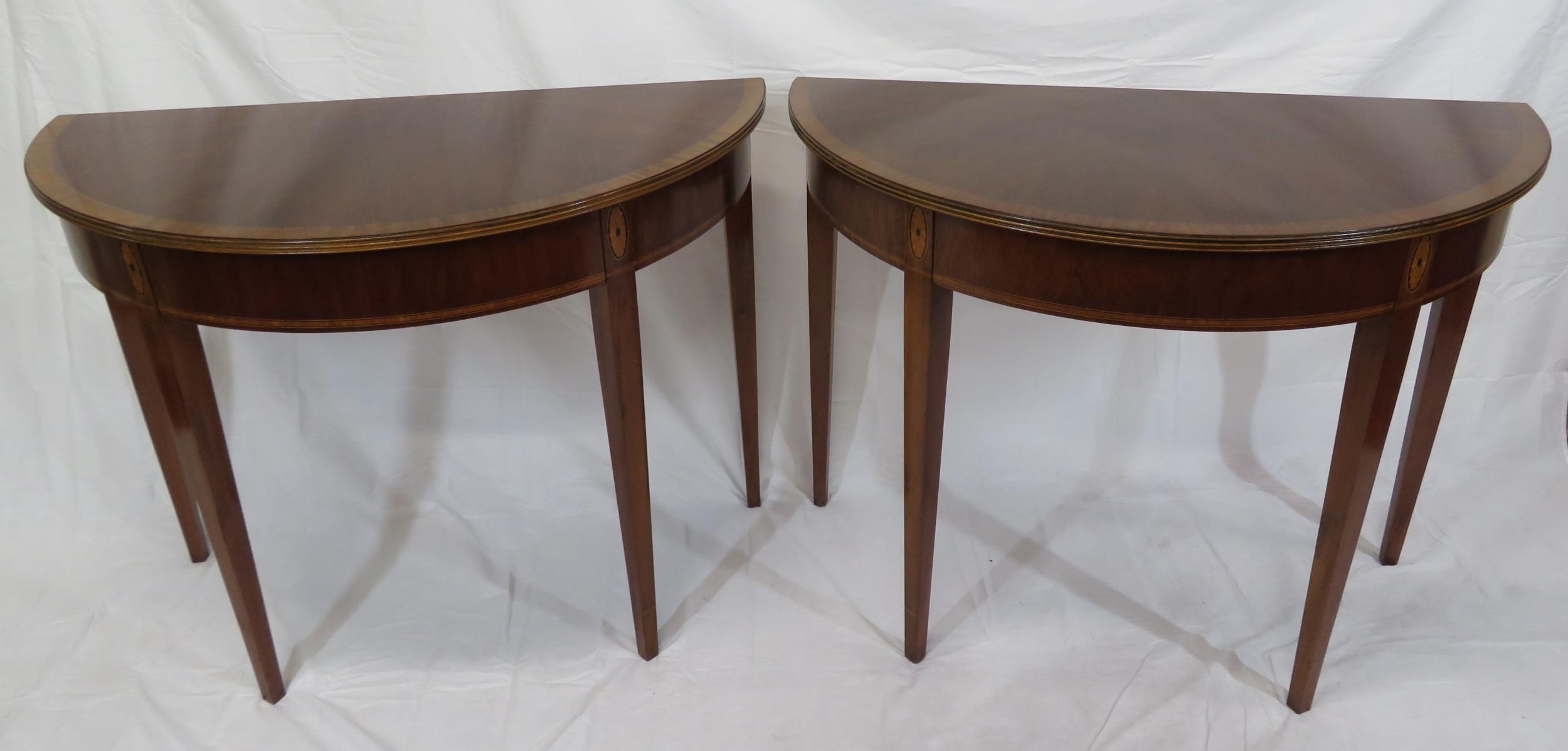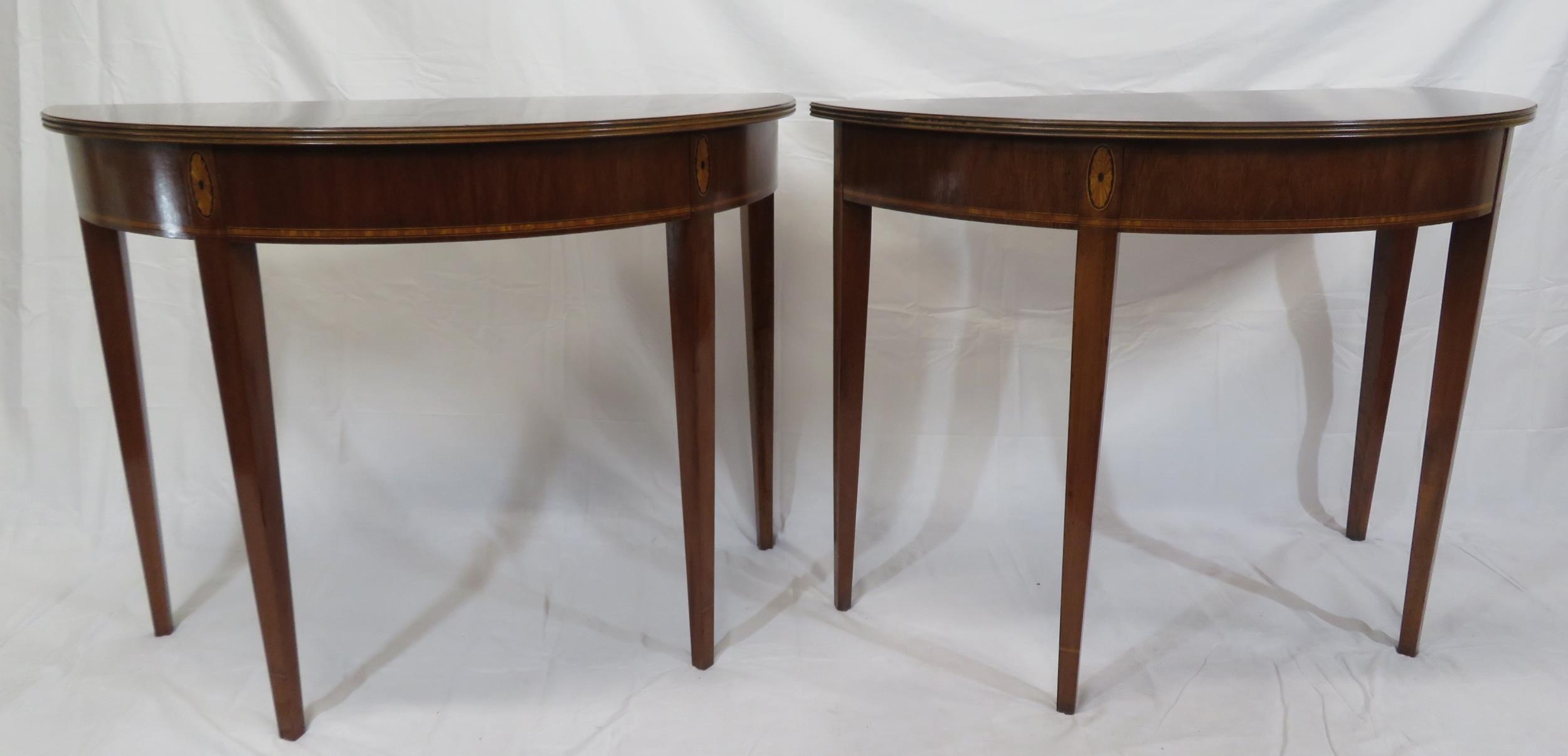 Pair of Edwardian style inlaid & crossbanded demi lune hall or side tables with reeded borders, oval shell panels, on square tapering legs