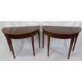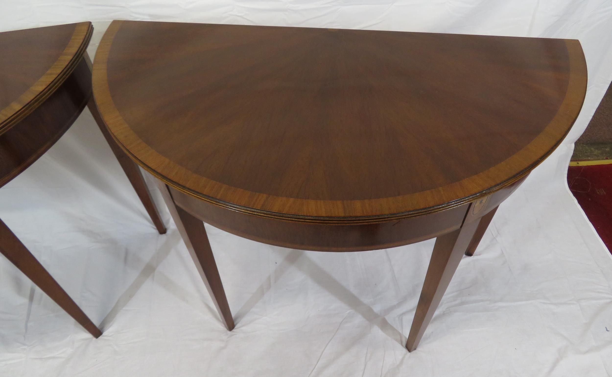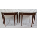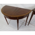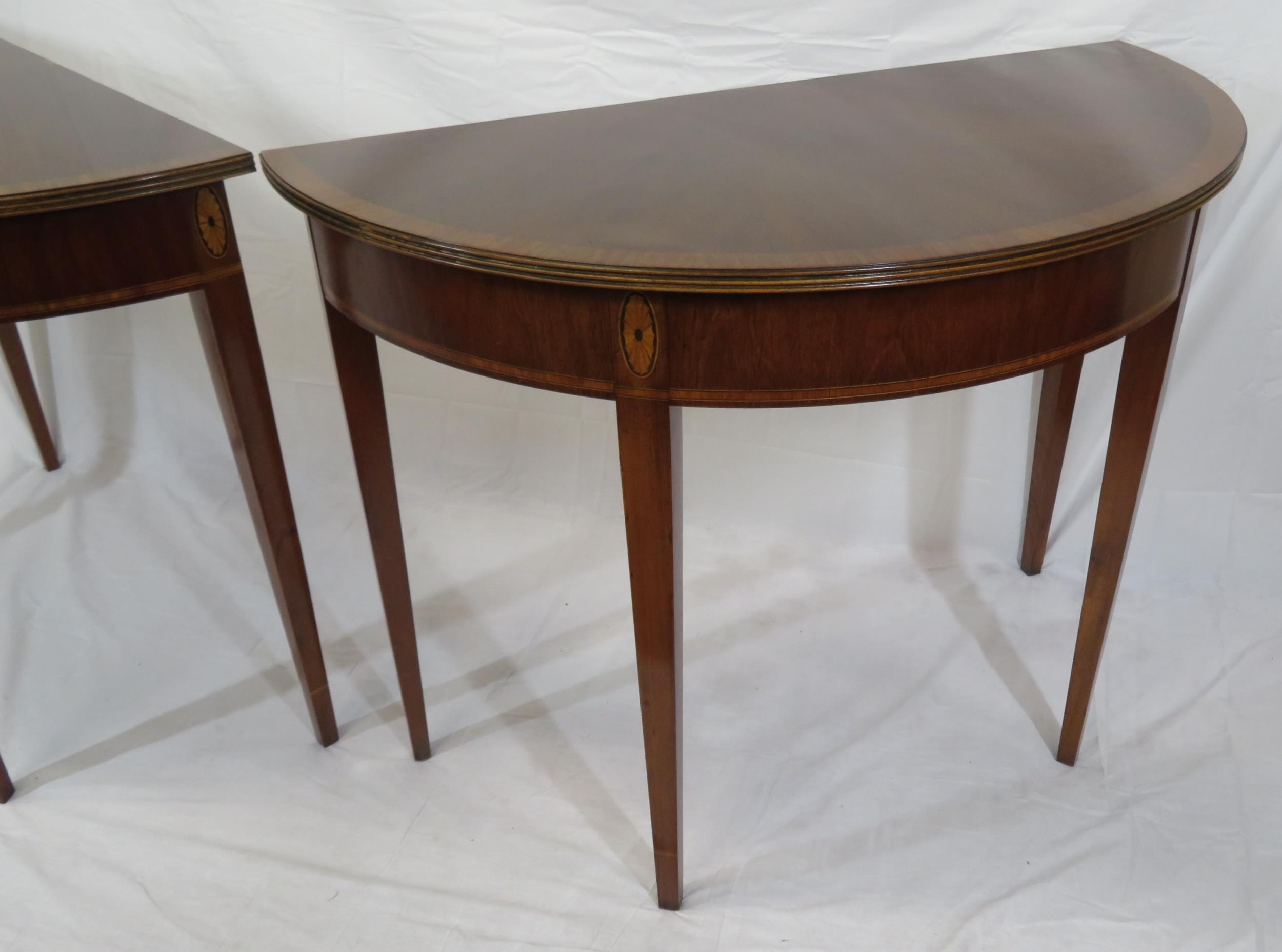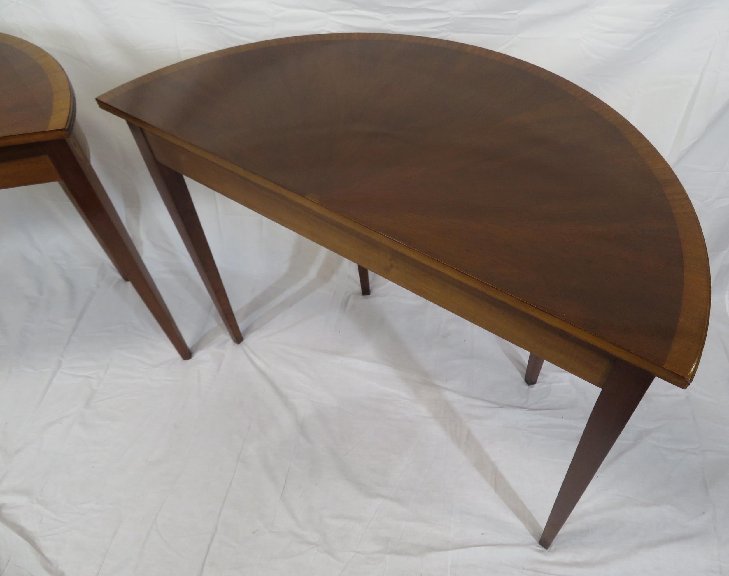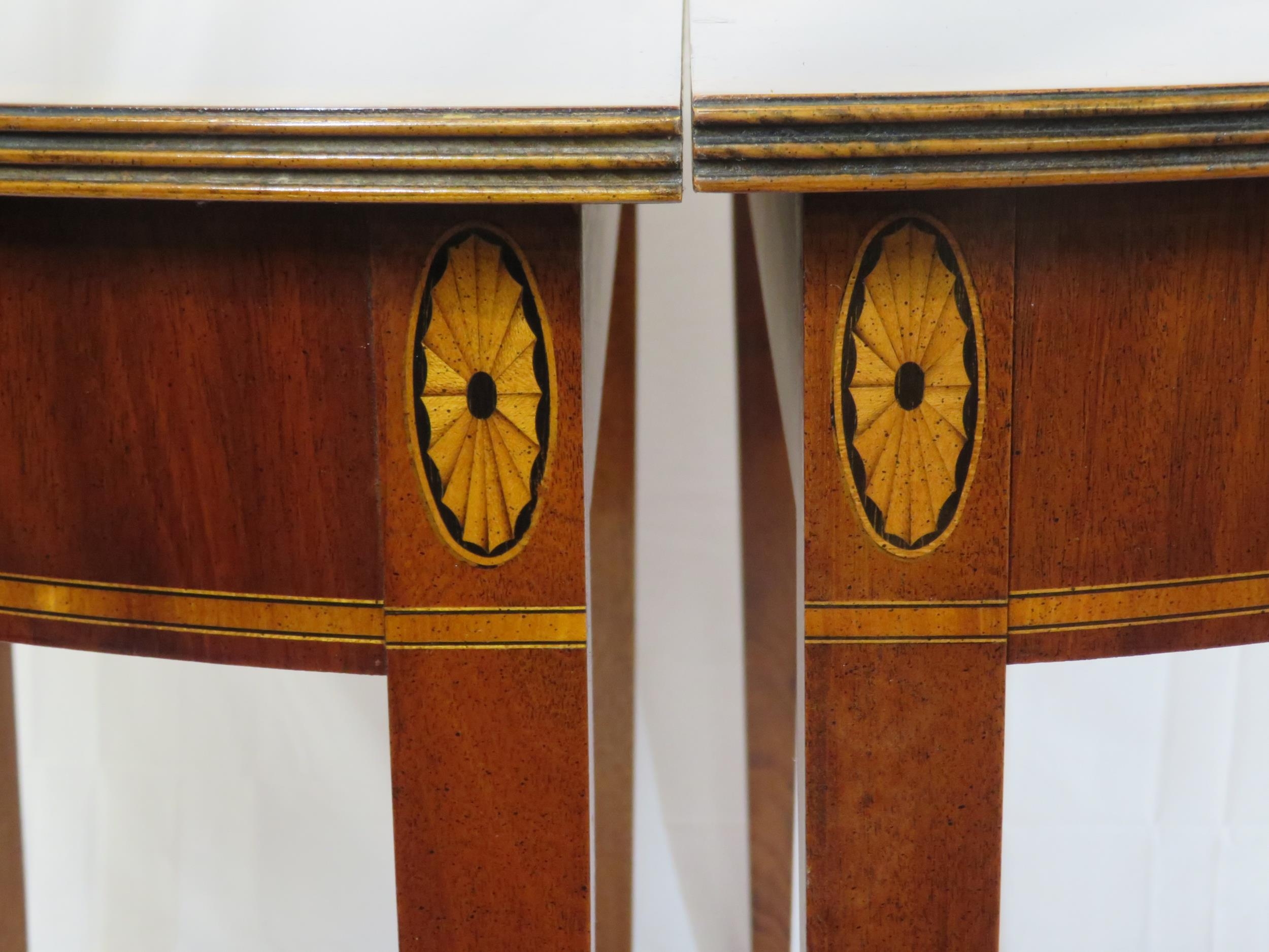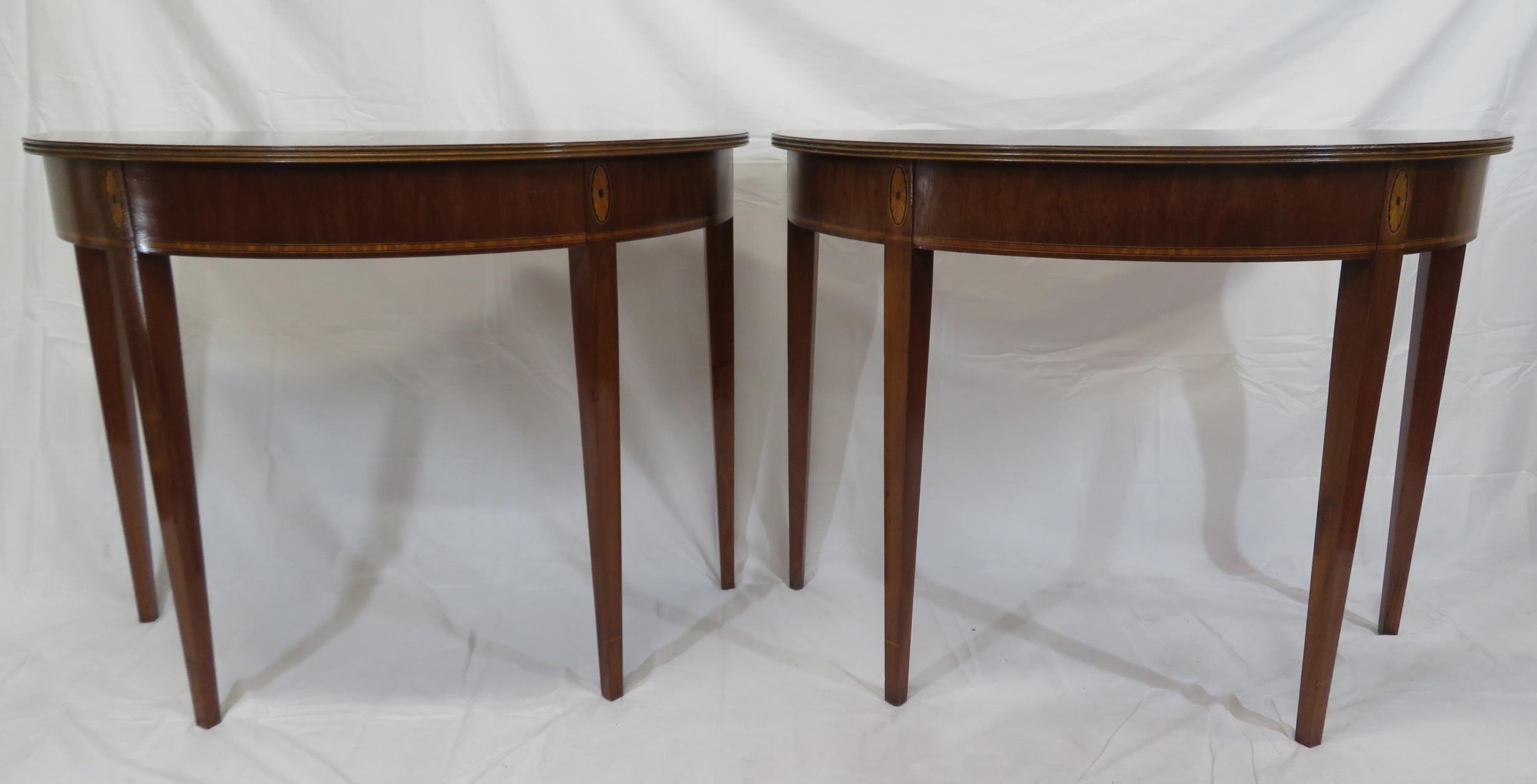 Pair of Edwardian style inlaid & crossbanded demi lune hall or side tables with reeded borders, oval shell panels, on square tapering legs