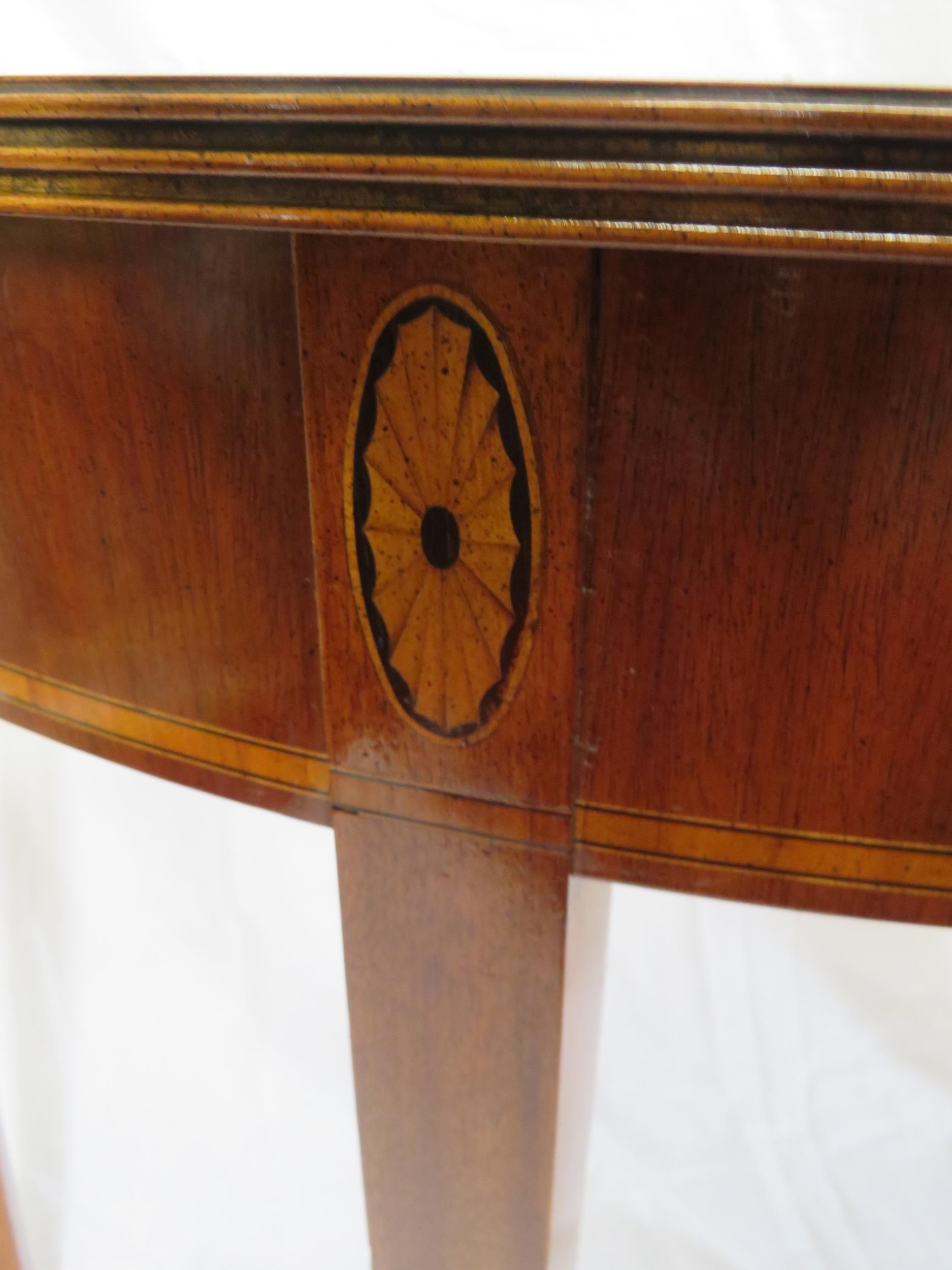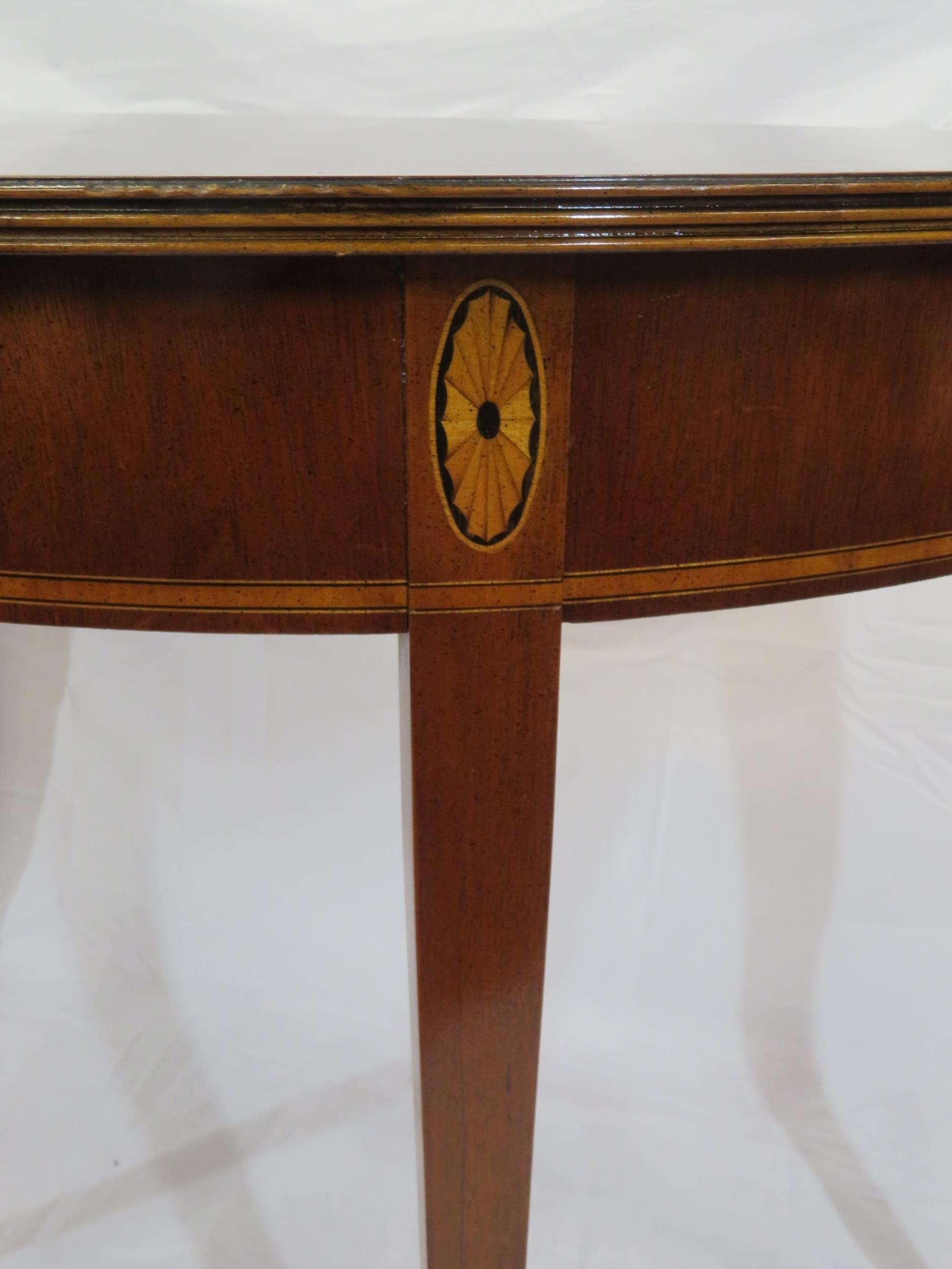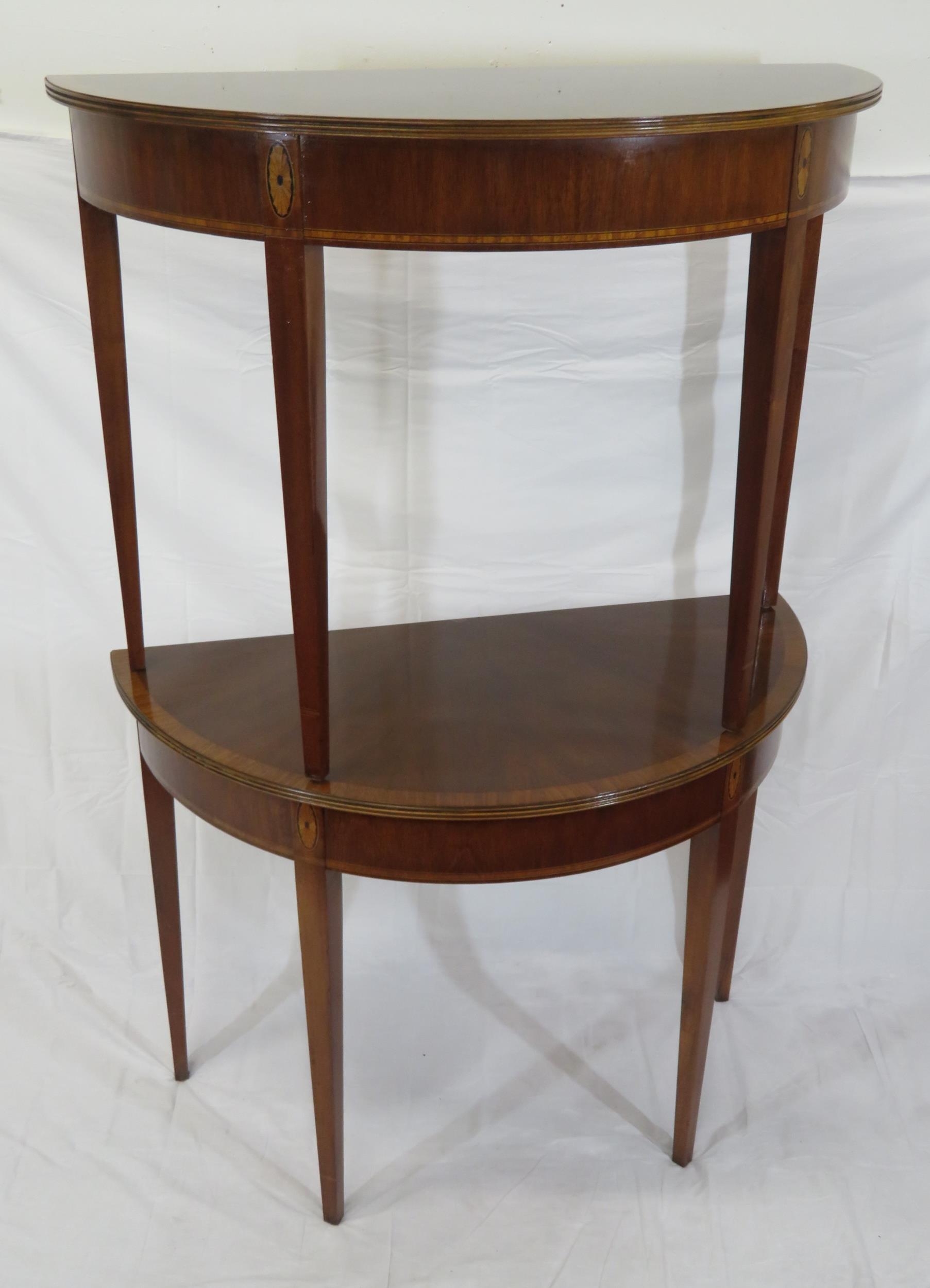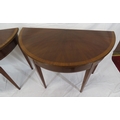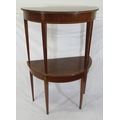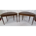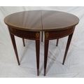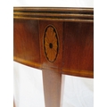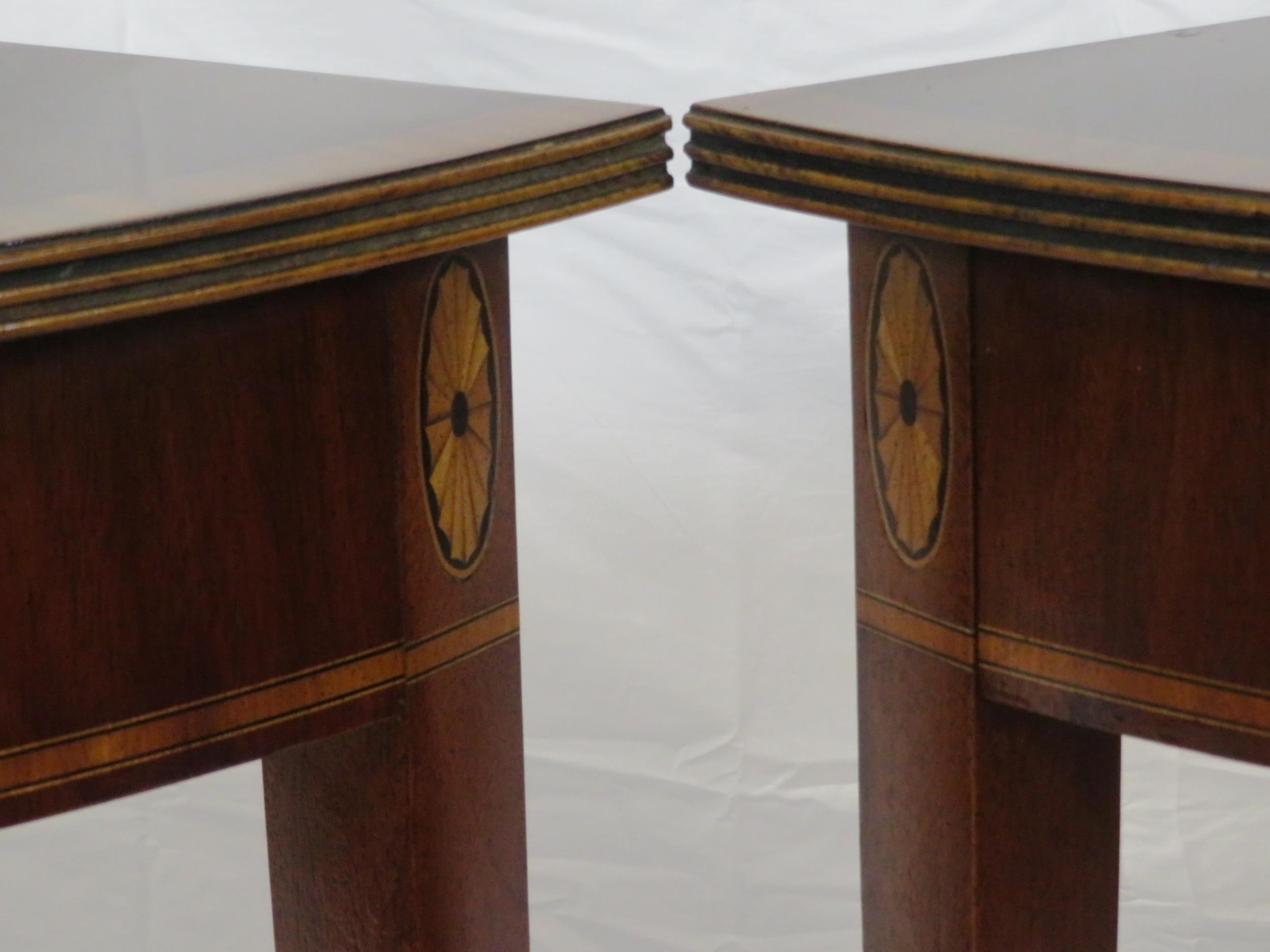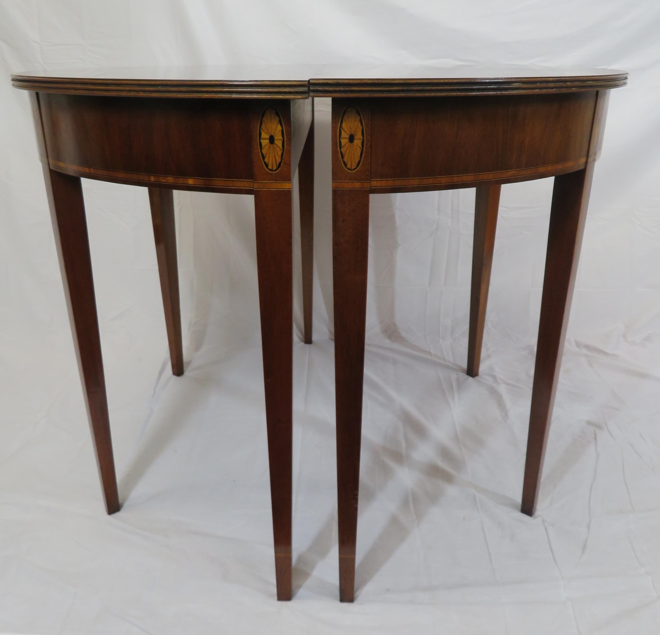 Pair of Edwardian style inlaid & crossbanded demi lune hall or side tables with reeded borders, oval shell panels, on square tapering legs