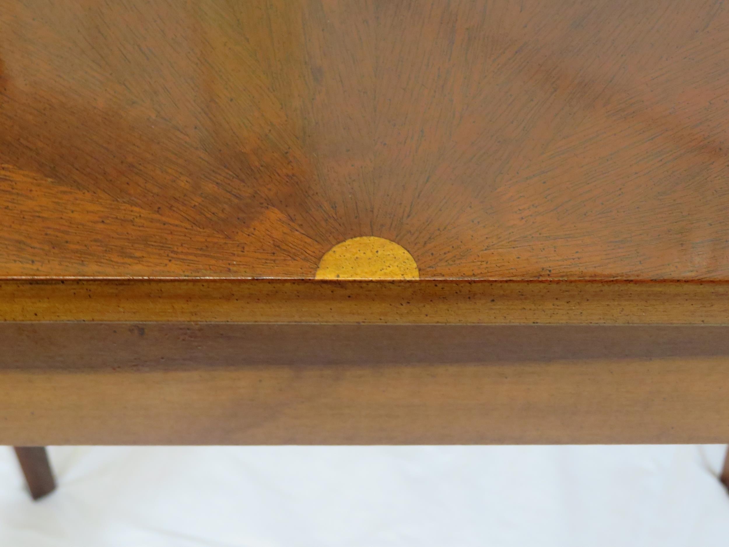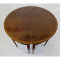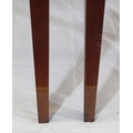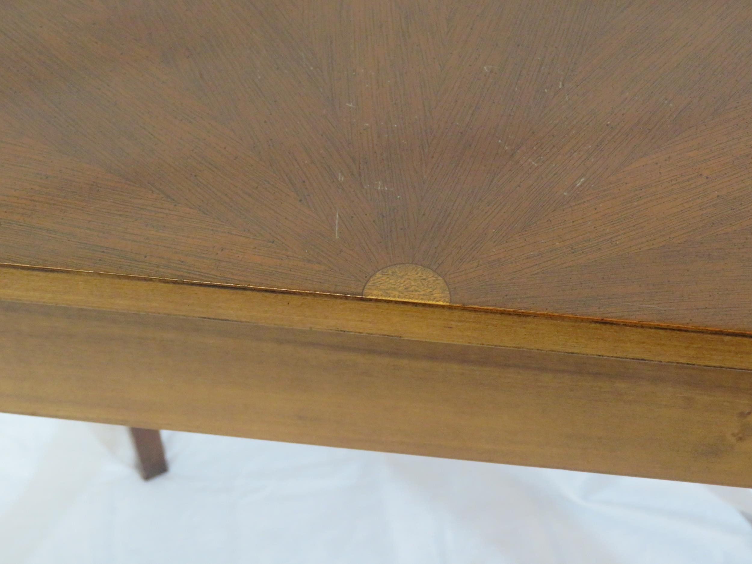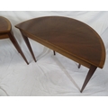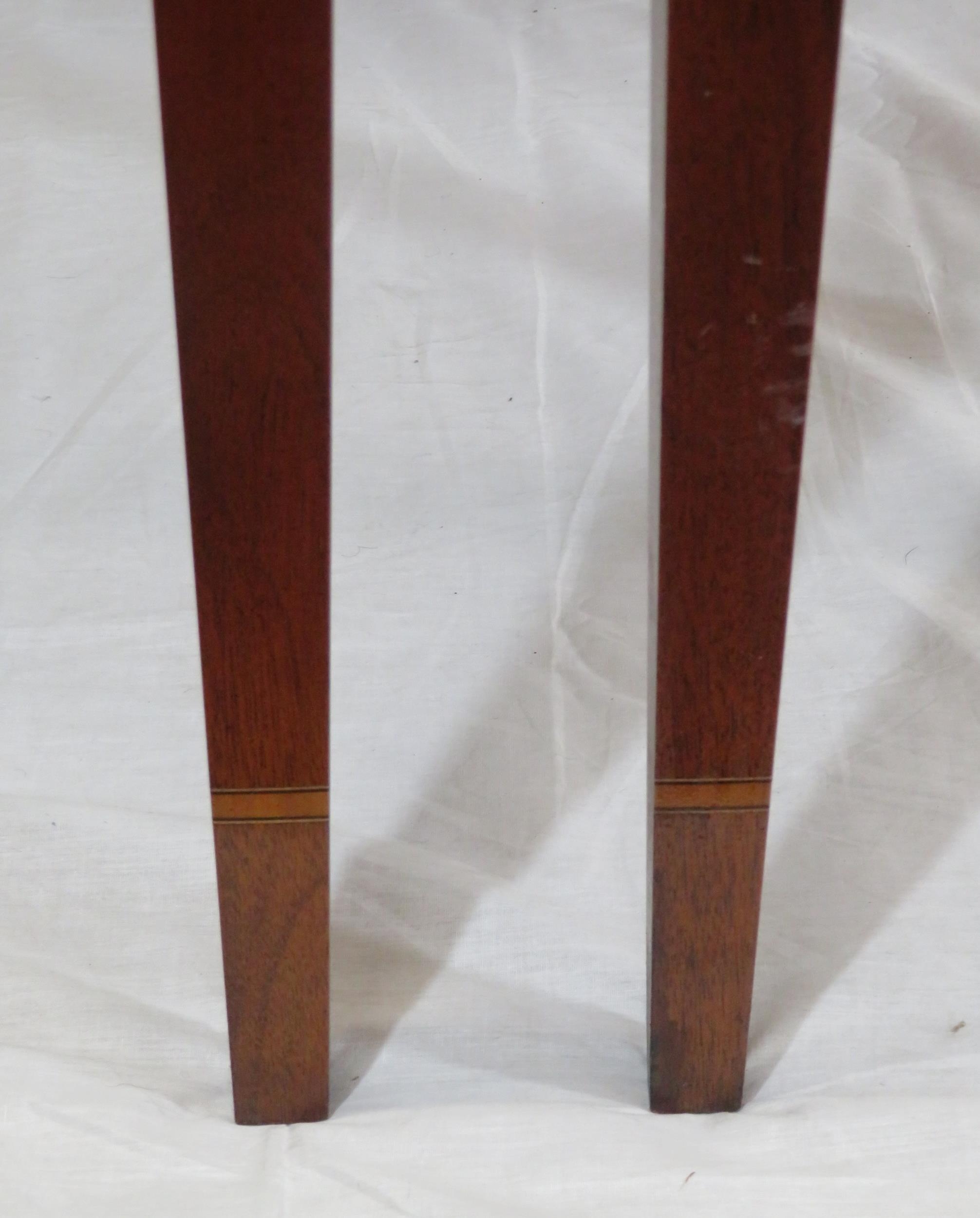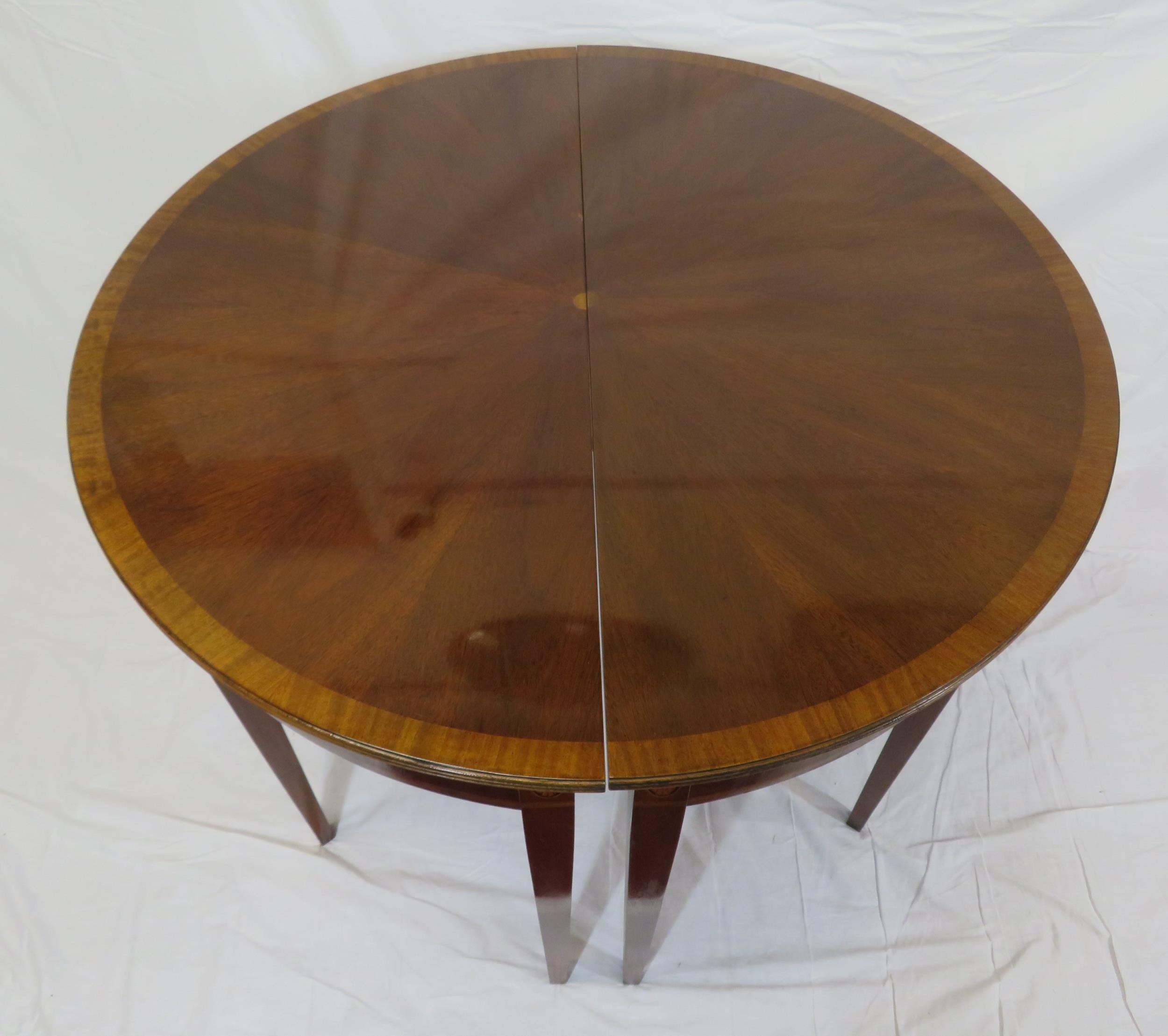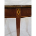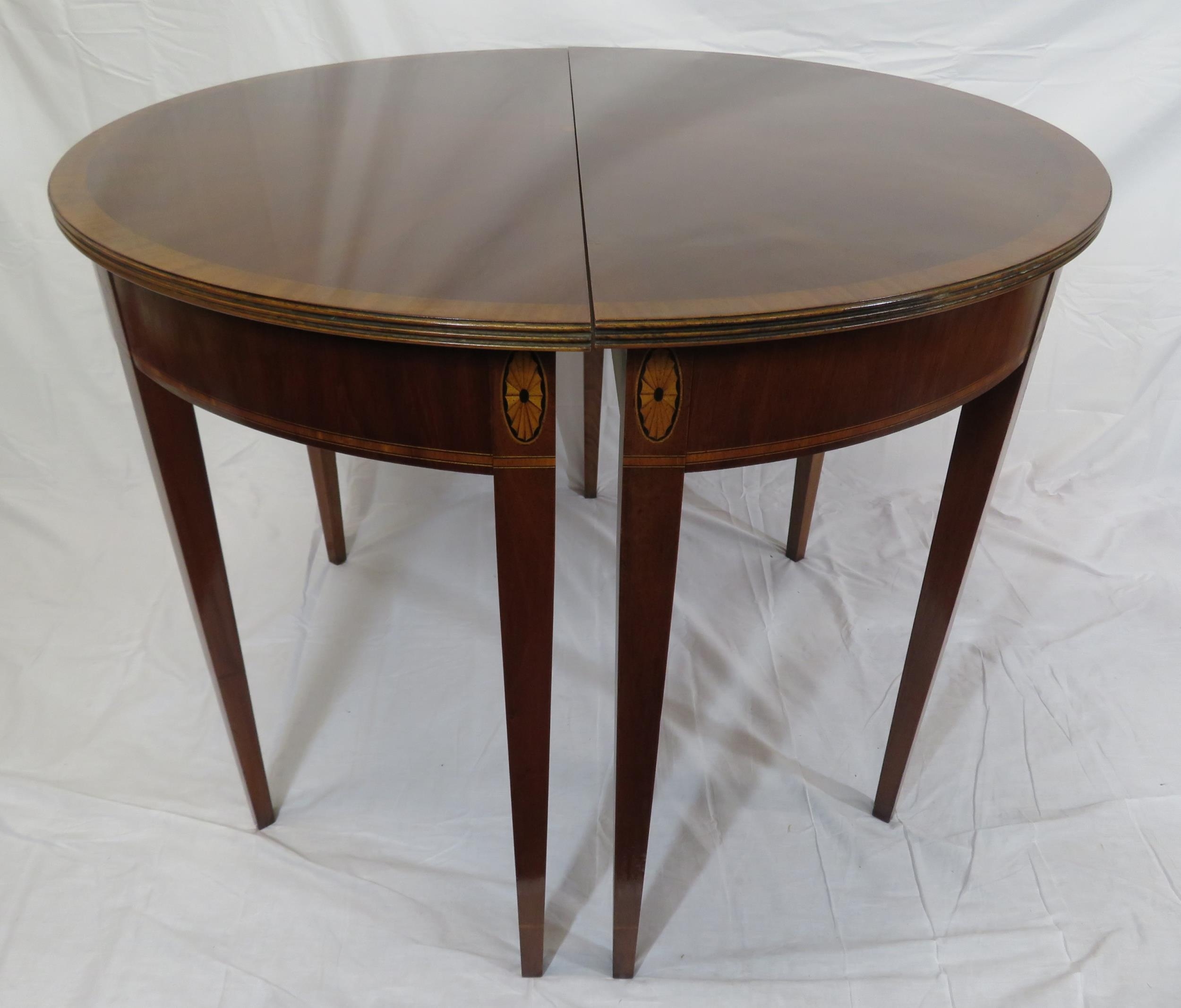 Pair of Edwardian style inlaid & crossbanded demi lune hall or side tables with reeded borders, oval shell panels, on square tapering legs