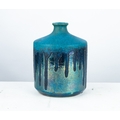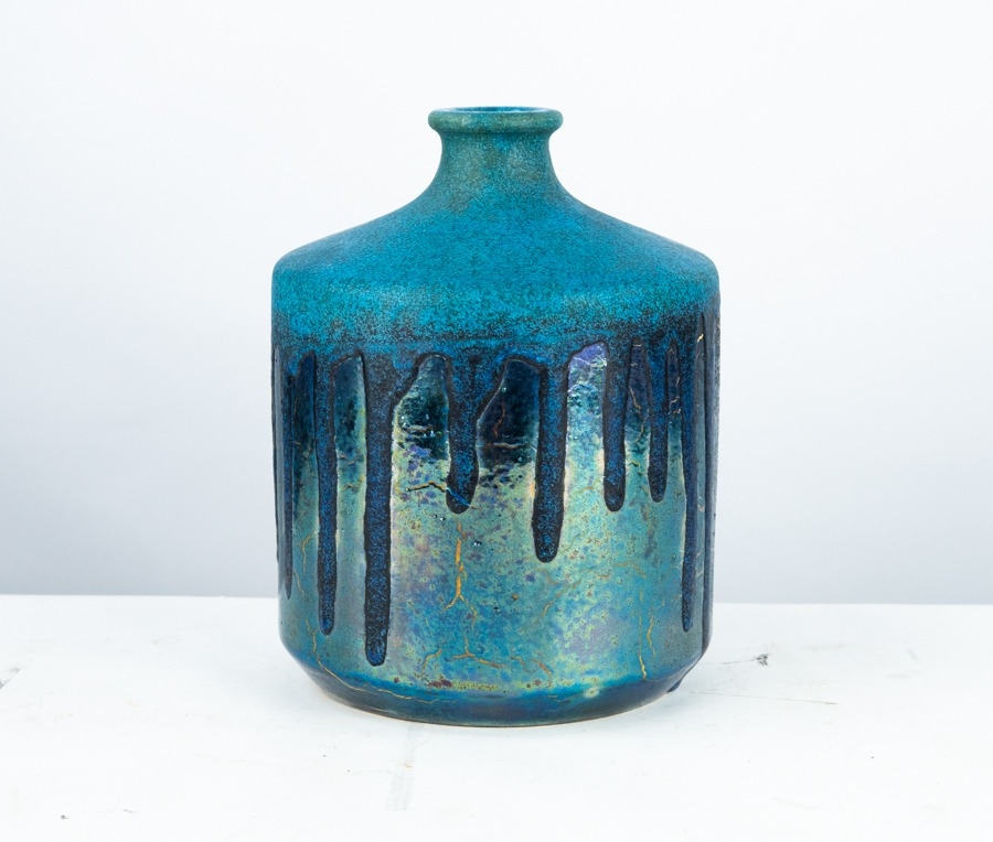 VINTAGE ITALIAN STUDIO POTTERY BROAD CYLINDRICAL VASE with narrow neck, decorated in a CRYSTALLINE BLUE GLAZE descending over a METALLIC BLUE LUSTRE with CRACKLED FINISH, painted script mark Faenza, Bottega, G Gaeta, 10" (25.5cm) high
