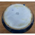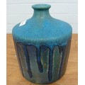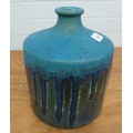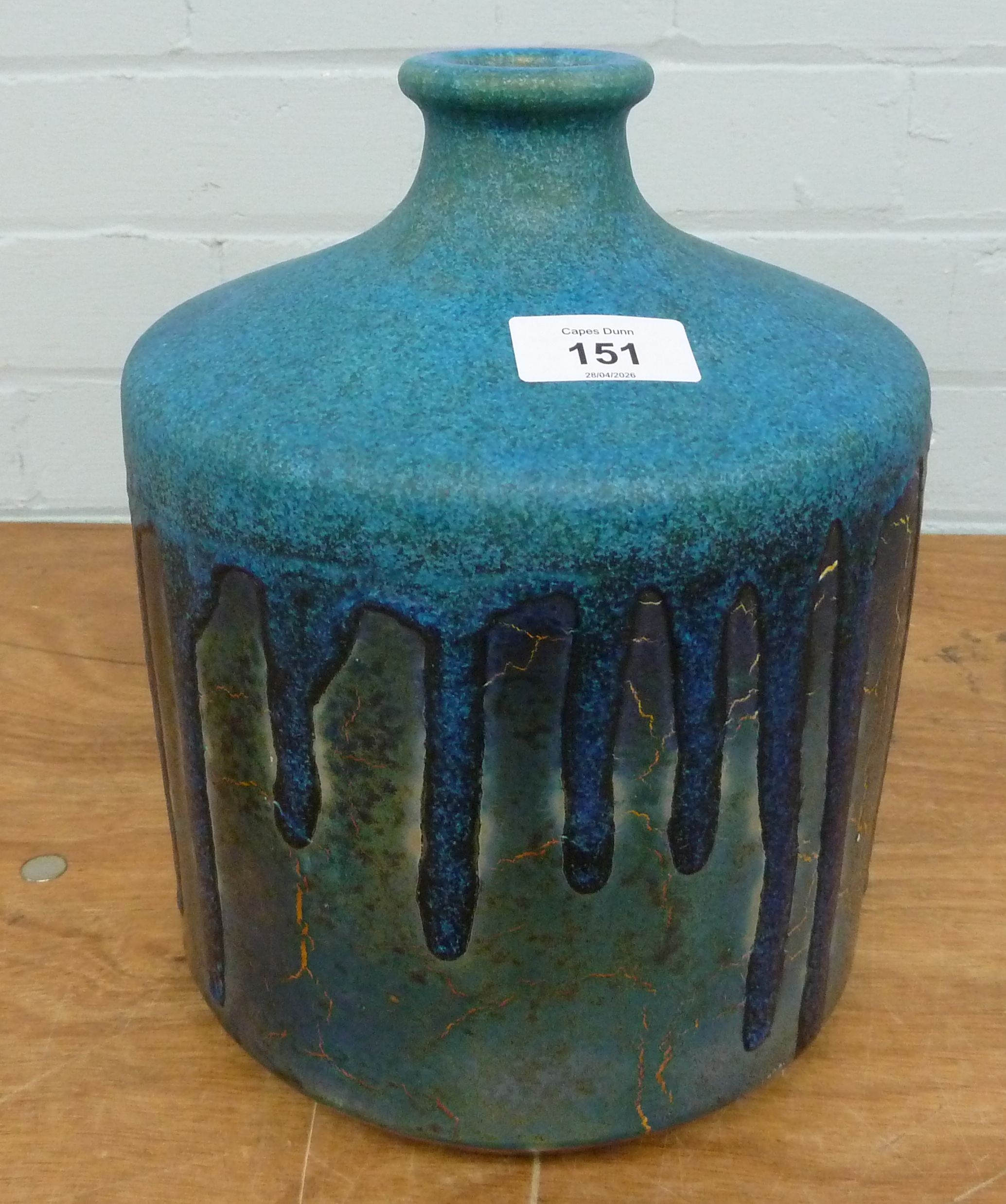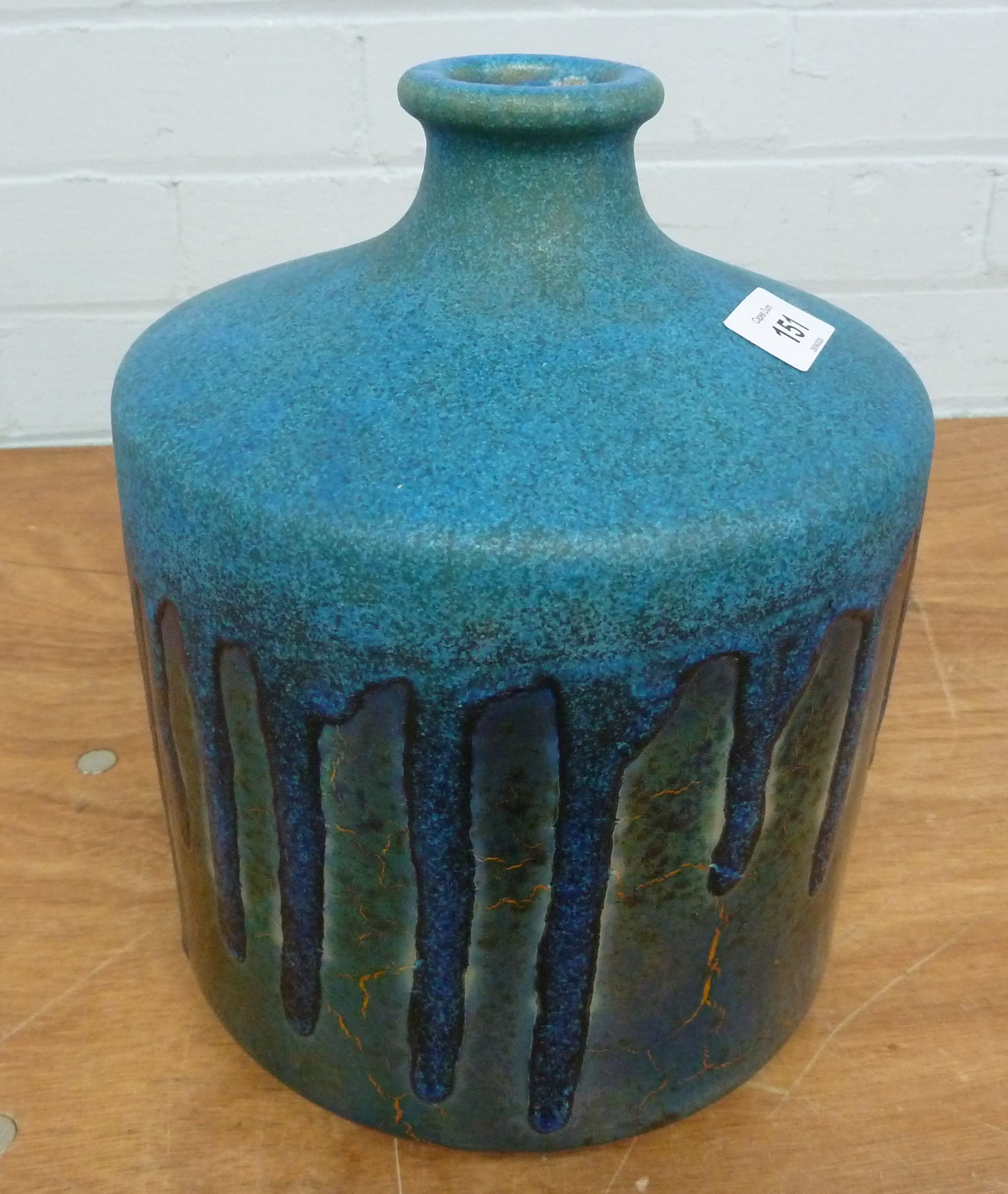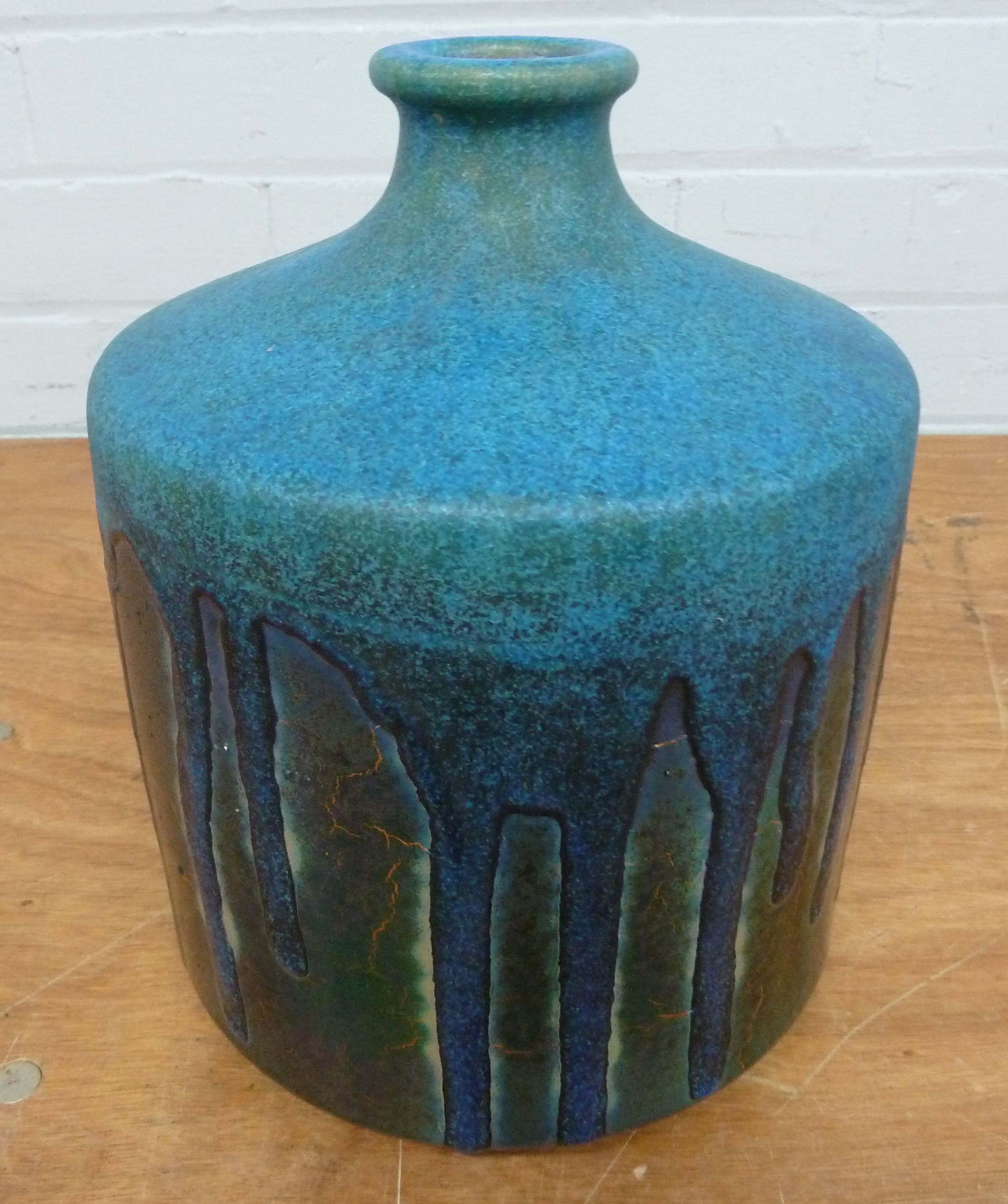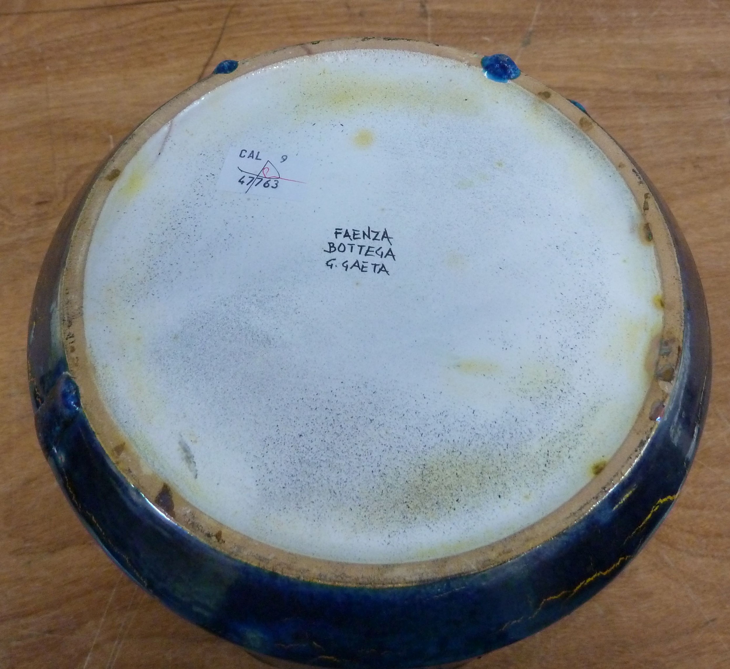 VINTAGE ITALIAN STUDIO POTTERY BROAD CYLINDRICAL VASE with narrow neck, decorated in a CRYSTALLINE BLUE GLAZE descending over a METALLIC BLUE LUSTRE with CRACKLED FINISH, painted script mark Faenza, Bottega, G Gaeta, 10" (25.5cm) high