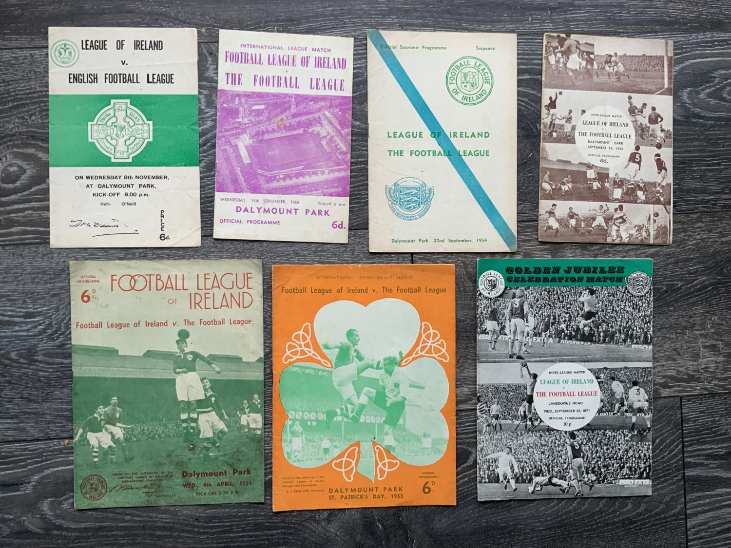 League Of Ireland v Football League Programmes: Matches played at Dalymount Park in 51, 53, 54, 56 with Duncan Edwards playing, 60, 67 and 71 at Landsdowne Road. Good. (7)