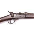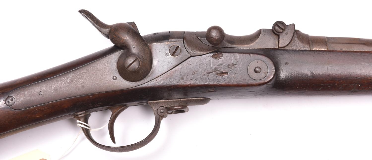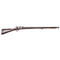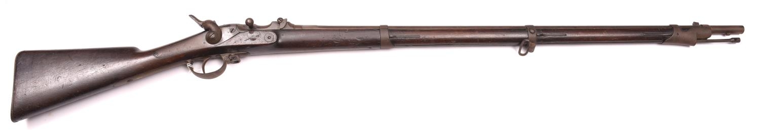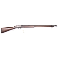 A Belgian 11mm centre fire Albini Braendlin breech loading military rifle, 53½” overall, barrel 43½” with hinge up breech block, the breech dated 1868; with plain back action lock, walnut fullstock with indistinct store keeper’s mark on the butt, steel mounts including sling swivels, and correct cleaning rod. GWO & generally GC (hammer striker link and rear sight missing, stock partly fractured at breech, dark patina to metalwork with surface rust overall and some pitting) £300-400
