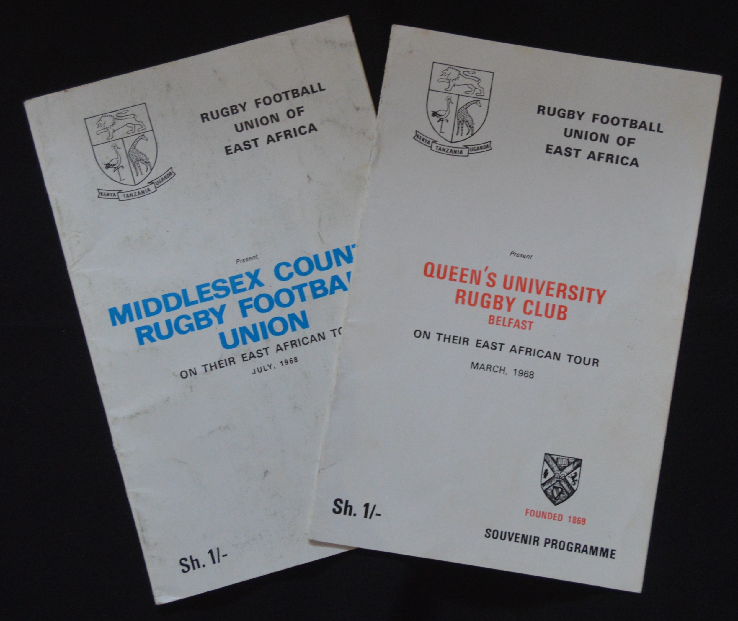1968 E Africa v Tourists Rugby Programmes (2): v Queens University Belfast and v Middlesex County, both in 1968. G/VG