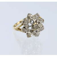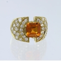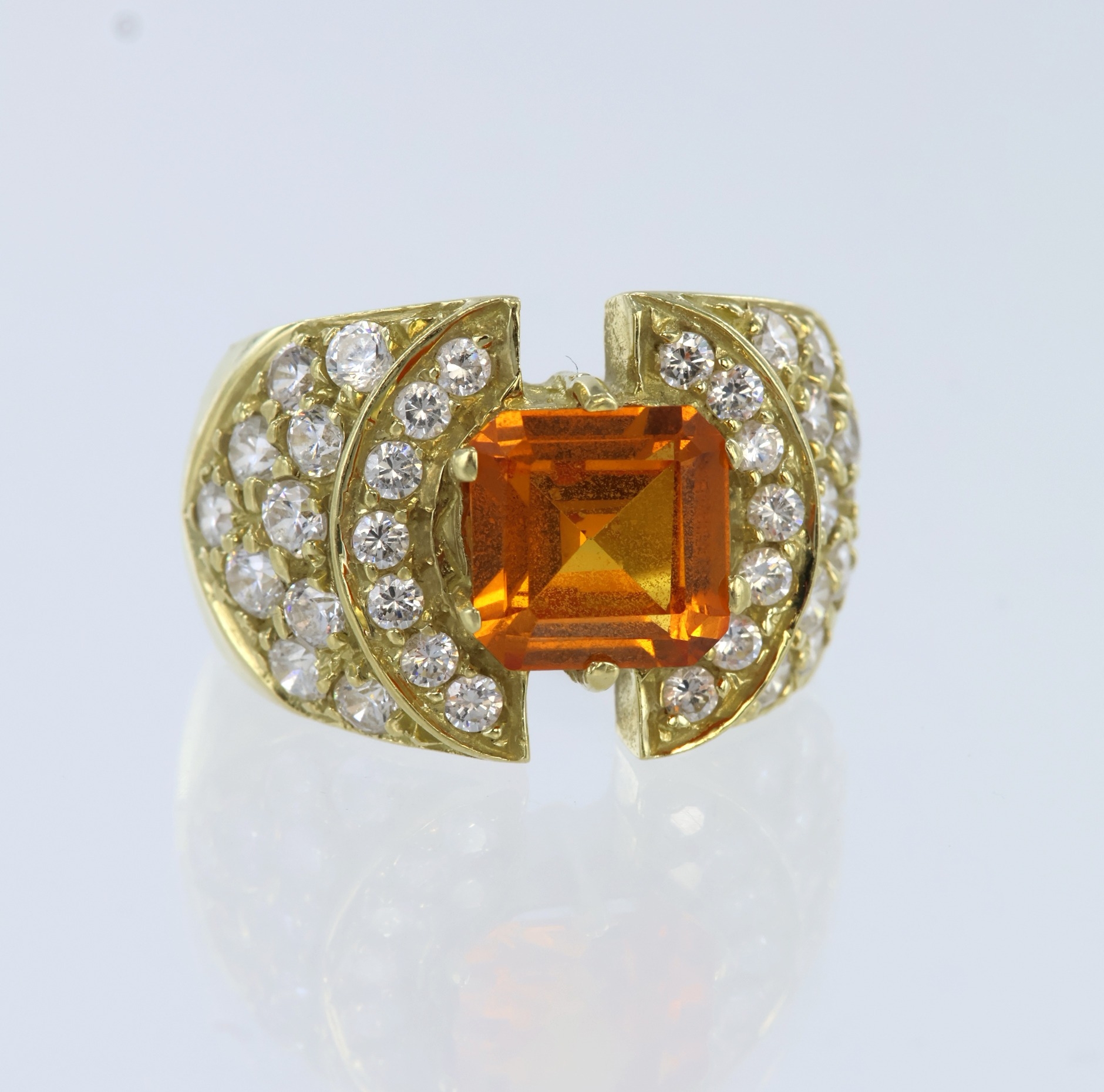 Yellow metal (tests 18ct) dress ring set with yellow and white paste, centre step cut 8mm x 8mm, finger size L, weight 9.9g