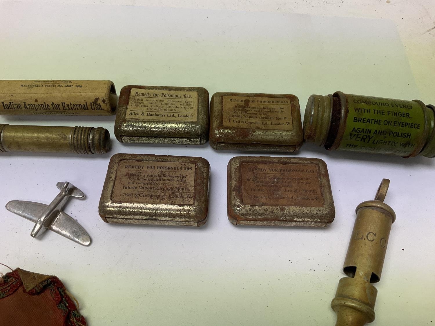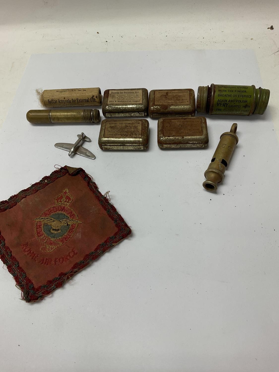 A collection of small military items including medical supplies and a Royal Air Force arm patch.
