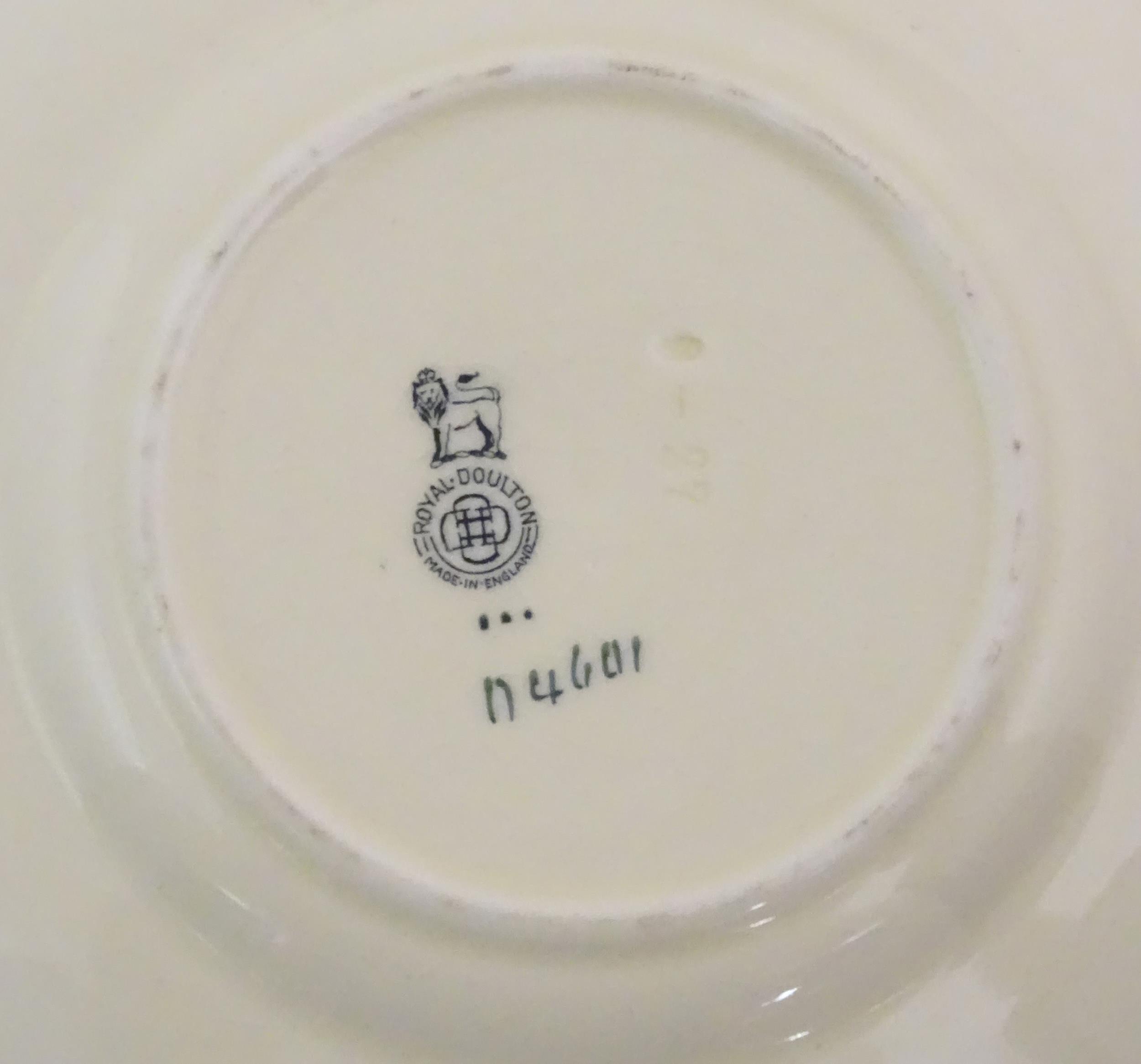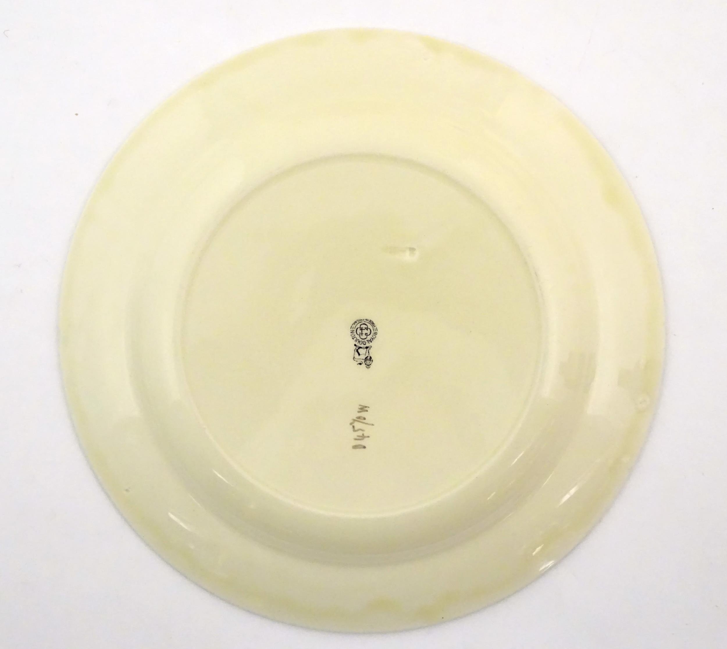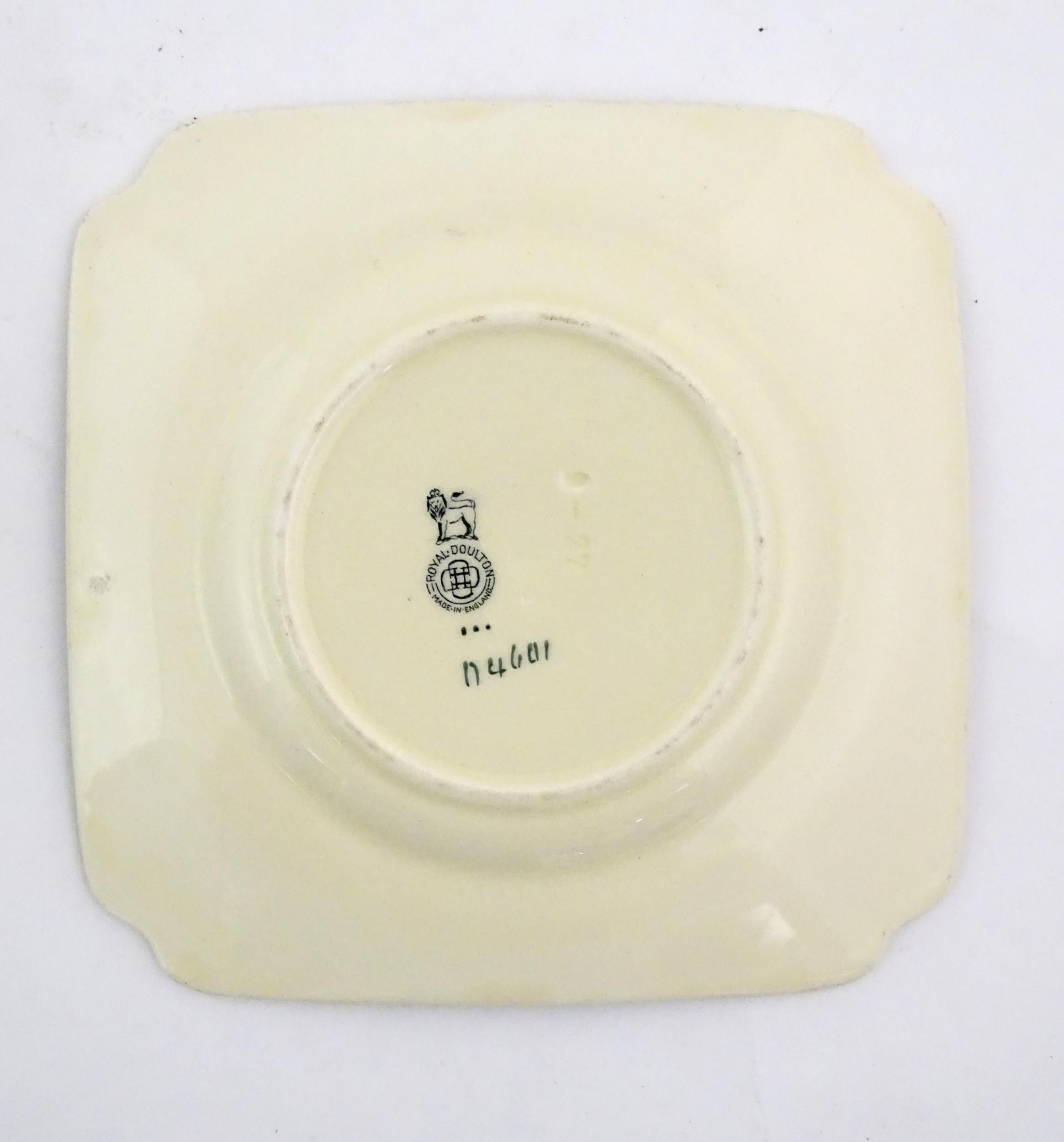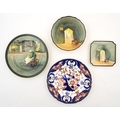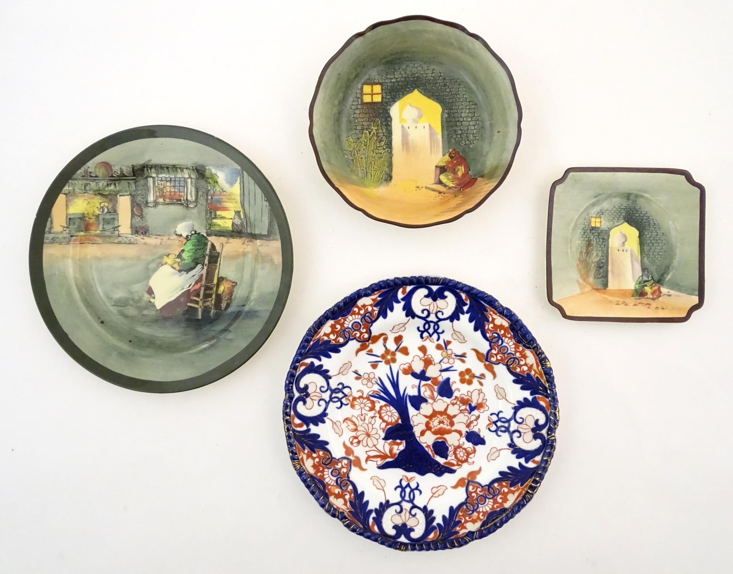 Two Royal Doulton wares in the pattern Arabian Nights, comprising bowl and squared plate with relief cactus detail; and a Royal Doulton seriesware plate in the pattern Fireside. Together with a Royal Crown Derby plate decorated in the Imari palette with flowers and foliage. Royal Crown Derby plate approx. 10 1/4" diameter (4)