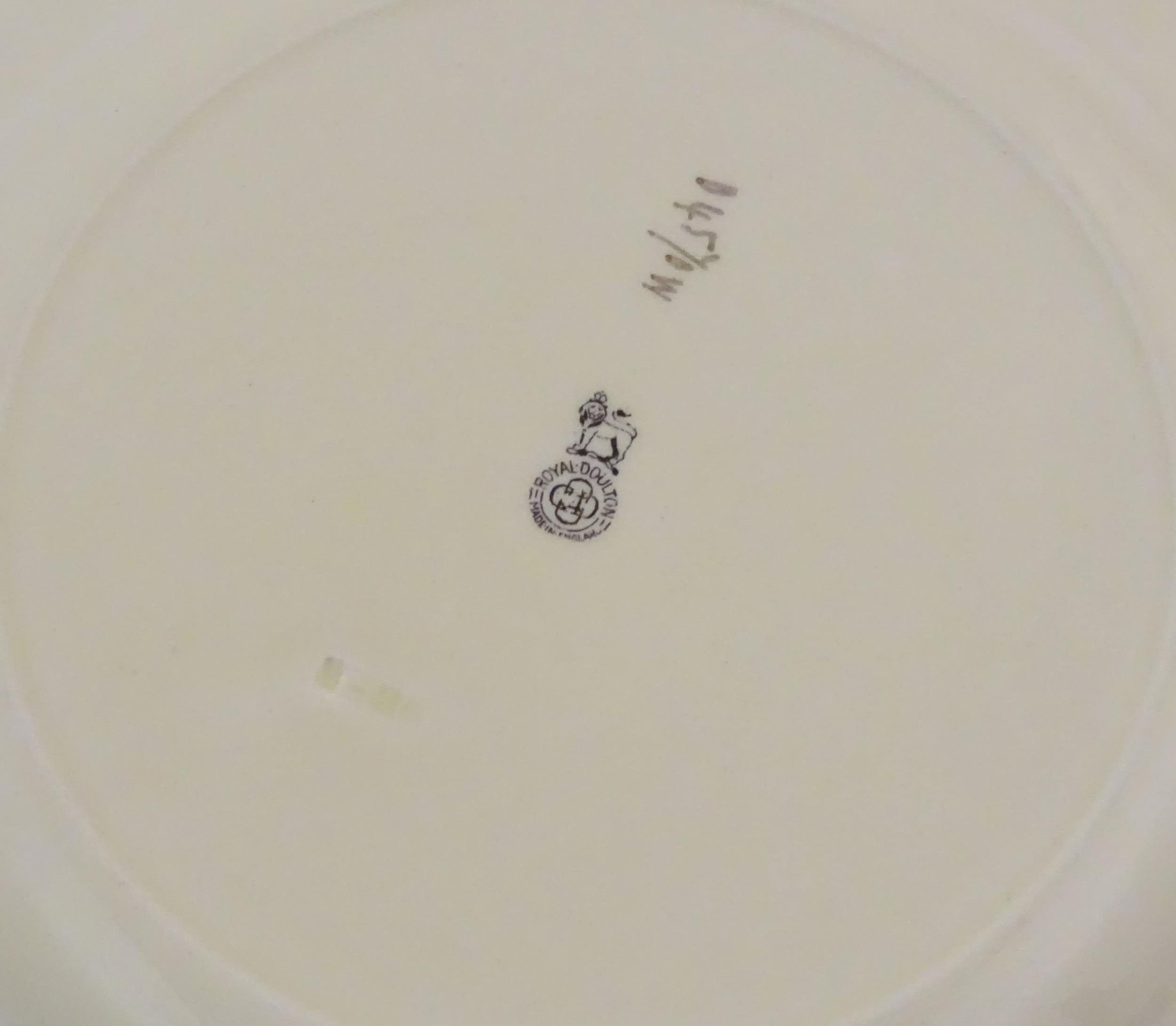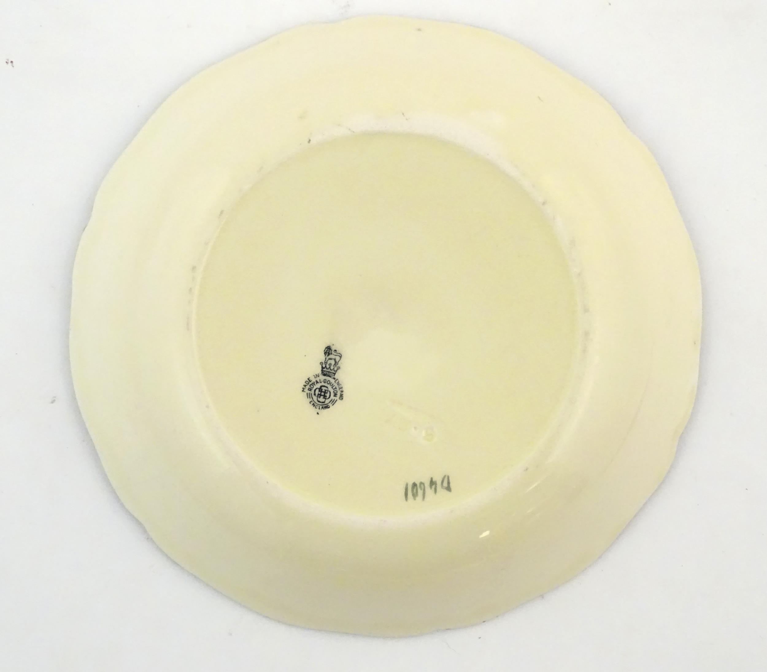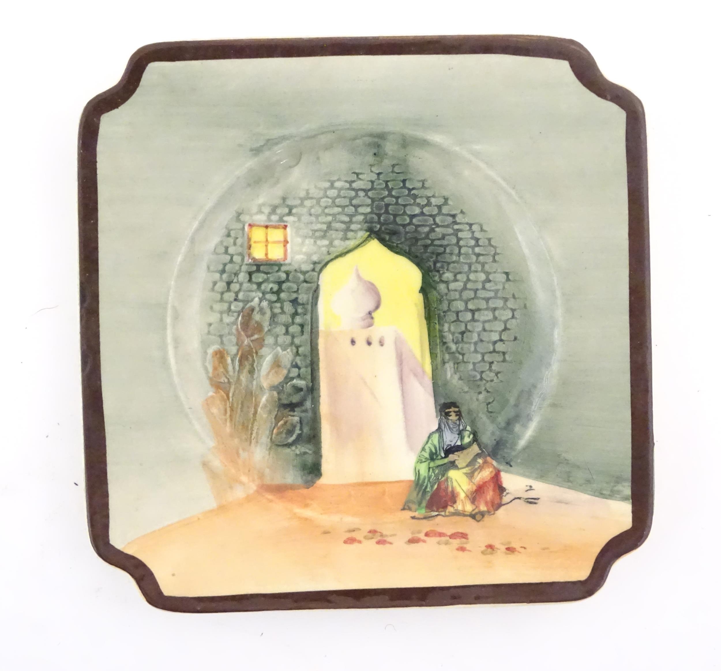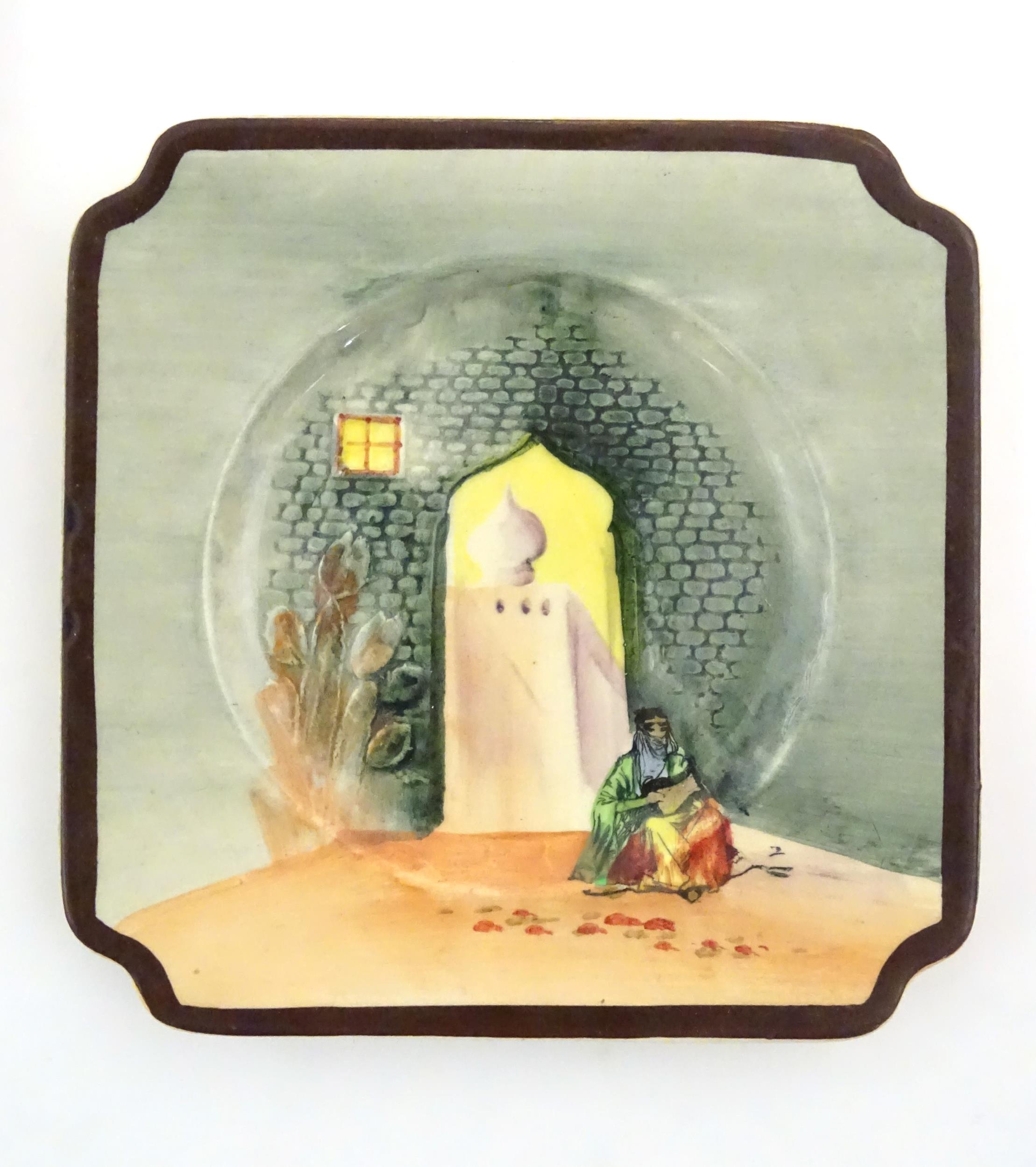 Two Royal Doulton wares in the pattern Arabian Nights, comprising bowl and squared plate with relief cactus detail; and a Royal Doulton seriesware plate in the pattern Fireside. Together with a Royal Crown Derby plate decorated in the Imari palette with flowers and foliage. Royal Crown Derby plate approx. 10 1/4" diameter (4)