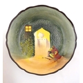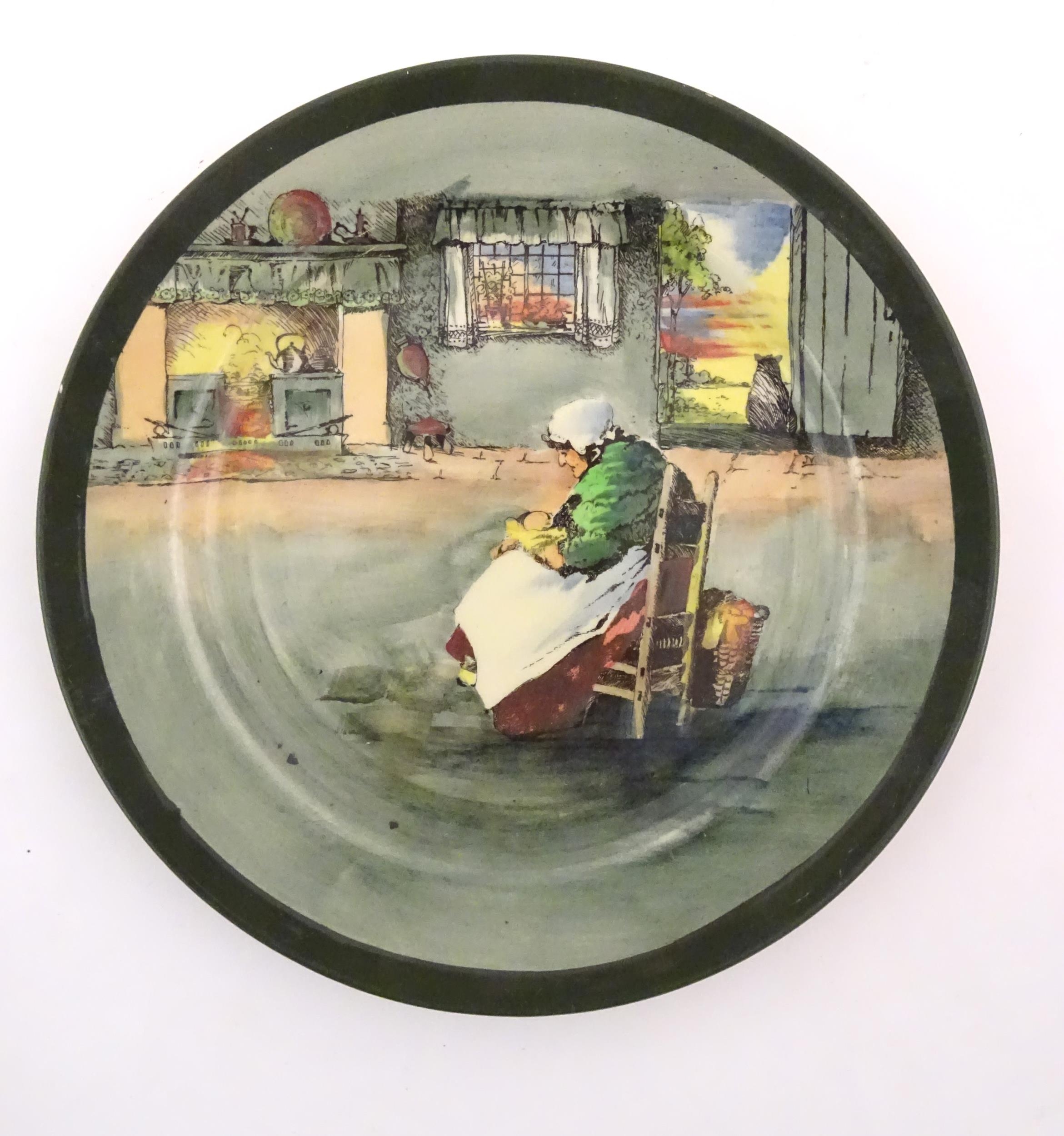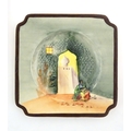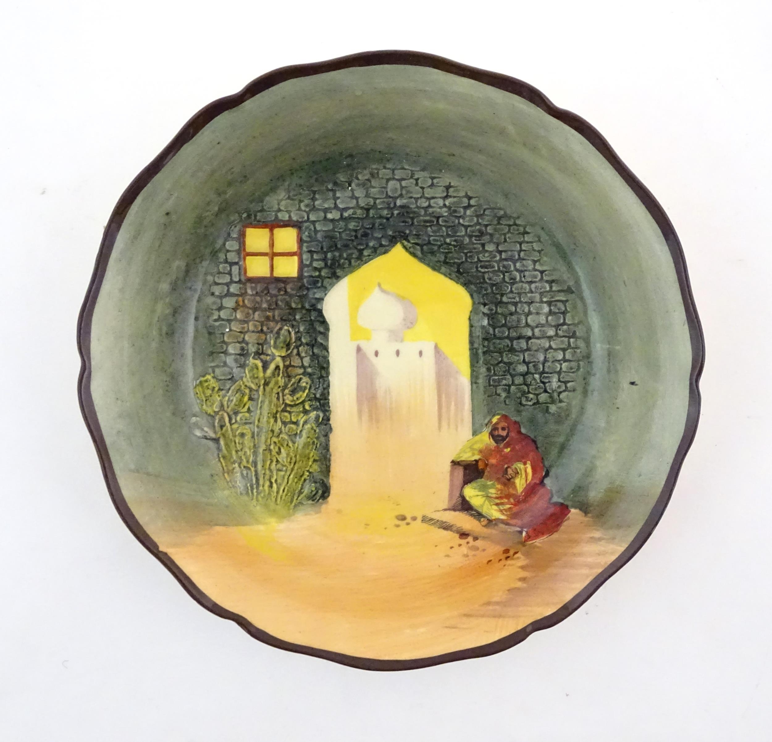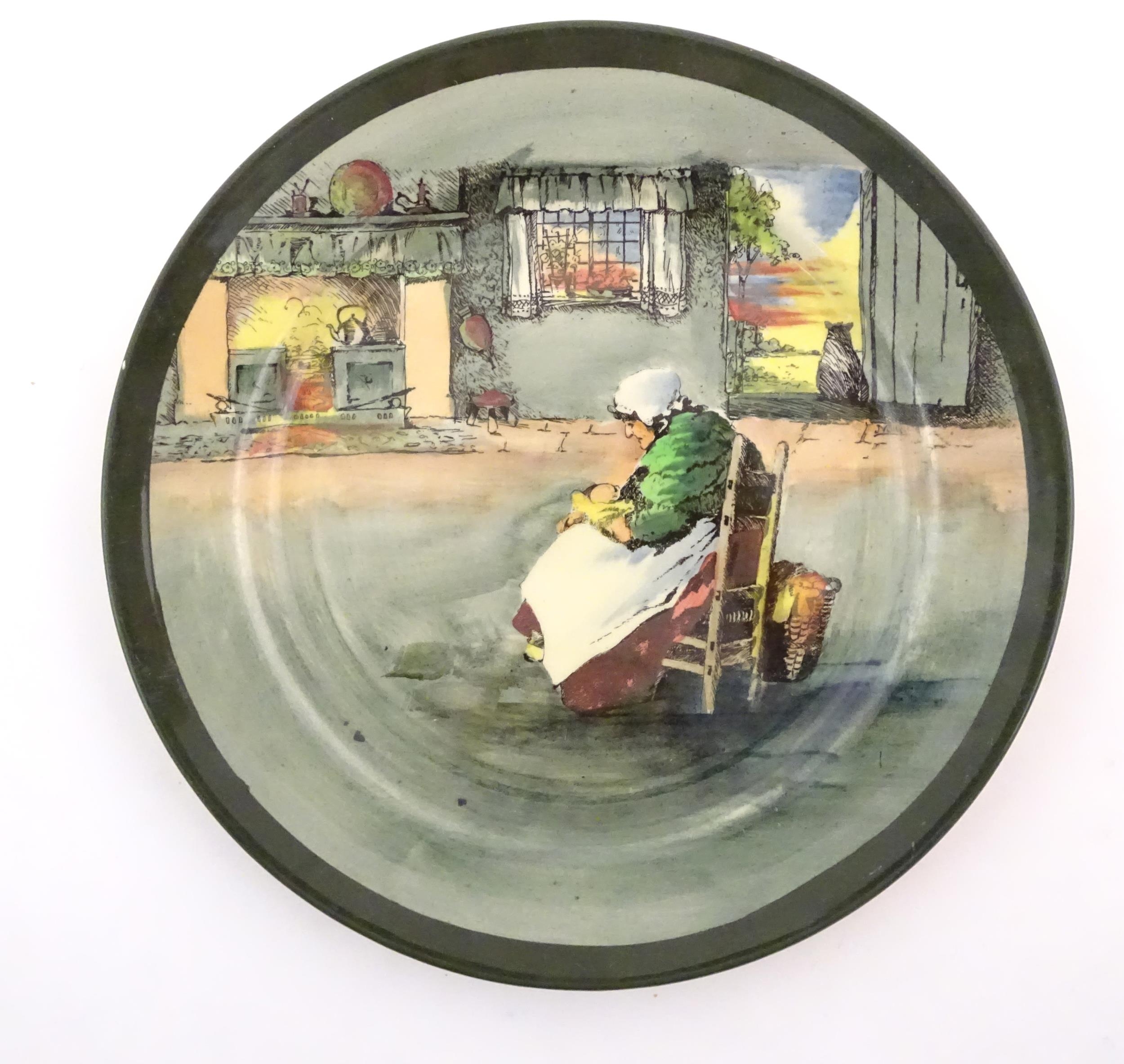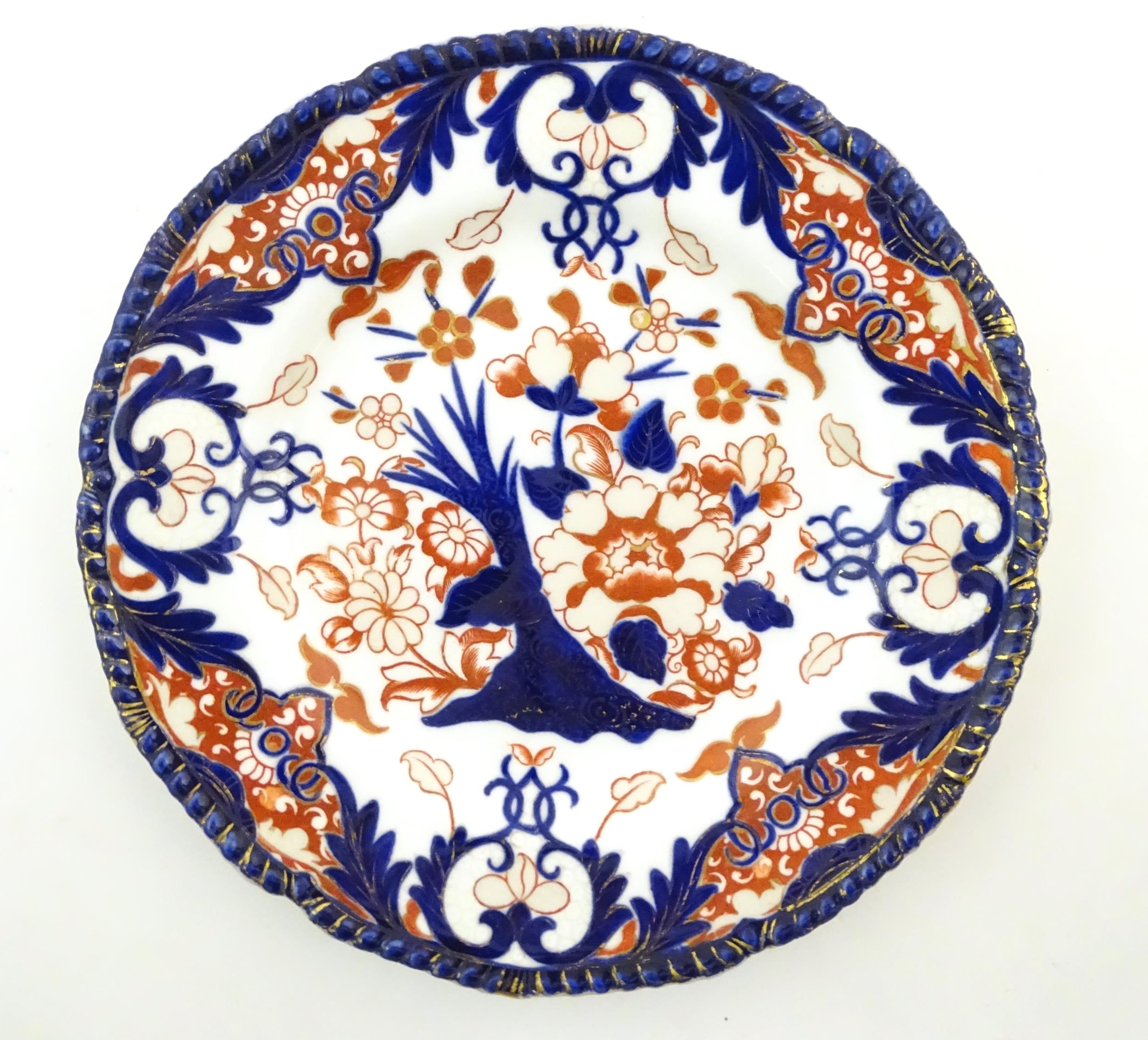 Two Royal Doulton wares in the pattern Arabian Nights, comprising bowl and squared plate with relief cactus detail; and a Royal Doulton seriesware plate in the pattern Fireside. Together with a Royal Crown Derby plate decorated in the Imari palette with flowers and foliage. Royal Crown Derby plate approx. 10 1/4" diameter (4)