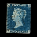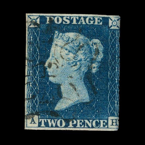 Great Britain - QV (line engraved) : (SG 5f) 1840 2d blue, plate 1, AH, 3 small margins, with light but distinct NUMBER 12 IN CROSS pmk, fine used. RARE. Cat £18000 (image available) [US1]