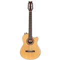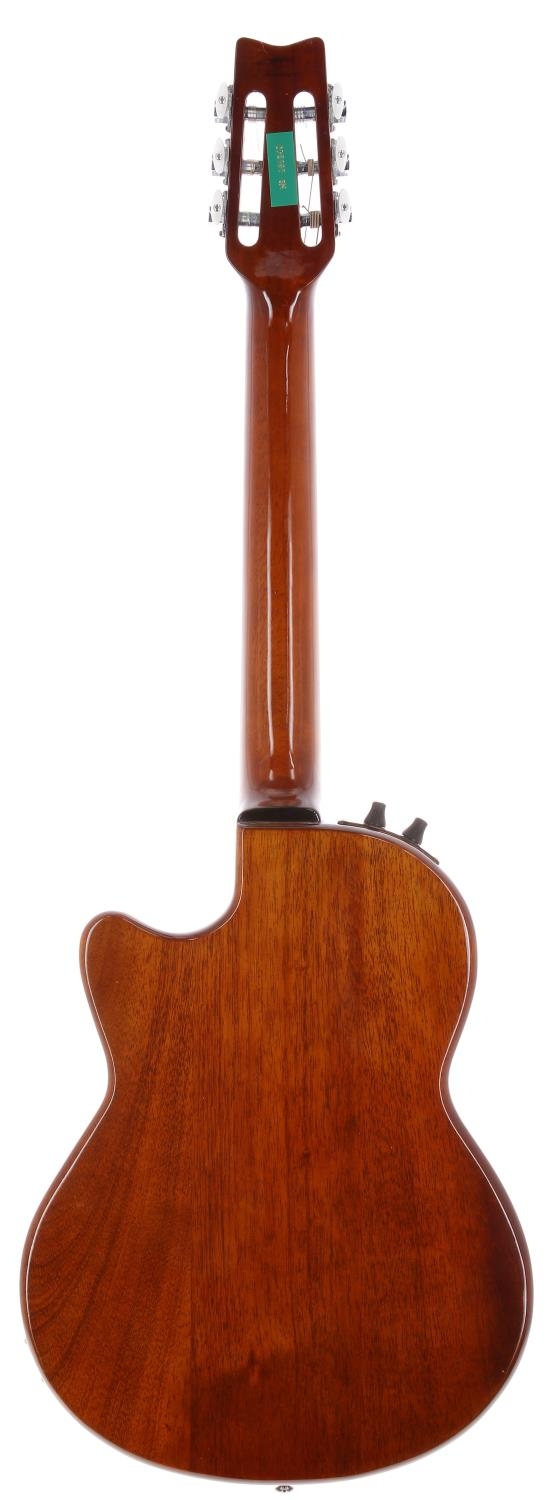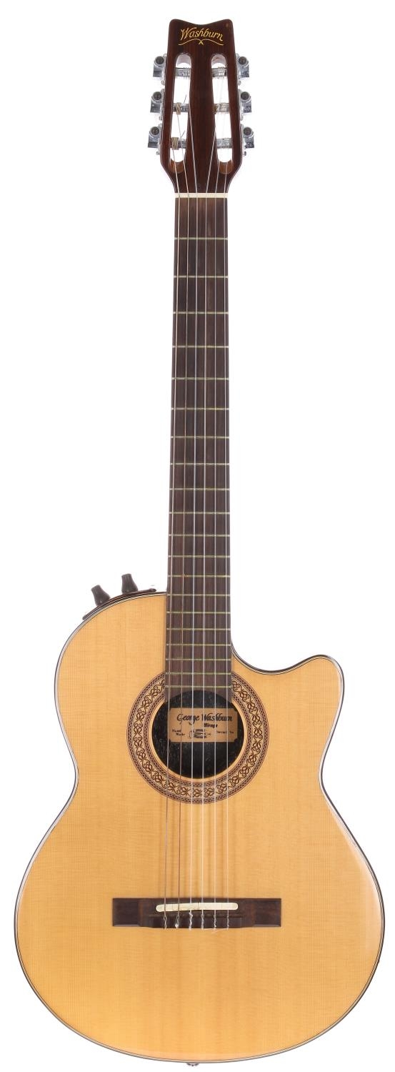 1980s Washburn Mirage electro-acoustic hybrid guitar, made in Korea; Body: natural spruce top on mahogany back, a few light surface marks; Neck: mahogany, good; Fretboard: rosewood; Frets: good, light tarnishing; Electrics: working; Hardware: good; Case: original hard case; Weight: 2.58kg; Overall condition: very good