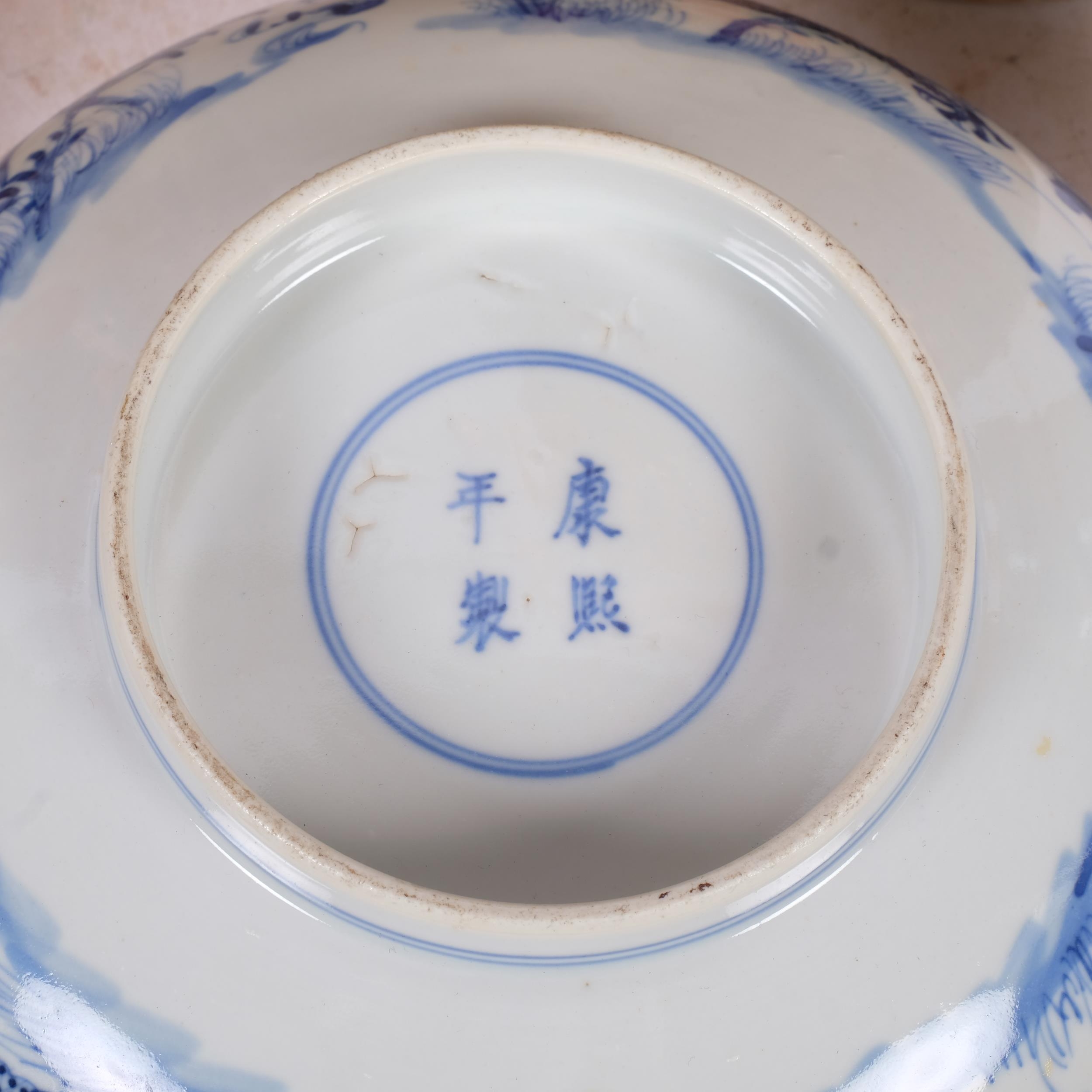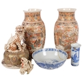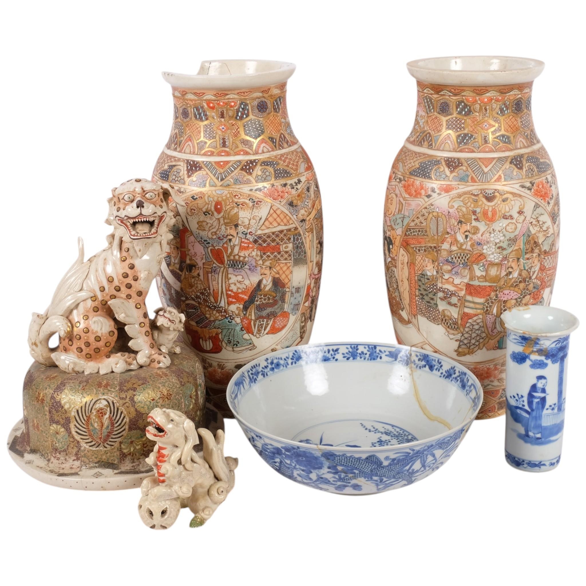 A pair of 20th century Satsuma vases, 1 A/F, a Chinese blue and white bowl (A/F), a cylindrical vase, a blue and white ginger jar and cover, a Satsuma vase lid, and a dog of fo knop