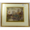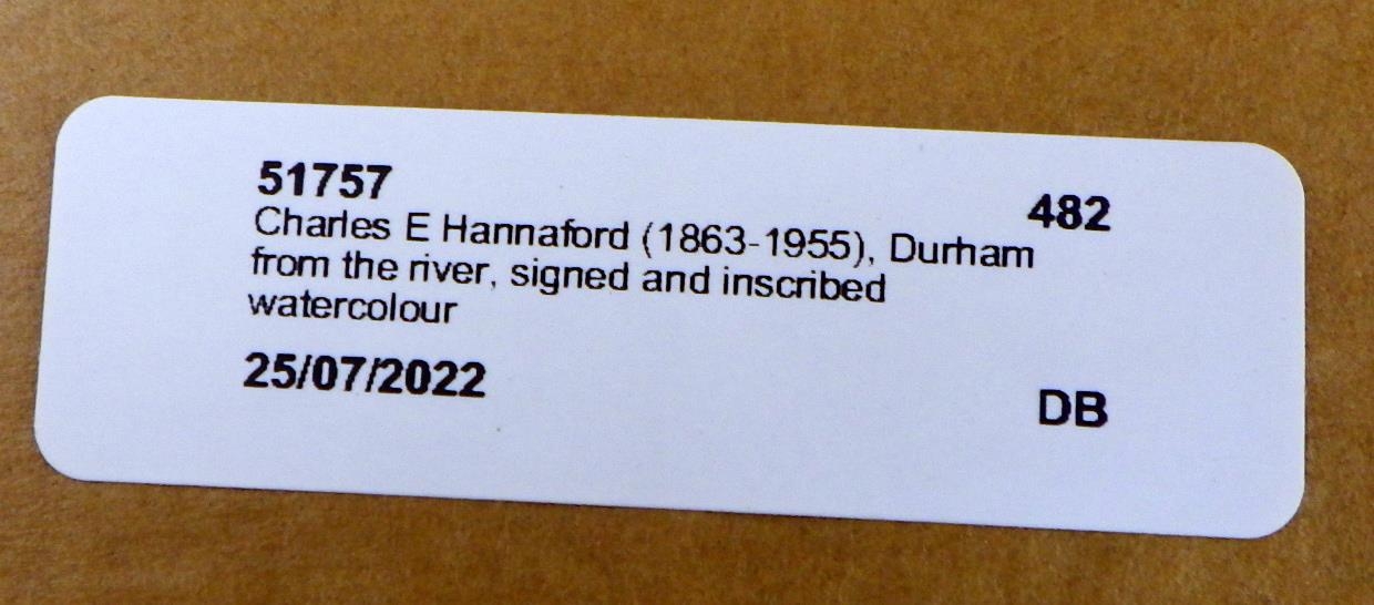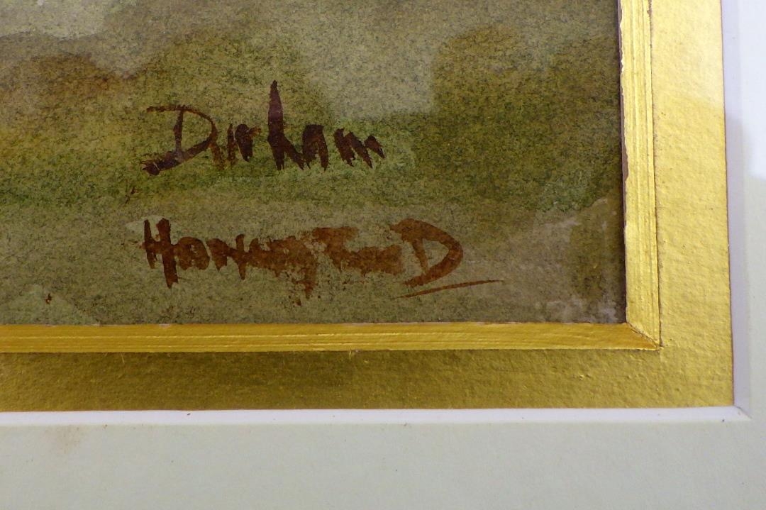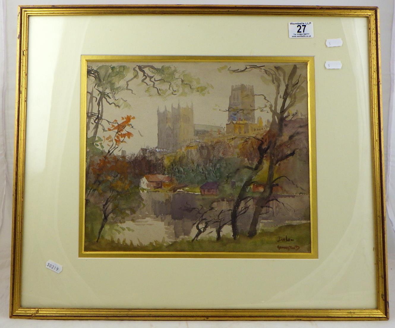 A watercolour of Durham signed Hannaford 36 x 48cm, crack to frame