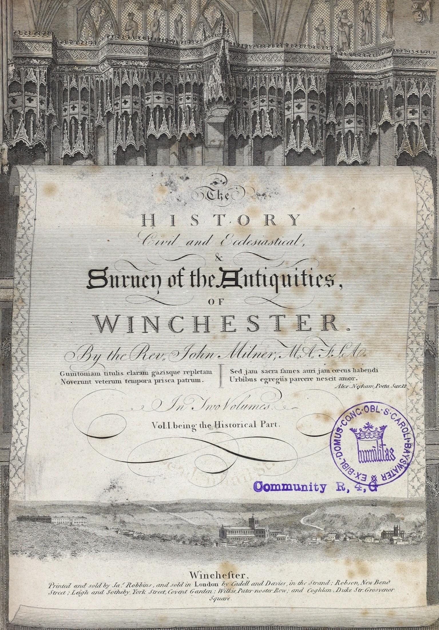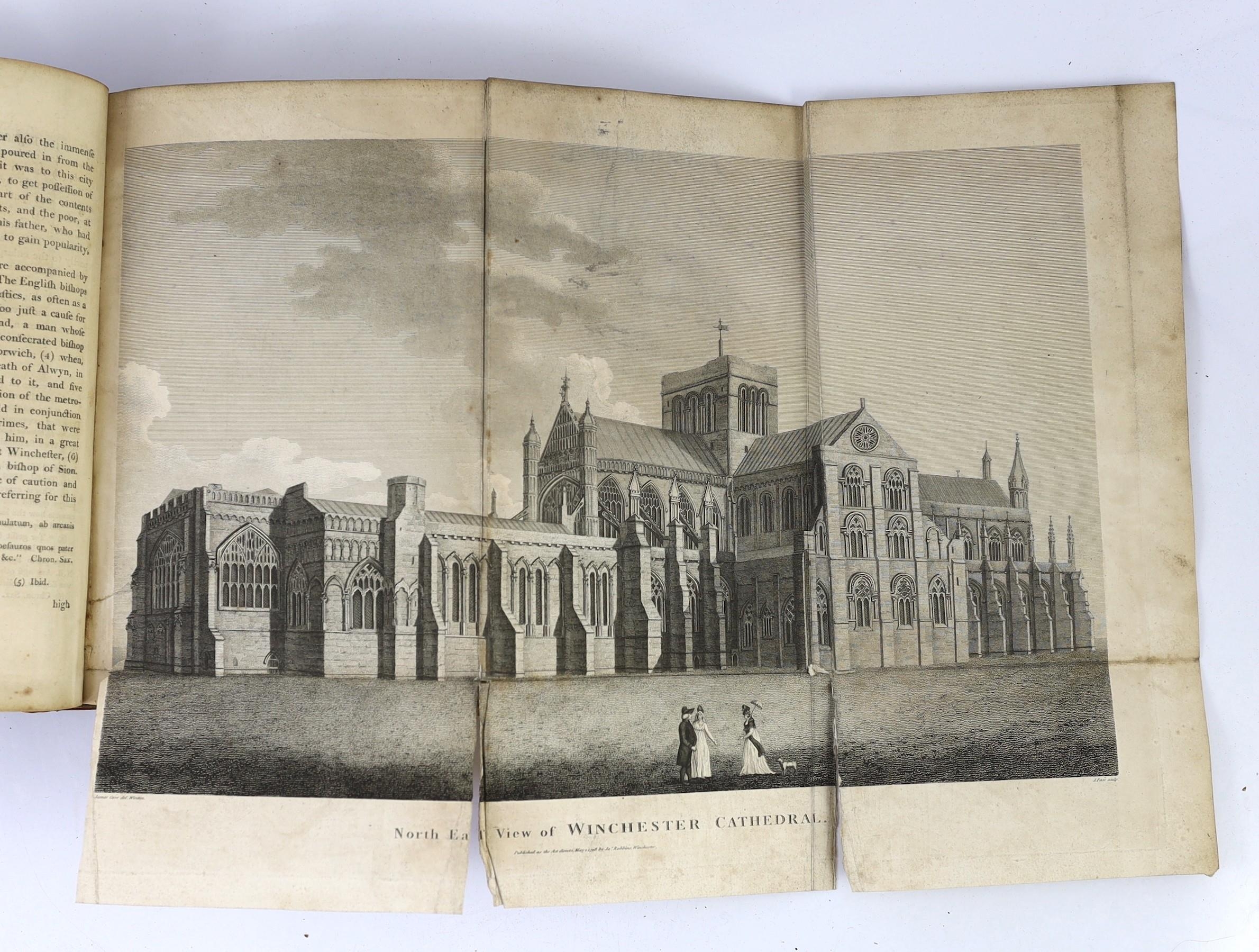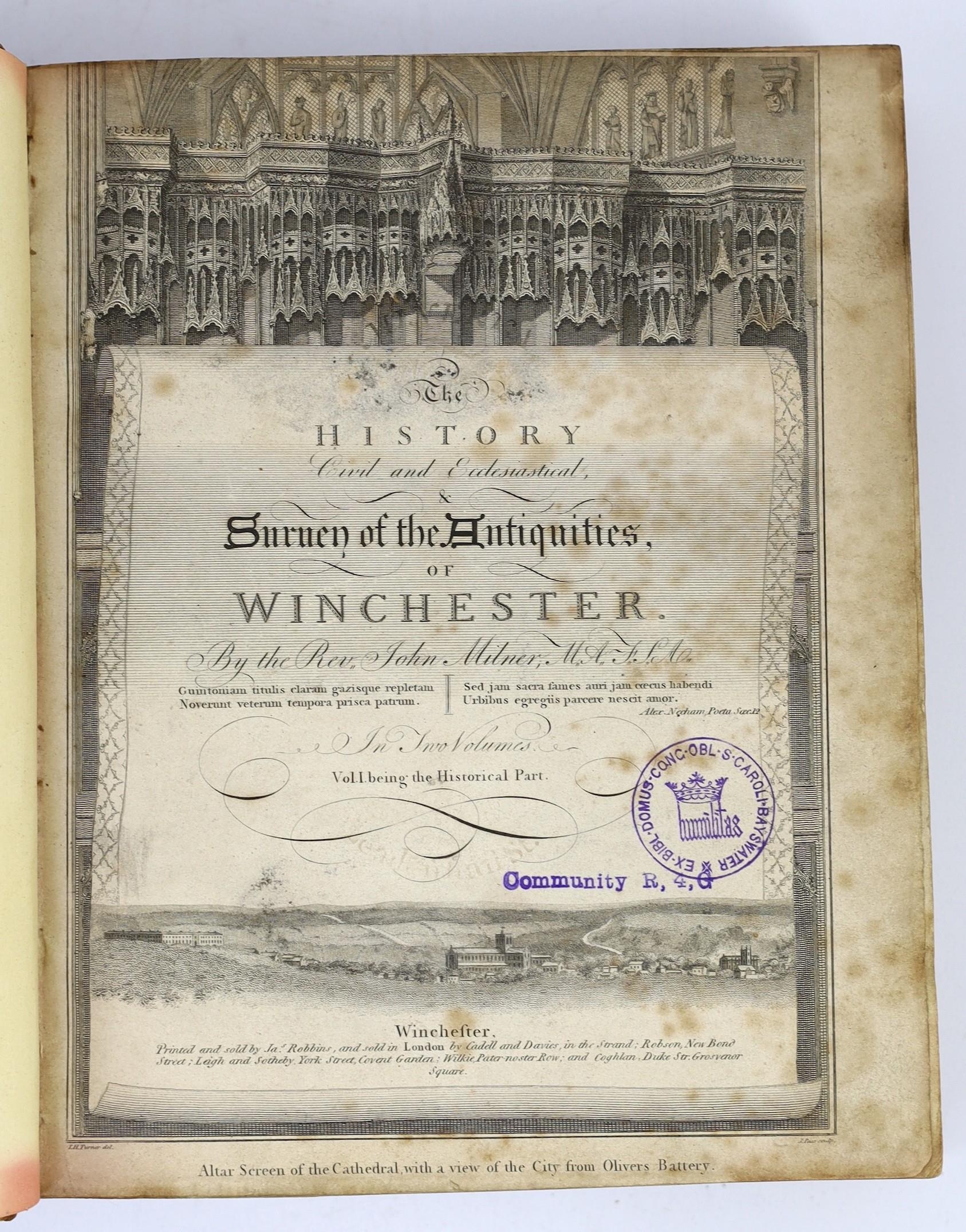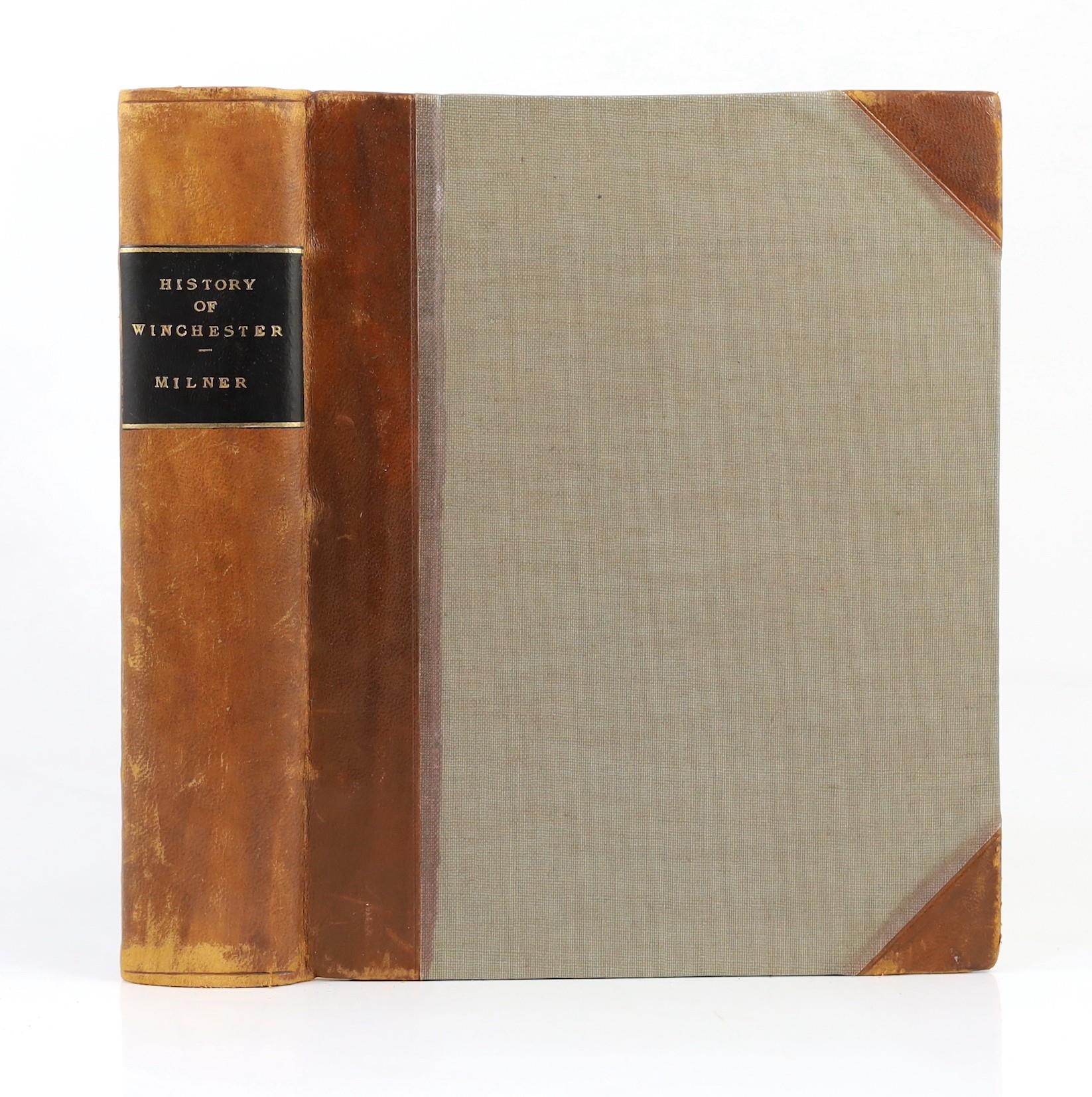 ° ° HAMPSHIRE: Milner, Rev. John - The History Civil and Ecclesiastical, & Survey of the Antiquities of Winchester ... 2 vols (in one). pictorial engraved 10 plates (some folded, incl. the City Plan), text decorations; (?) early 20th cent. half calf and buckram, 4to. Winchester, (1798)