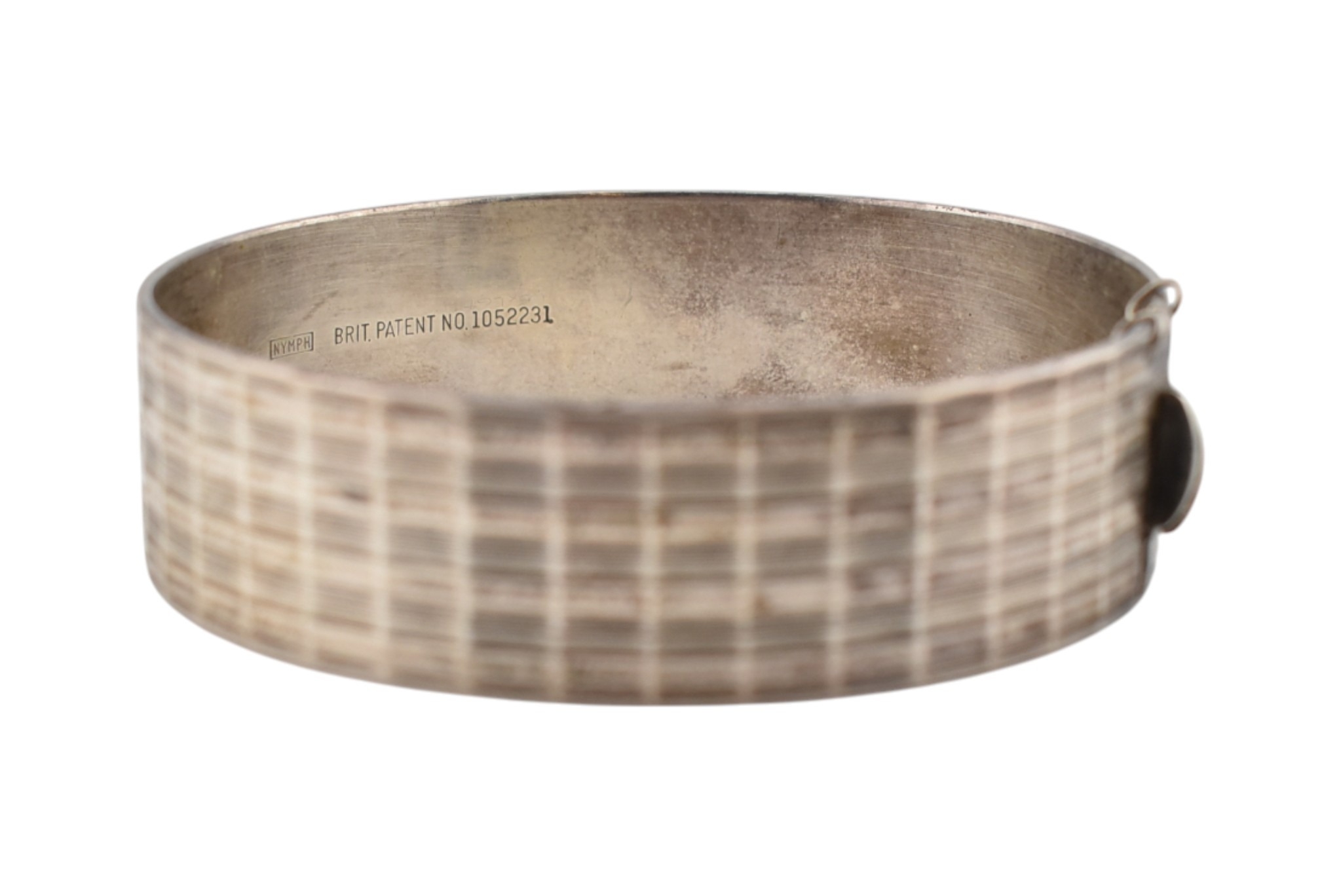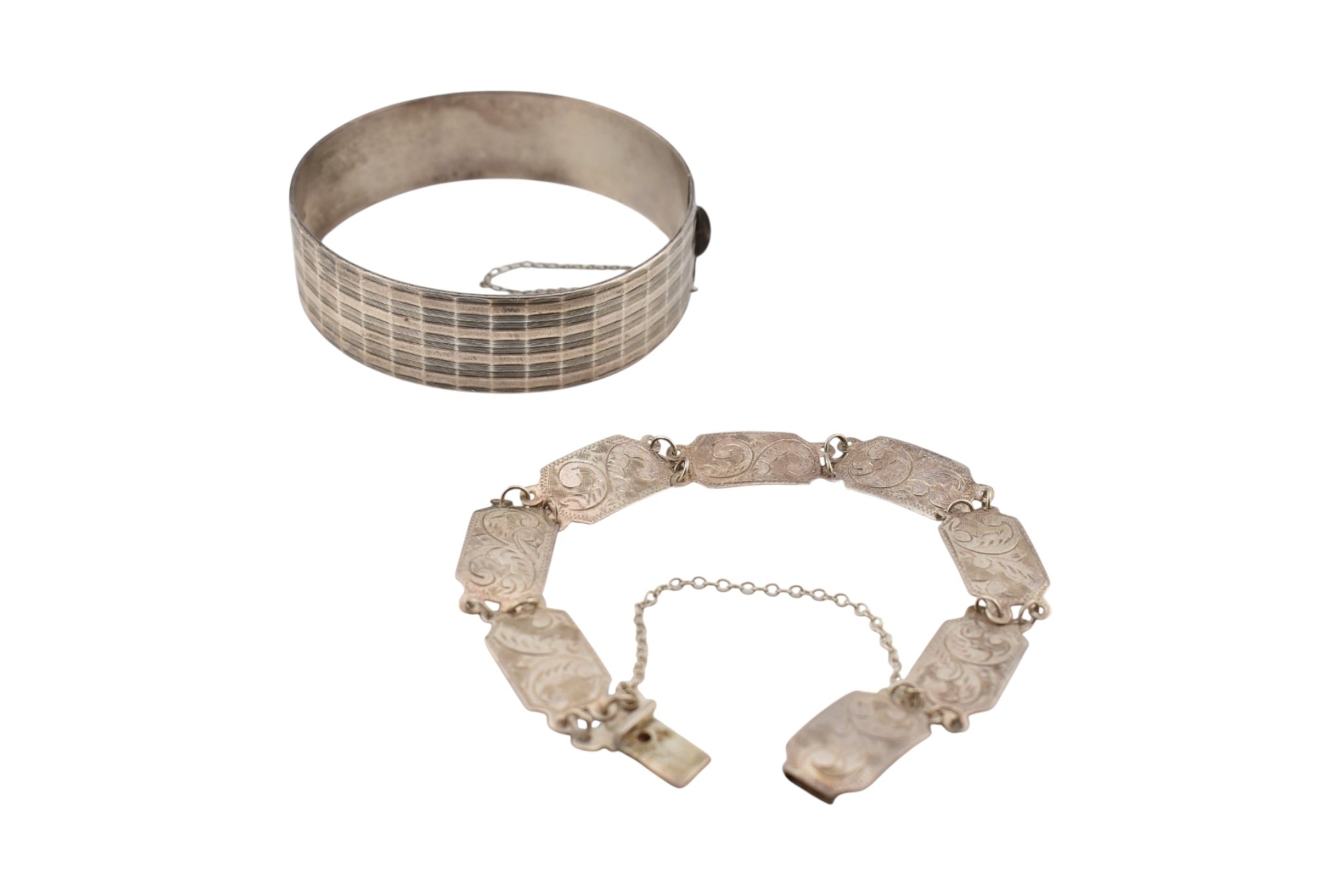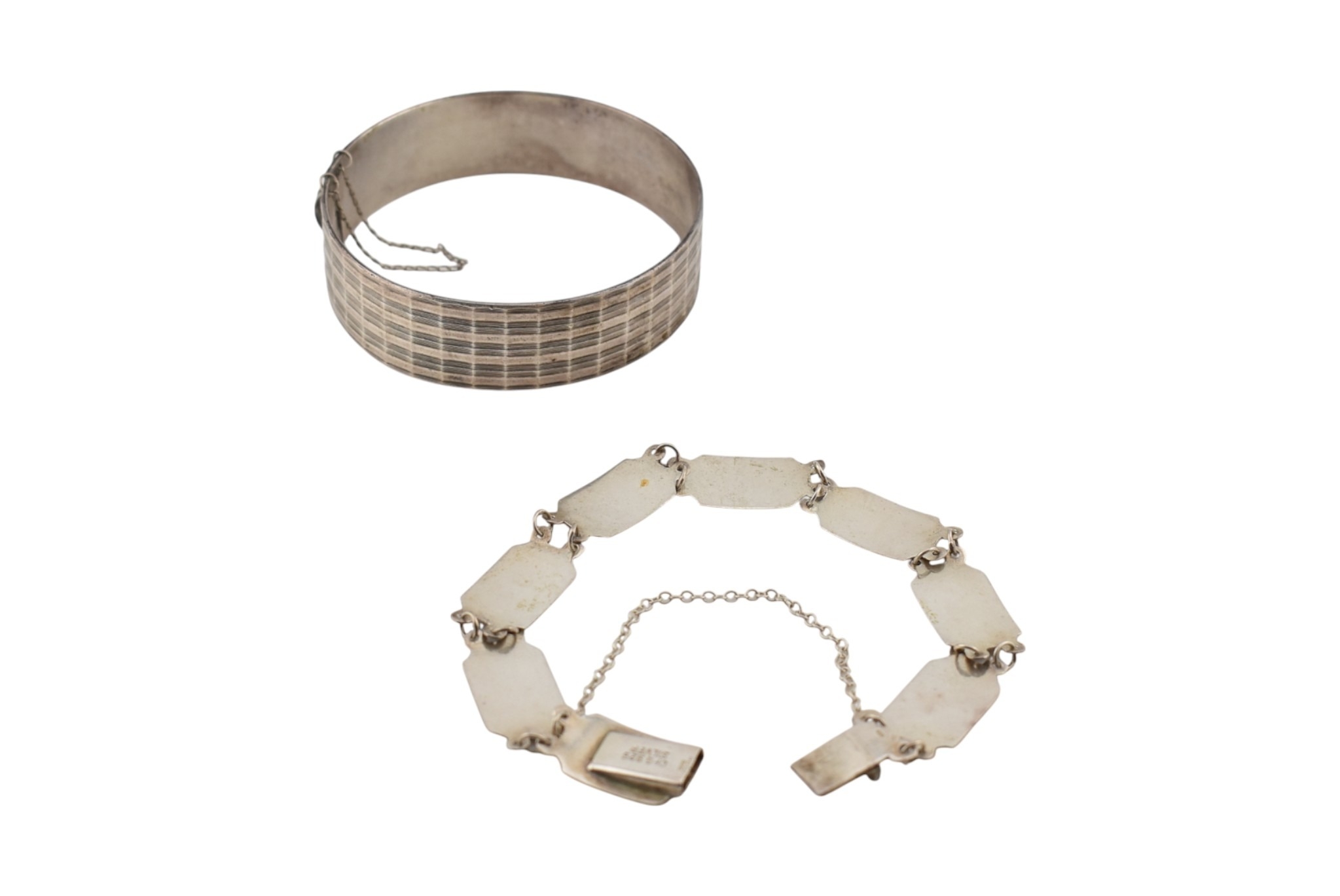 A 1970s Maylin products hallmarked silver bangle together with silver panel bracelet. Hallmarked London 1974. Weight 35g.