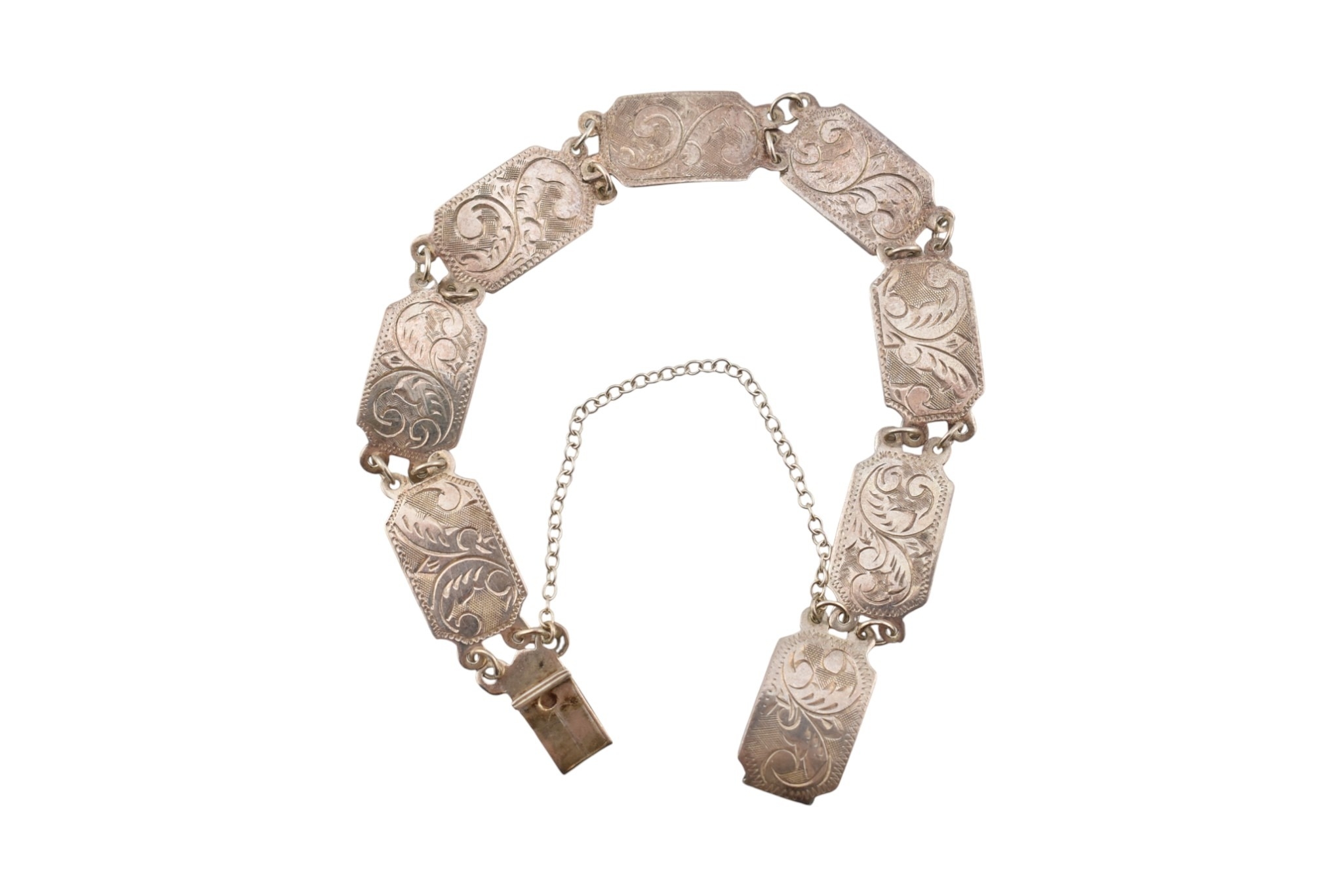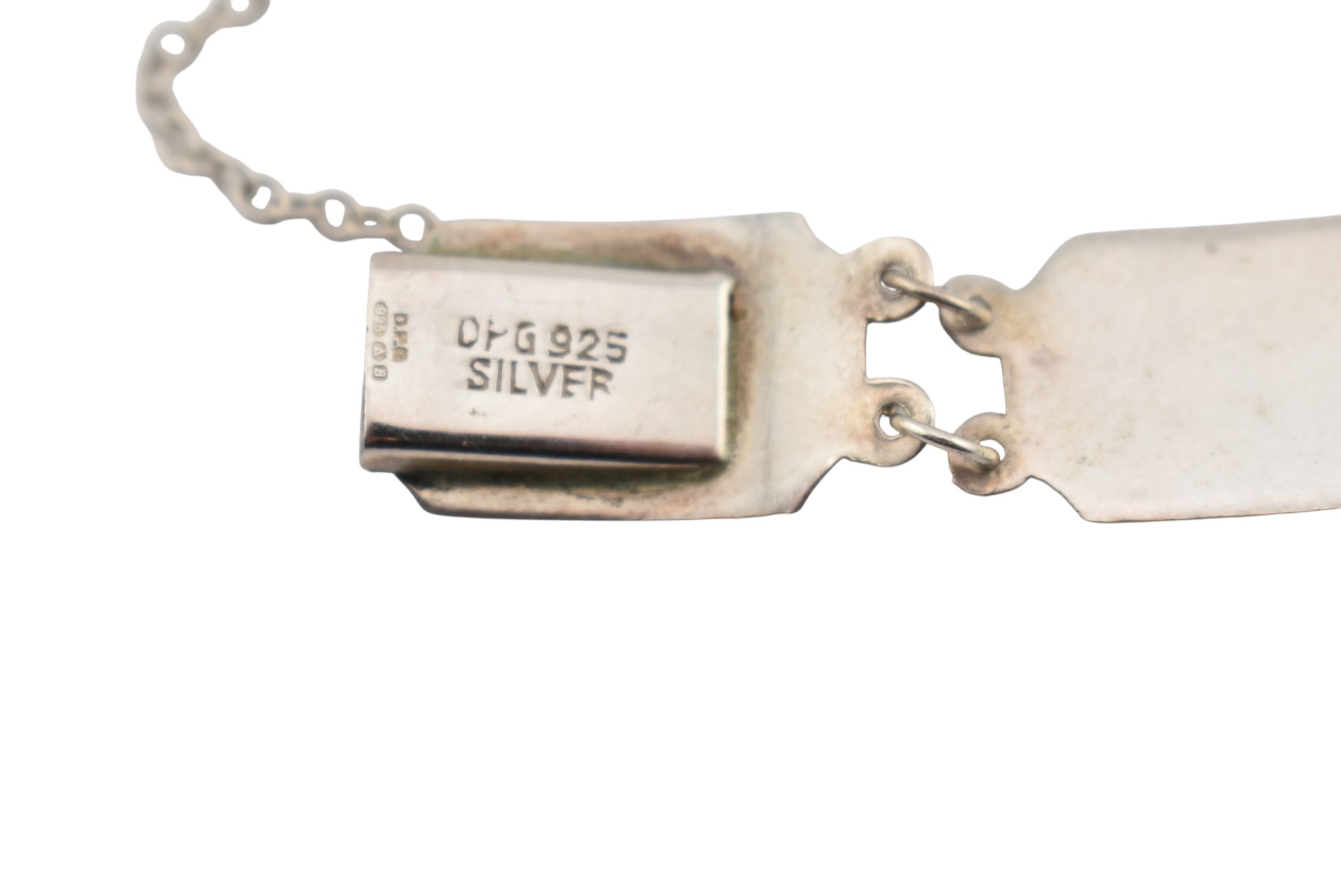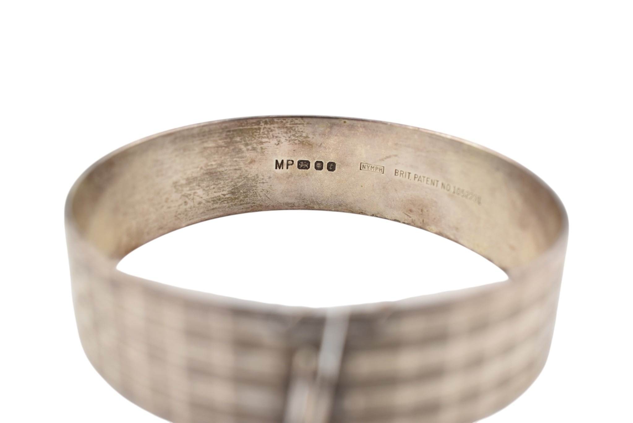 A 1970s Maylin products hallmarked silver bangle together with silver panel bracelet. Hallmarked London 1974. Weight 35g.