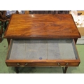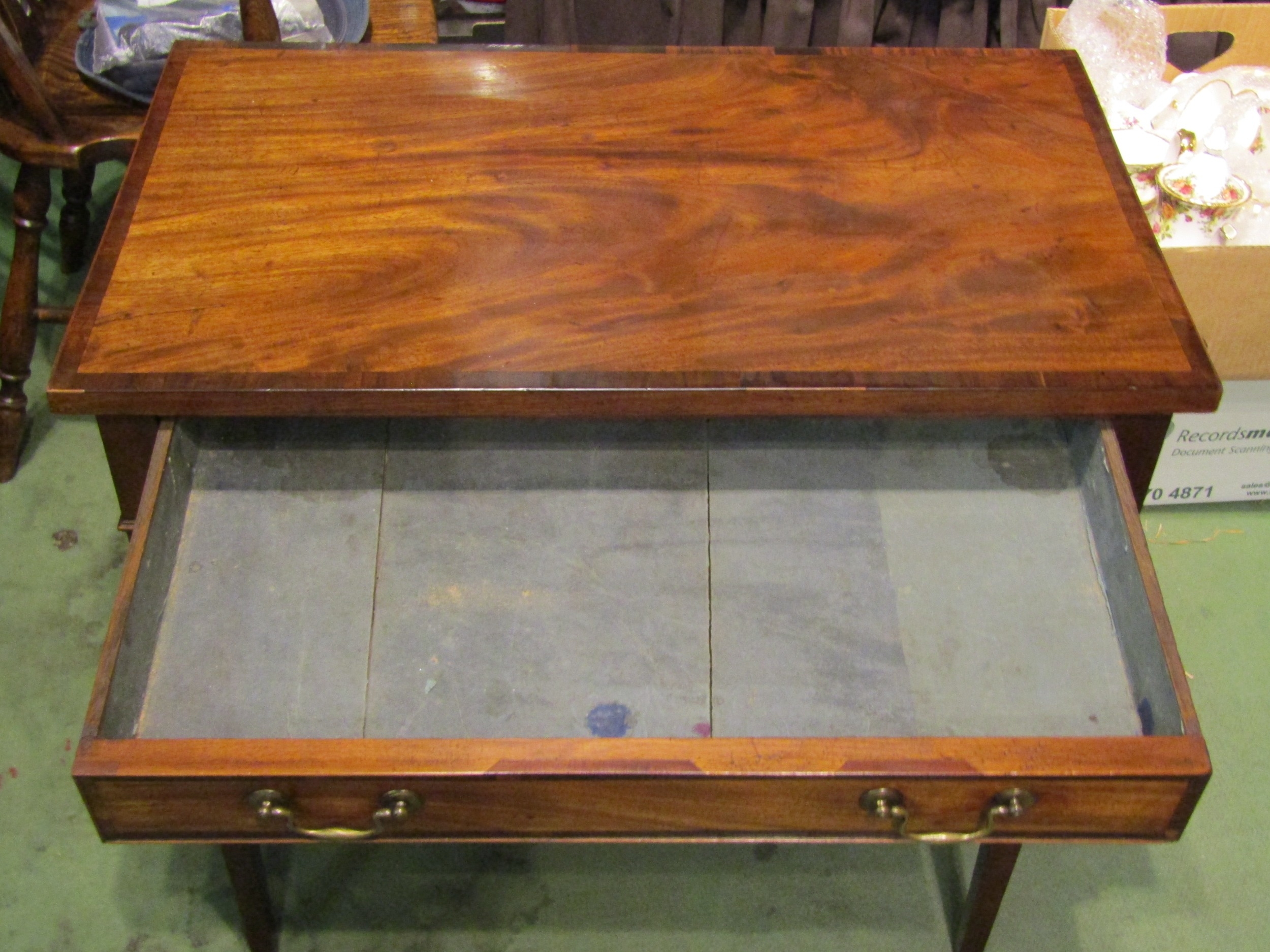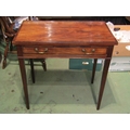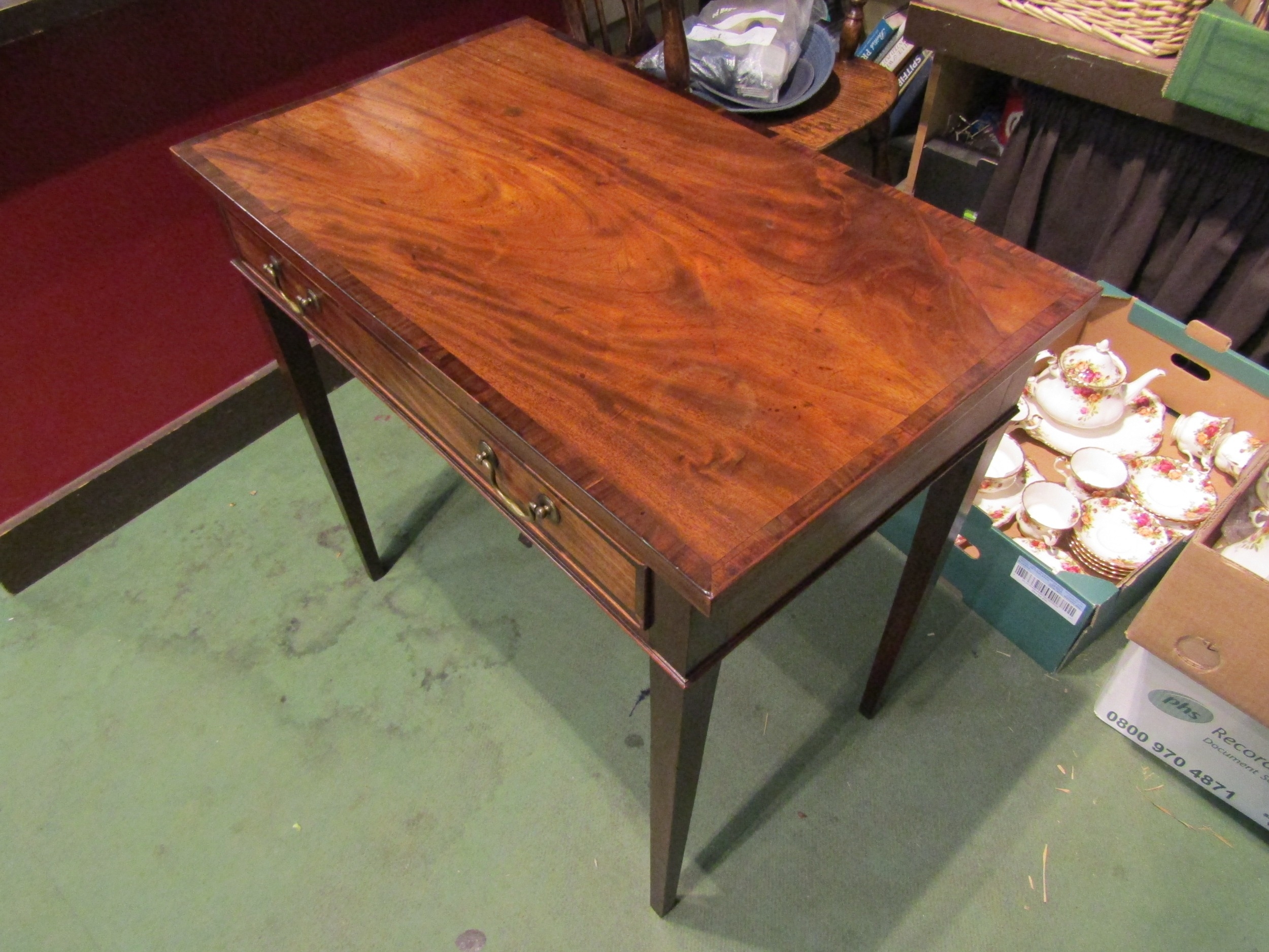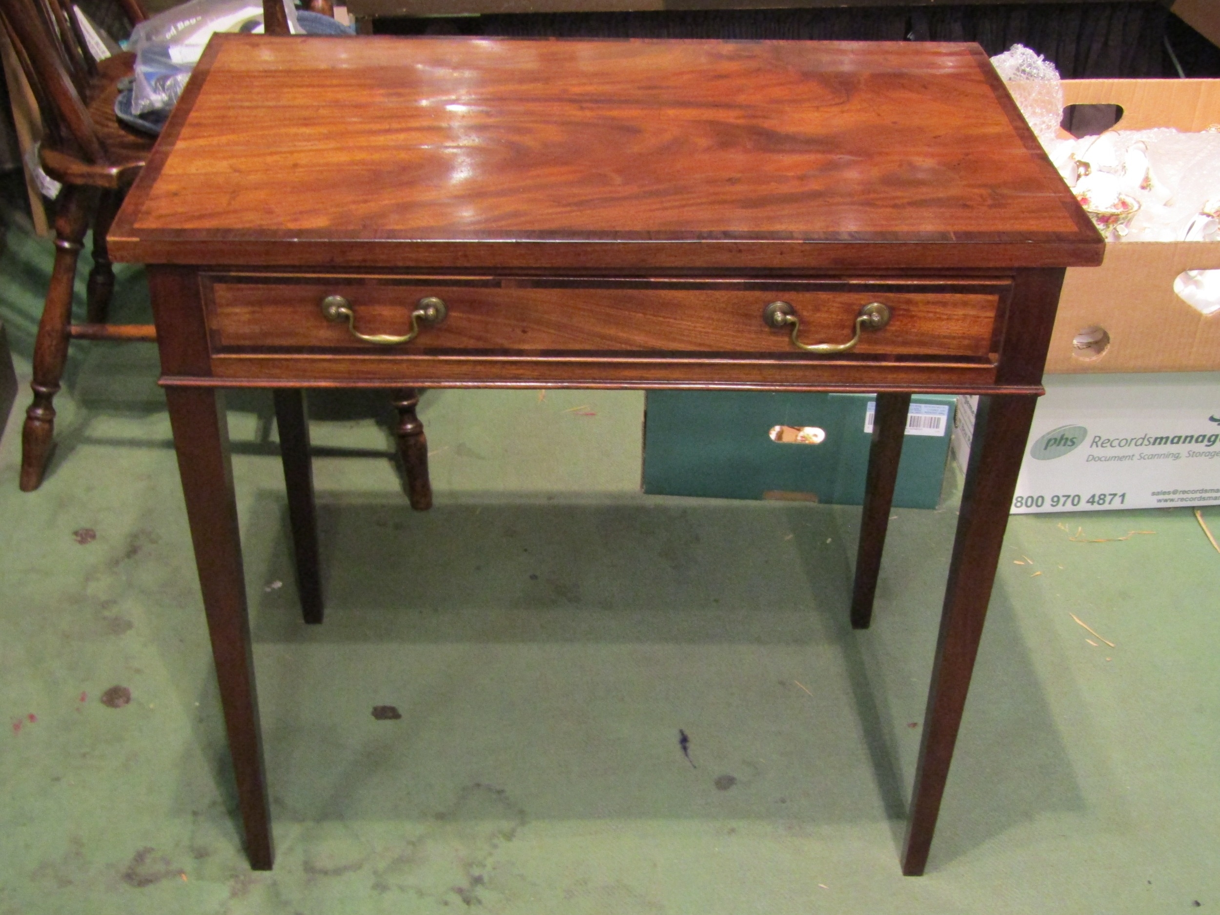 A 19th Century crossbanded flame mahogany side table with single frieze drawer over square tapering leg supports, 70cm tall x 73cm wide x 44cm deep