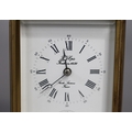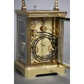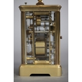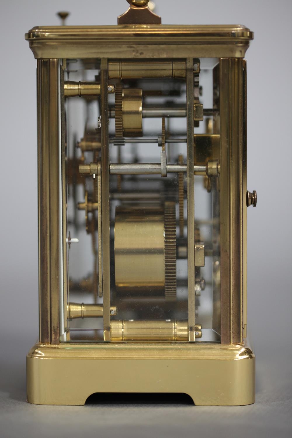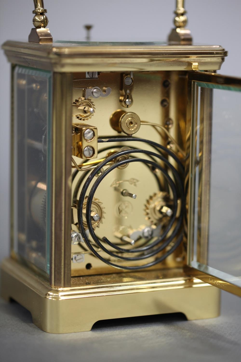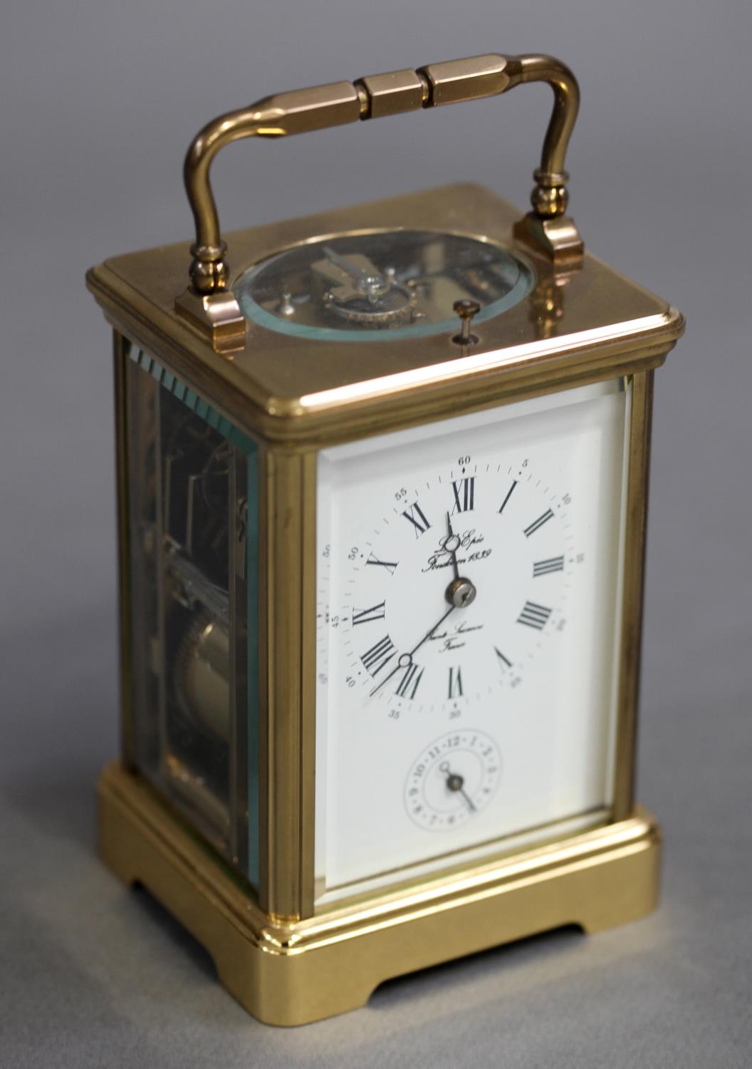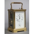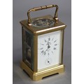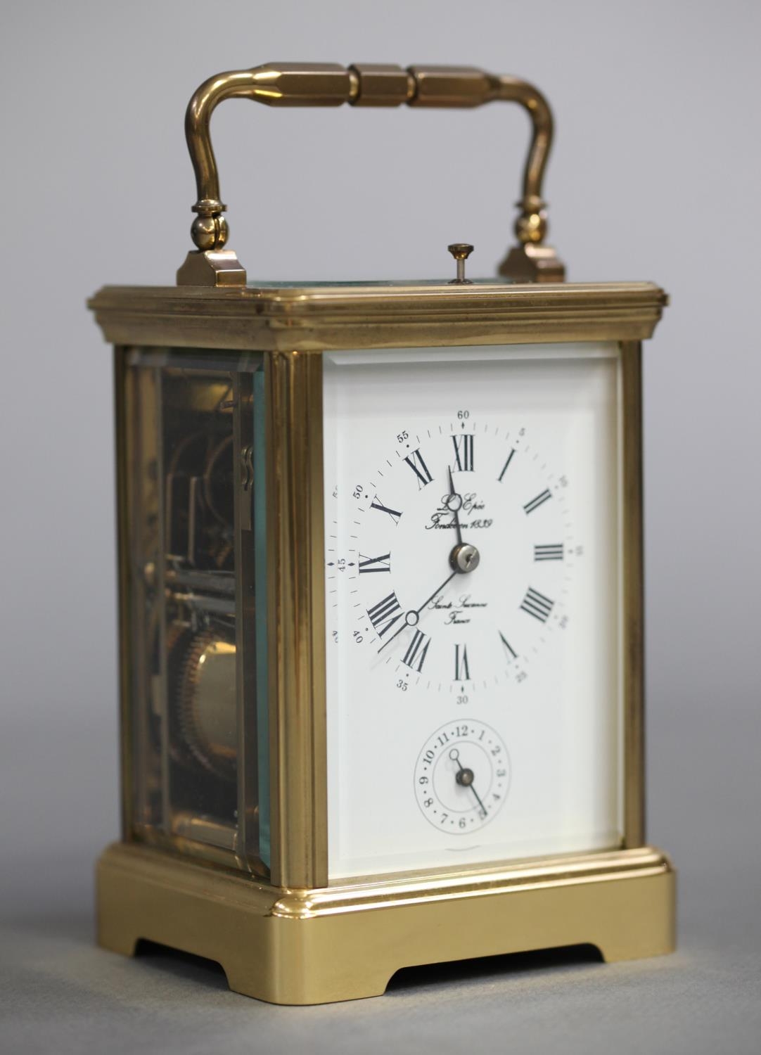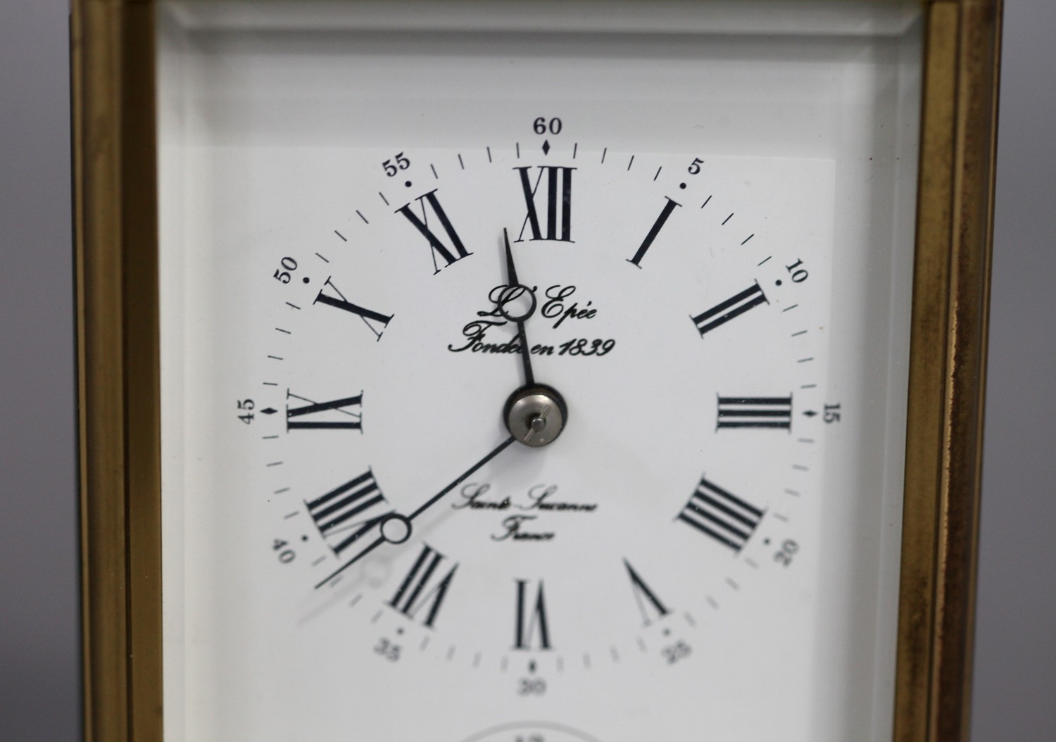 A French brass striking carriage clock, with push button repeat and alarm by L'Epee, 20th century, the eight day two train movement striking on a gong, white enamel dial with black Roman numerals within a chapter ring with Arabic numerals and a subsidiary alarm dial below, signed to dial, 17cm over handle, 'L'Epee Founded 1839 Saint Suzanne, France'