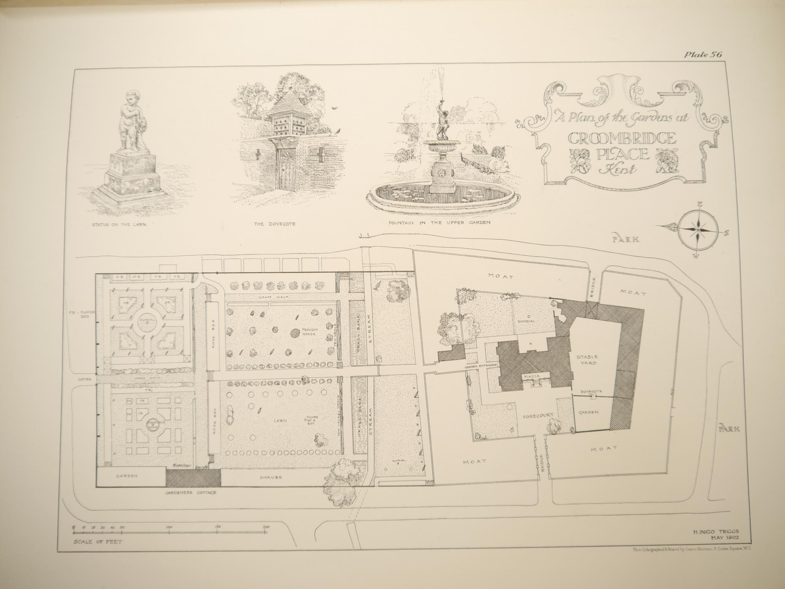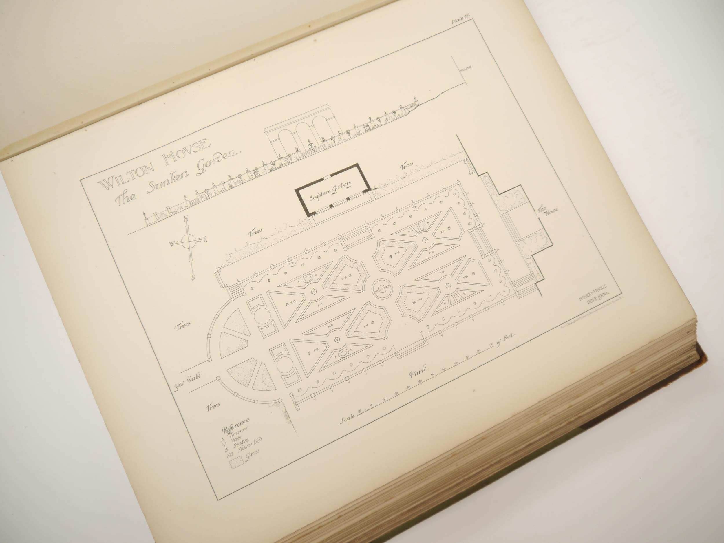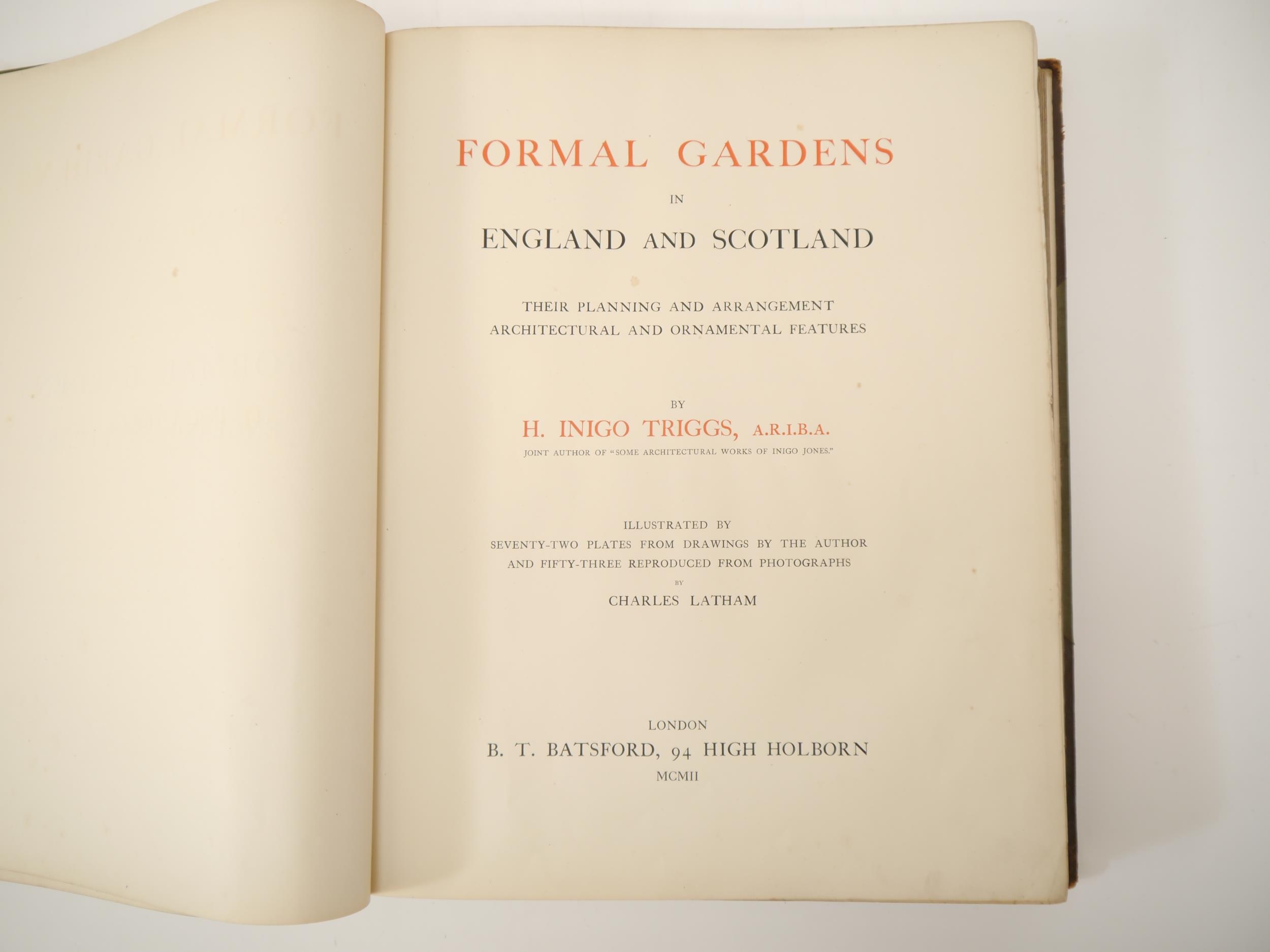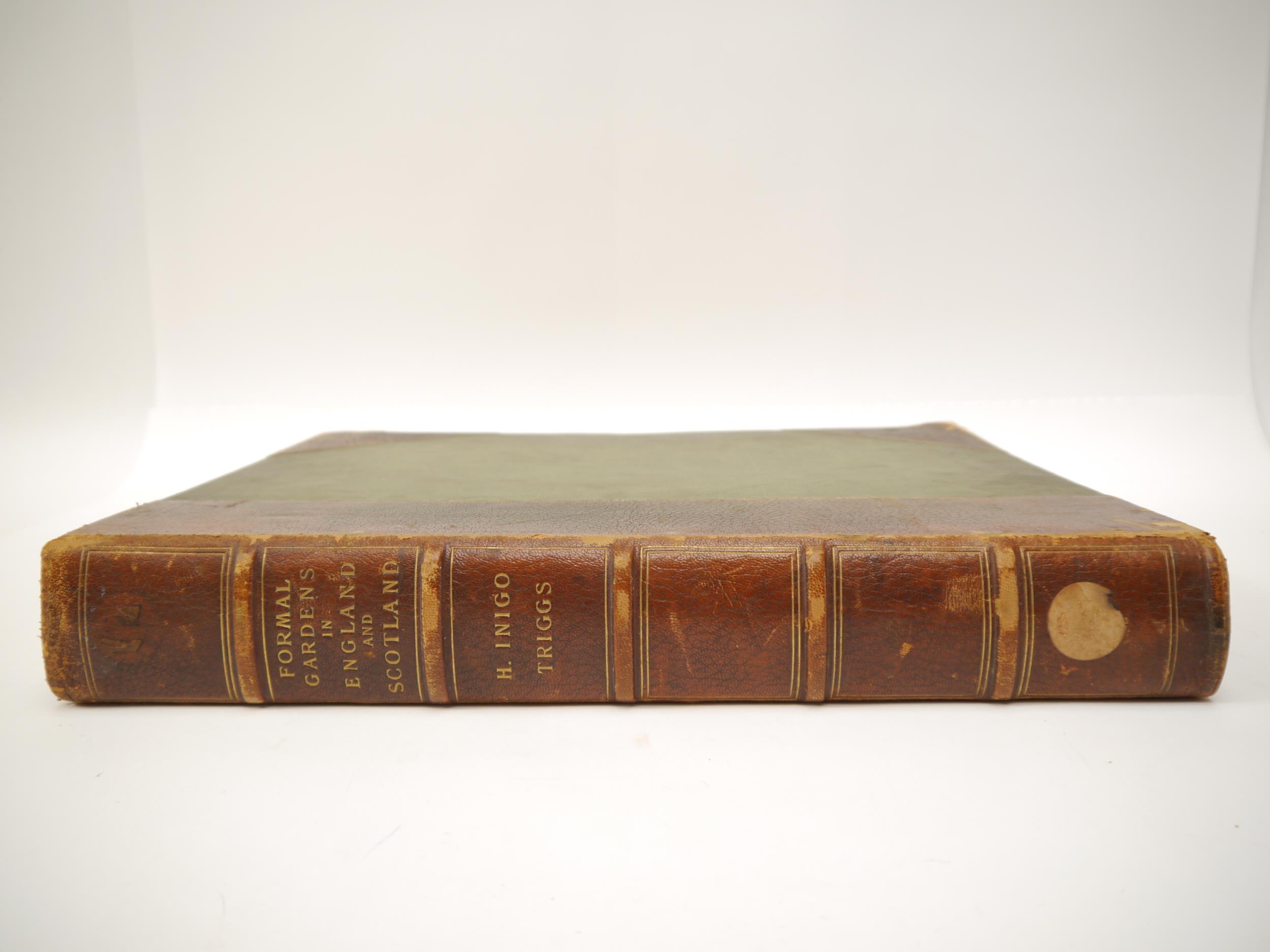 H. Inigo Triggs: 'Formal Gardens in England and Scotland - Their Planning and Arrangement, Architectural and Ornamental Features', London, Batsford, 1902, six page list of subscribers, 125 plates as called for (of which 72 from drawings by Trigg and L. Rome Guthrie, and 53 from photographs by Charles Latham), xxiv,63,[1]pp, elephant folio, original half green morocco gilt over olive cloth (slightly worn), all edges gilt. An impressive work illustrative of estates and their gardens produced during the turn of the century revival of interest in the formal garden by Henry Inigo Triggs (1876-1923), one of the foremost proponents of formal garden design and country house architecture of the period.