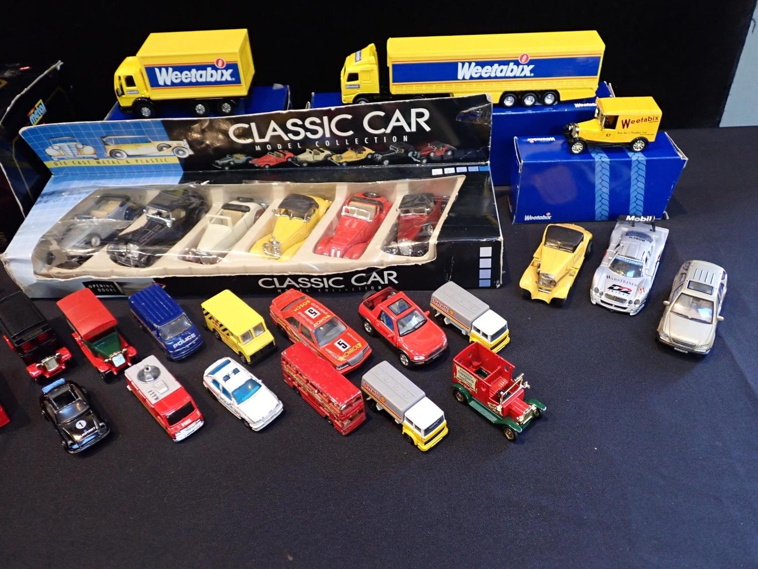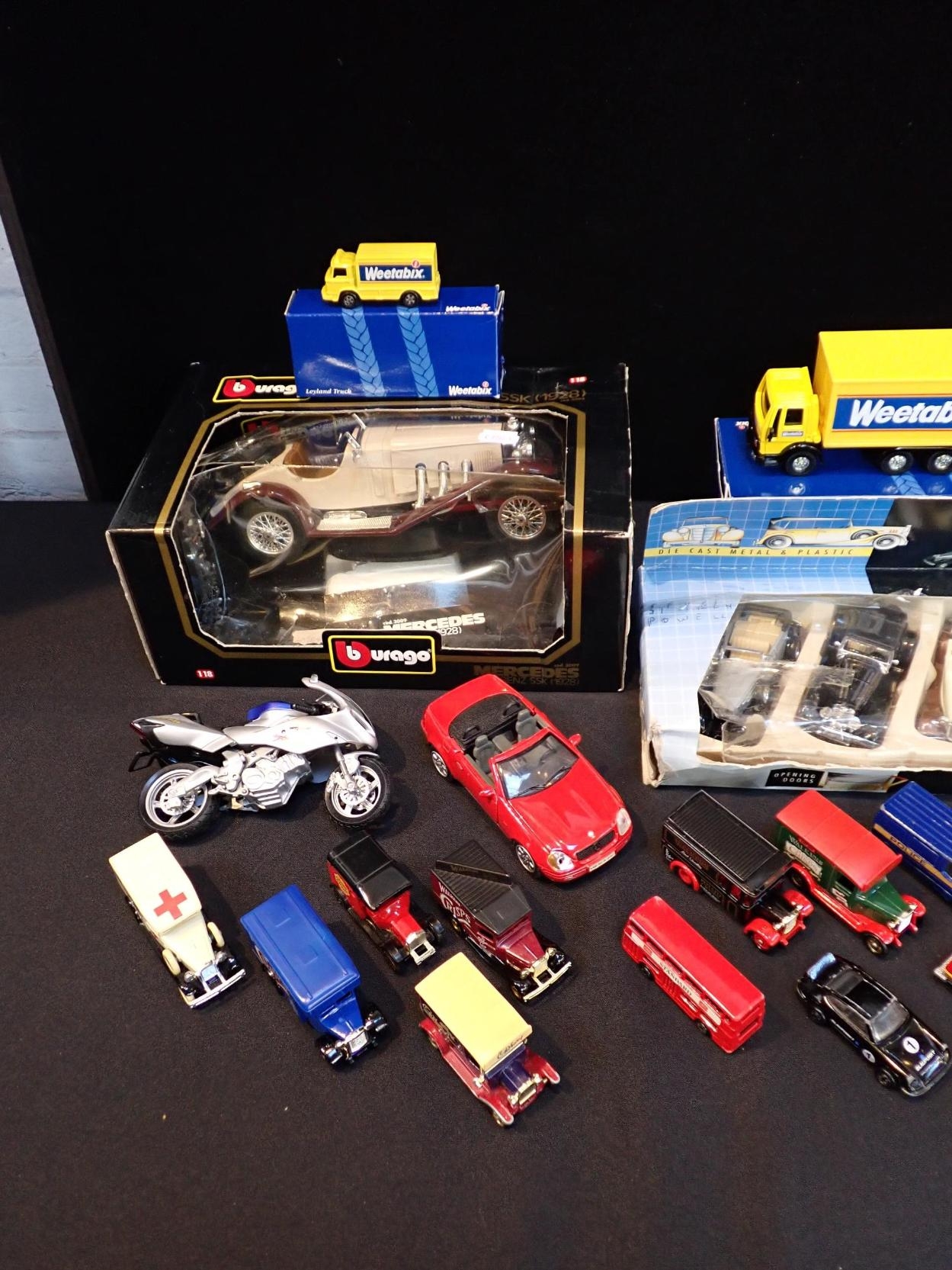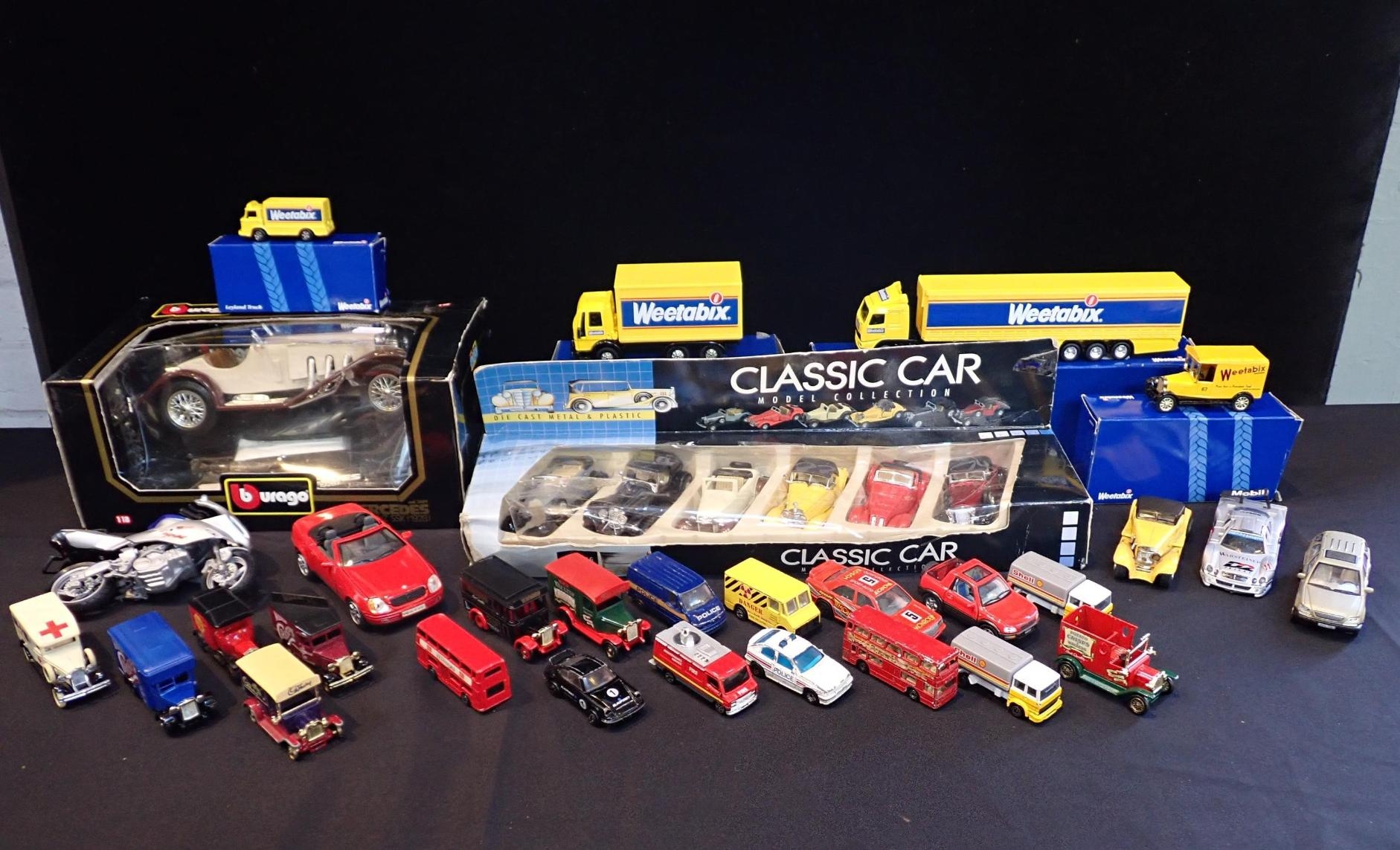 A COLLECTION OF DIECAST MODEL VEHICLESincluding boxed Weetabix models, Burago, Matchbox, and others (some playworn condition)