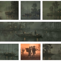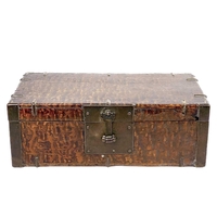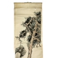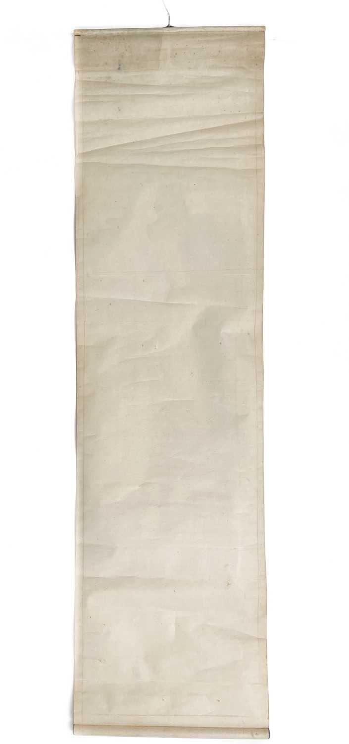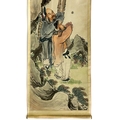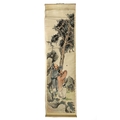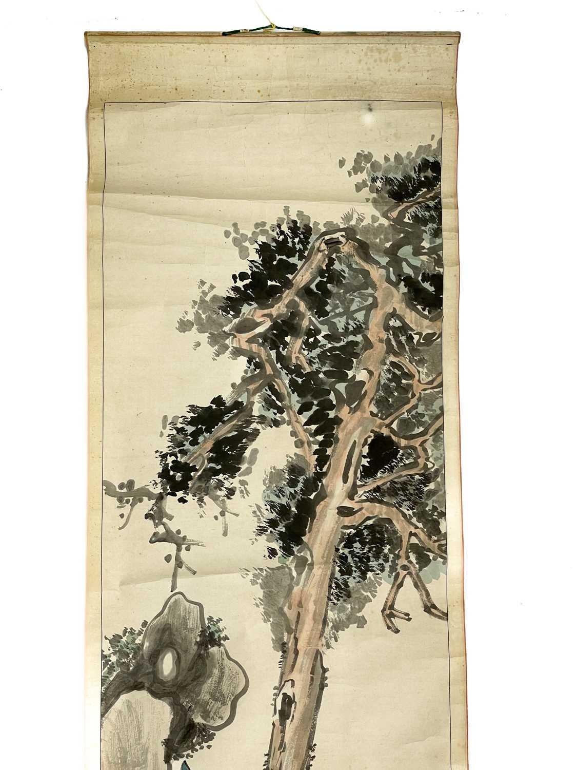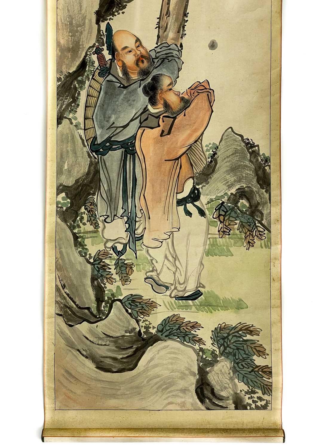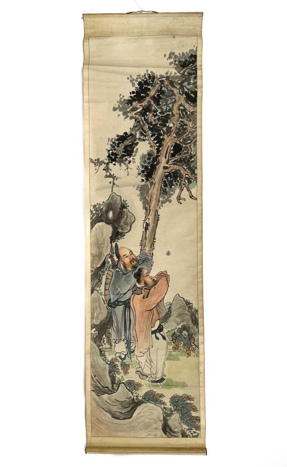 A Chinese painted scroll, early 20th century. Depicting two bearded men in a rocky landscape and standing beneath a tree, length 161cm, width 43cm. This scroll has no tears and no restoration. It has creasing and widespread faint foxing