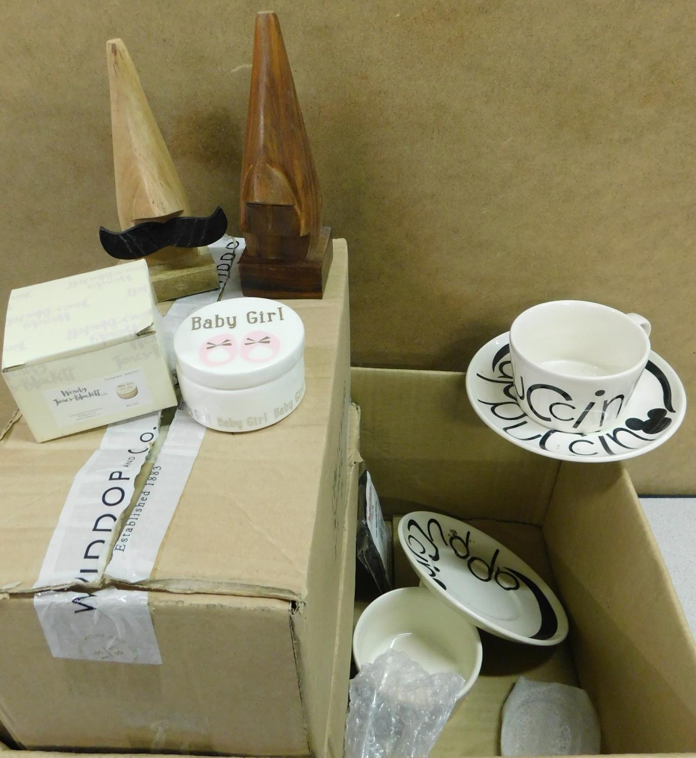 Box of new items incl. 'Baby Girl' trinket dishes etc.