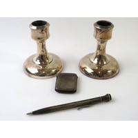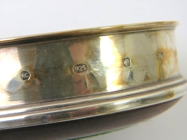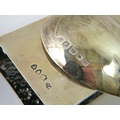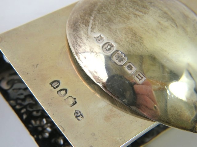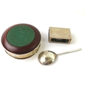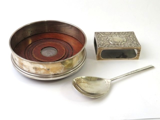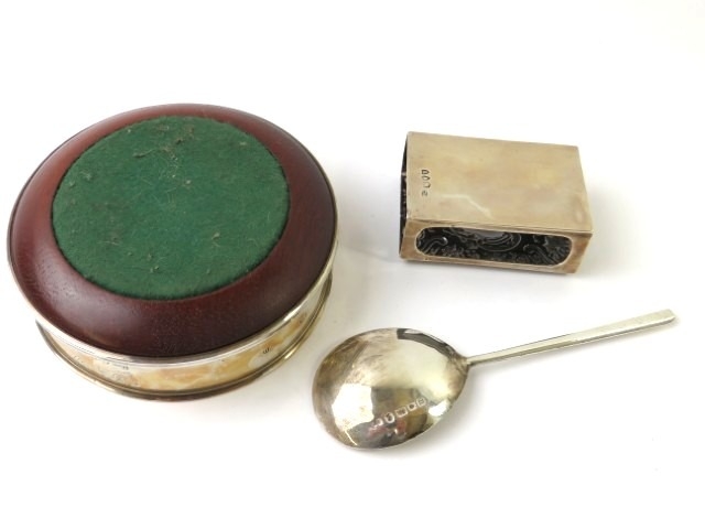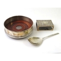 A silver mounted hard wood wine coaster, a silver match box cover and a silver Arts & Crafts style spoon. All fully hallmarked. Weighable silver 91 grams. (3)
