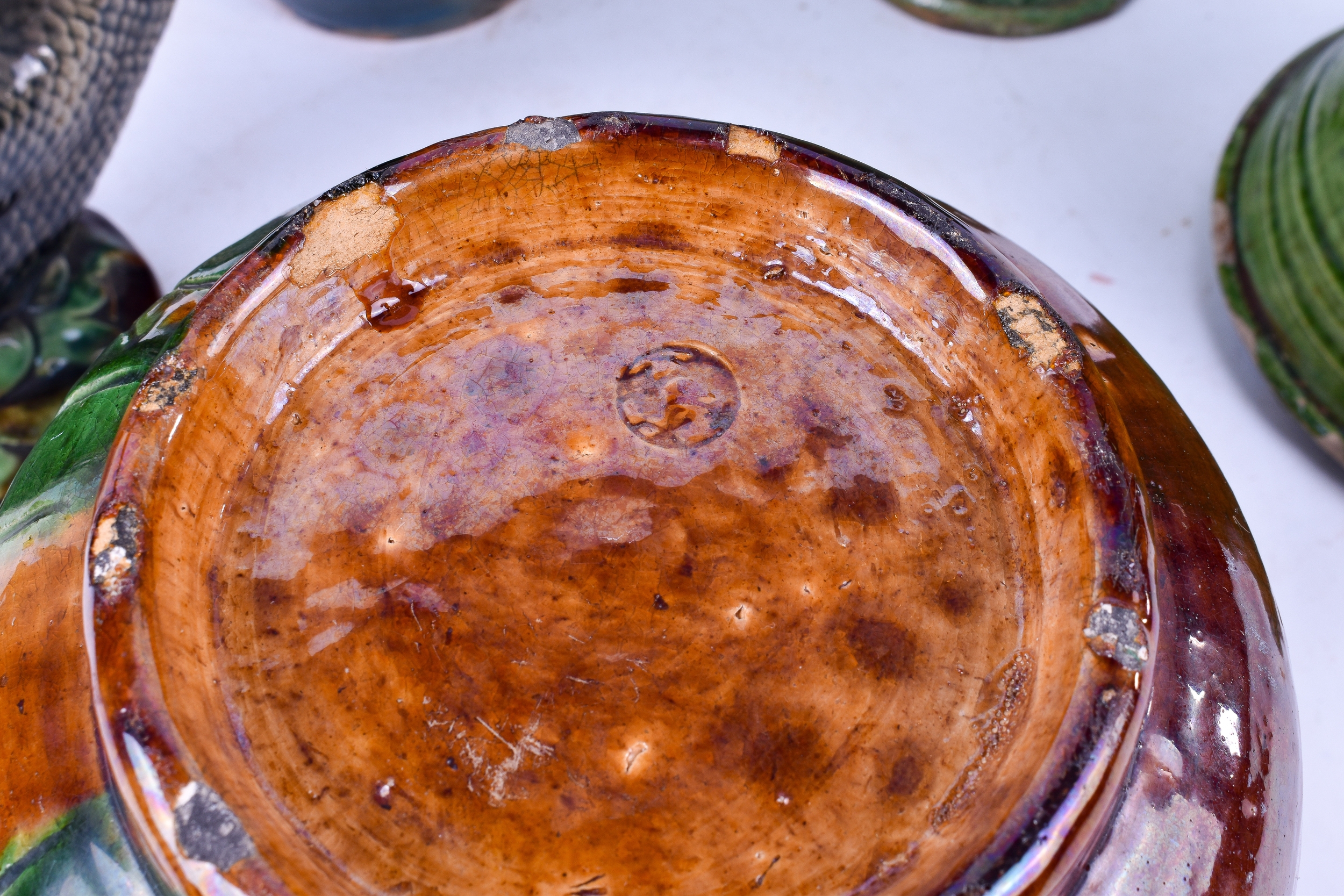 A collection of five early 20th century ceramics. Including a Majolica fish jug and two pottery vases and two jugs. Largest H28cm