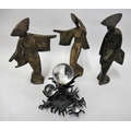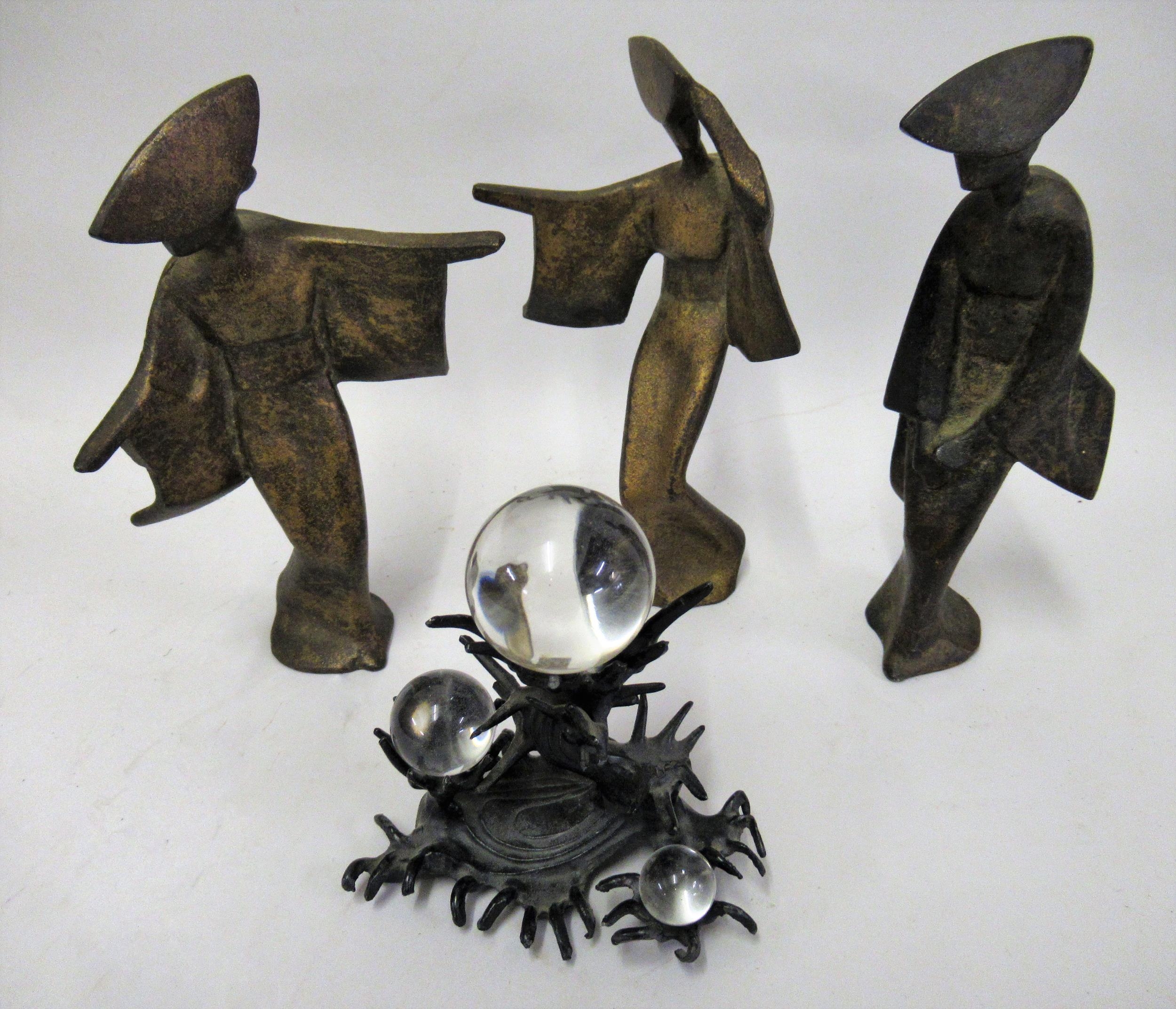 Set of three Japanese gilt patinated metal figures of geisha girls, together with a patinated metal and glass sculpture