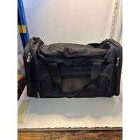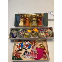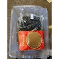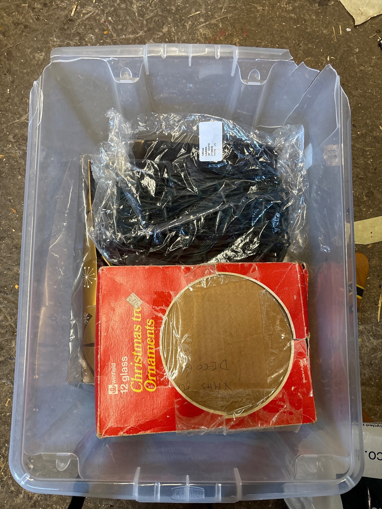 Clear plastic bin with assorted holiday decorations. Christmas bnb