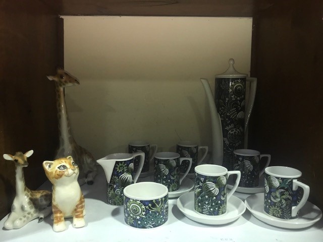 SECTION 9. A 1960s Portmeirion 'Magic Garden' coffee set by Susan Williams-Ellis, comprising a tall lidded coffee pot, six coffee cans and saucers, milk jug and sugar bowl, together with a large Russian ceramic giraffe with calf and a Seneshall ginger cat