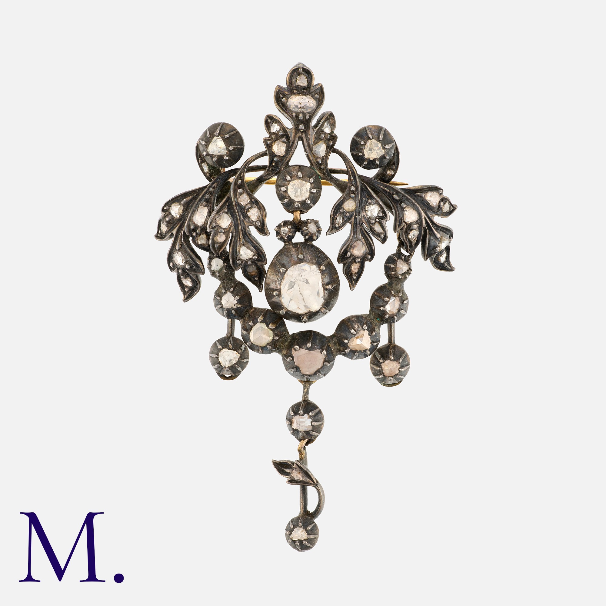 A Rose Cut Diamond Brooch in yellow gold and silver, of scrolling and foliate form, the articulated brooch set with rose cut diamonds the largest of which measuring approximately 7.0 x 6.0mm. Unmarked, tests indicate 14 carat gold and silver.