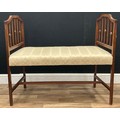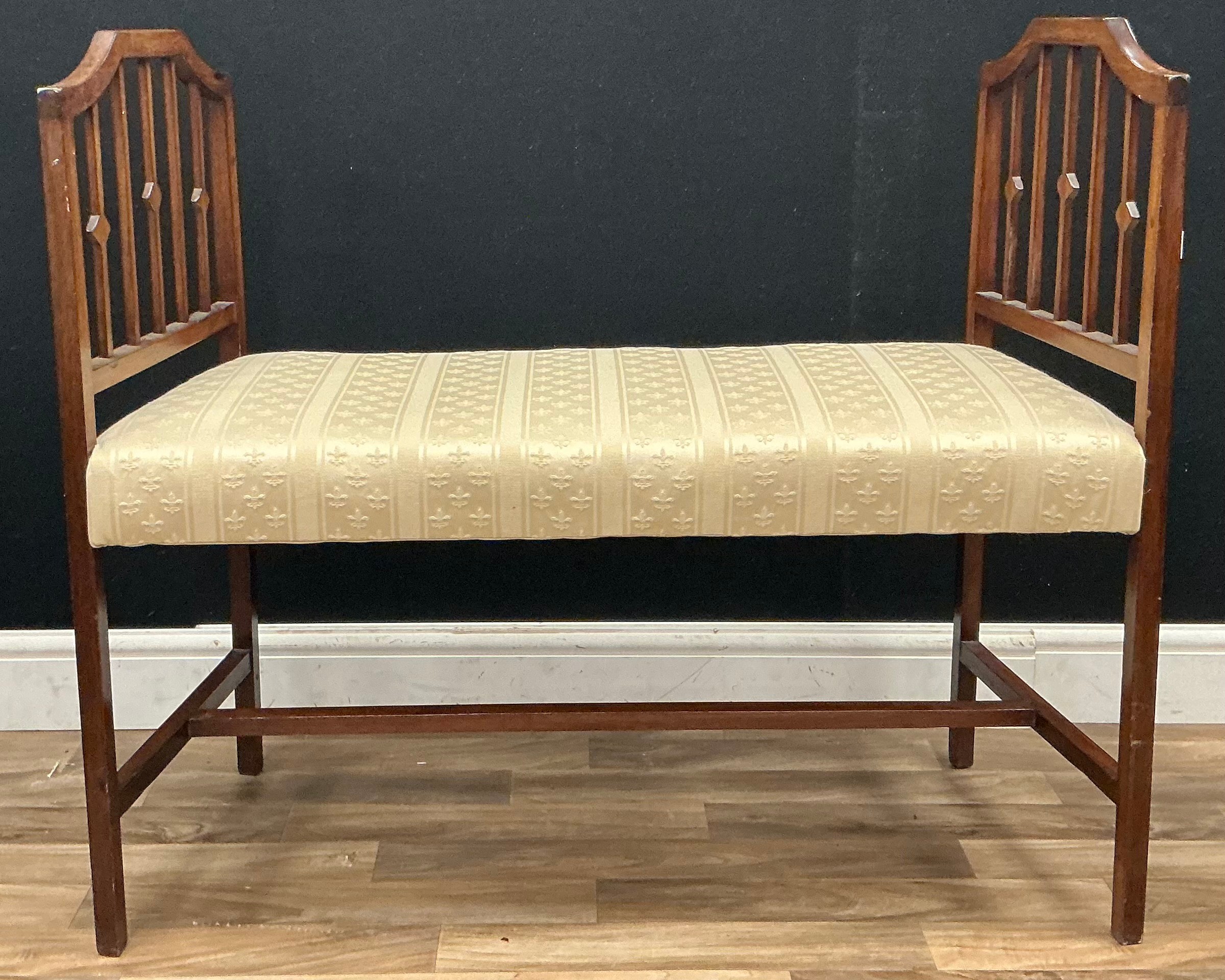 A late Victorian Gothic Revival mahogany canted window seat, the fleur de lys upholstered seat in tones of cream and gold, tall ecclesiastic type armrests, tapering legs, H-stretcher, 85cm x 95cm x 43cm, c.1900