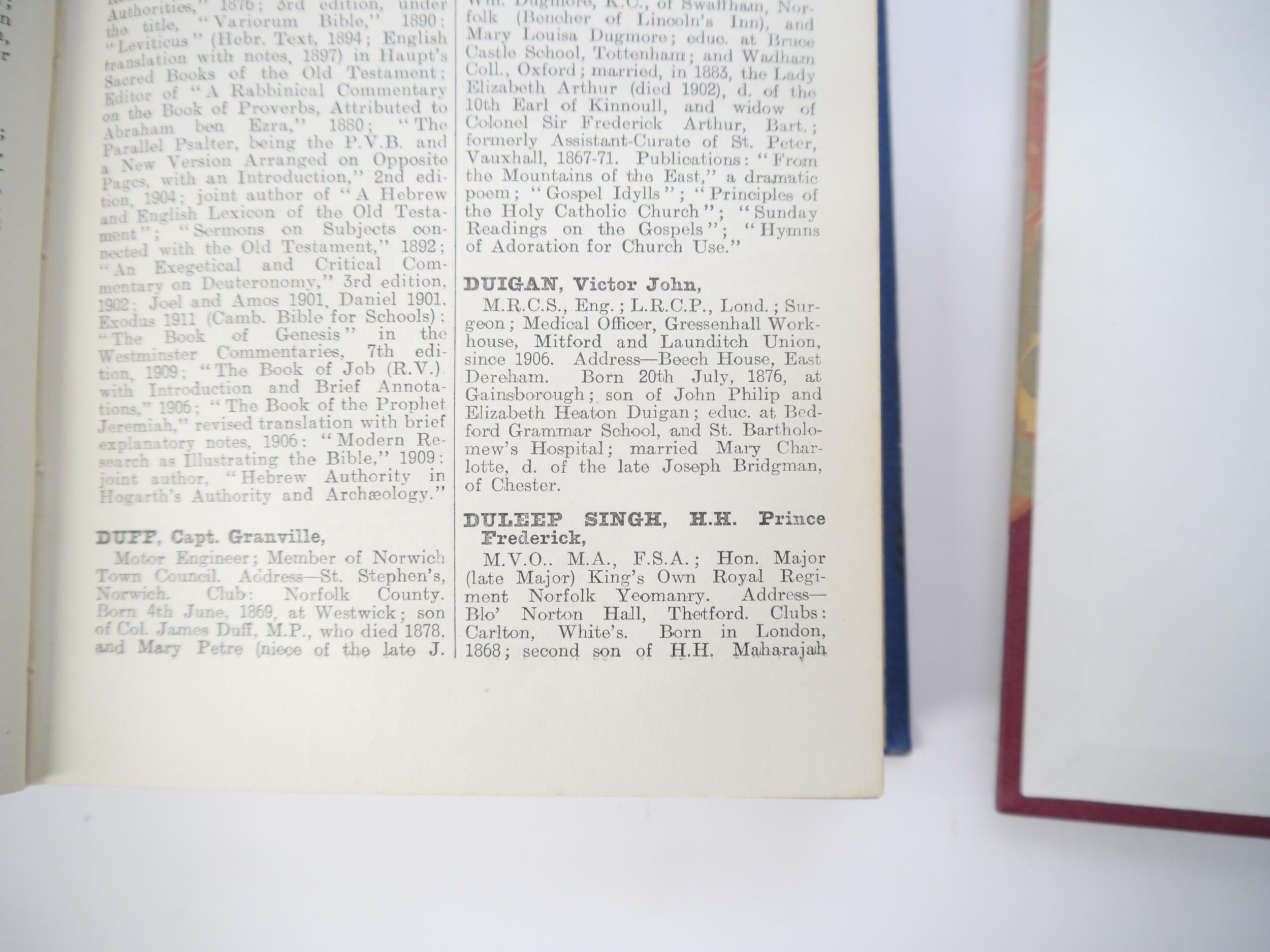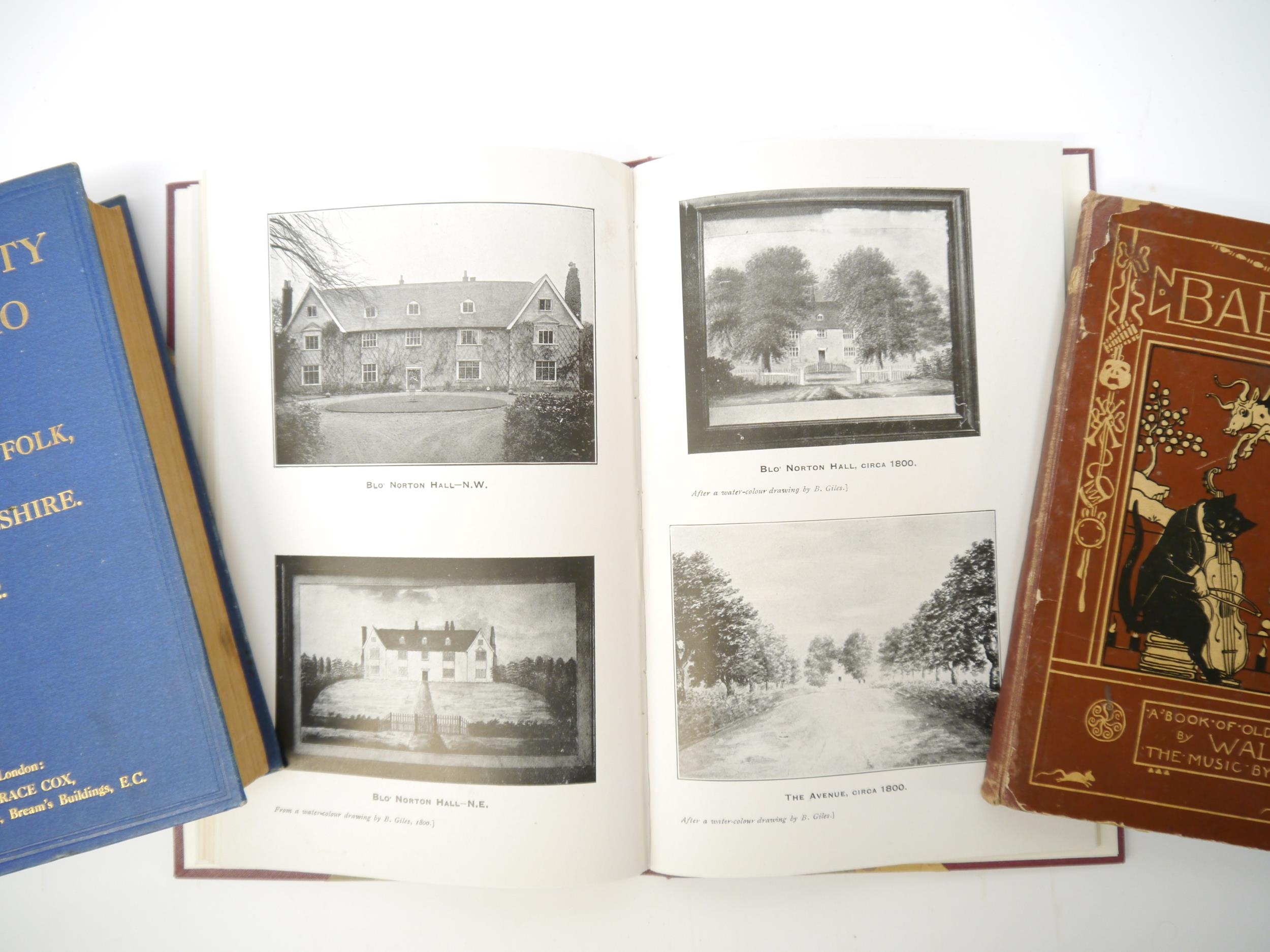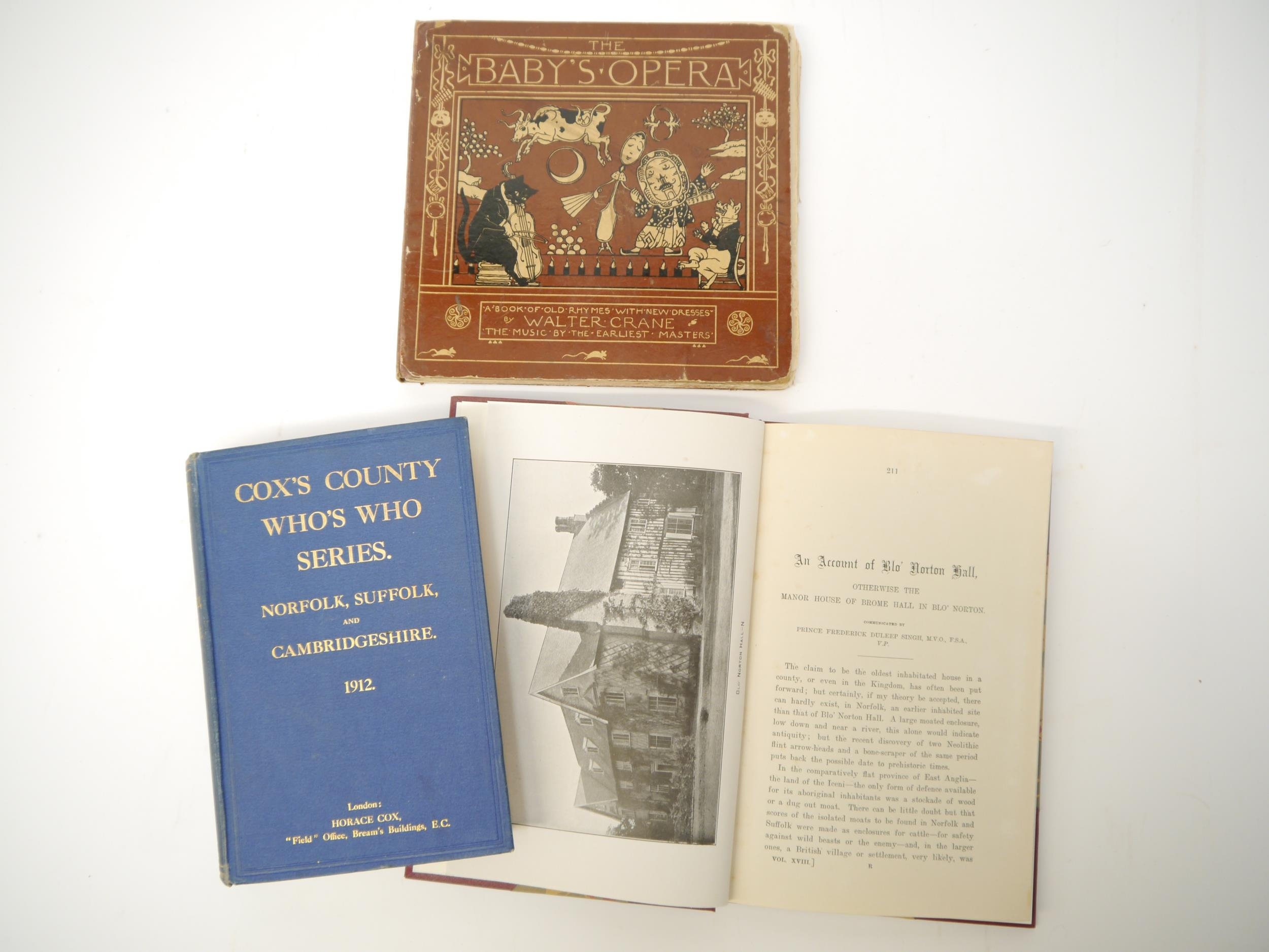 Prince Frederick Duleep Singh (1868-1926): 'An account of Blo' Norton Hall : otherwise the manor house of Brome Hall in Blo' Norton. Communicated by Prince Frederick Duleep Singh, M.V.O., F.S.A., V.P.', [Norwich, Norfolk and Norwich Archaeological Society], Vol. xviii., pages 211-260, [1910], 24 plates, folding genealogical table, rebound half cloth gilt; together with 'Cox's County Who's Who Series. Norfolk, Suffolk, and Cambridgeshire. 1912', entry for Prince Frederick Duleep Singh p77/78, original cloth gilt, plus a copy of Walter Crane 'The Baby's Opera', c.1880, from Elveden Hall Library, Suffolk, home of the Maharajah Duleep Singh 1849-1894, with the pencil inscription "B.C. & S." to half title, the initials of the daughters of the Maharajah Duleep Singh & Bamba Müller, Bamba, Catherine & Sophia Duleep Singh (3)
