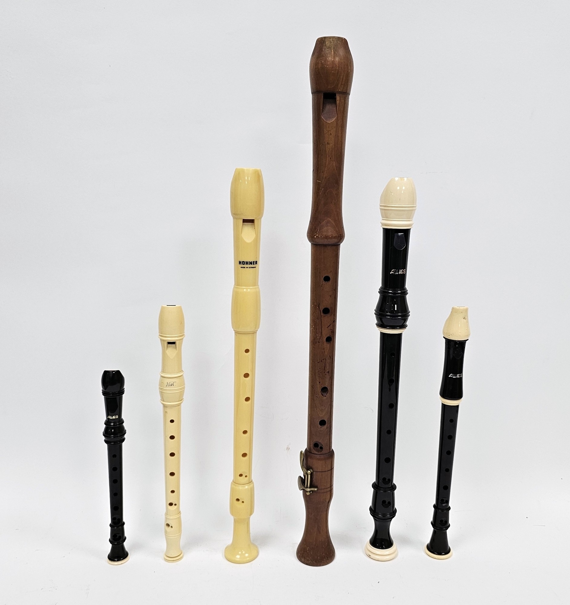 Collection of six recorders including 1970's German Johannes Adler wooden tenor, Aulos sopranino, Aulos and a New Apostle Church descant recorders, Hohner and a Aulos treble recorder(6)