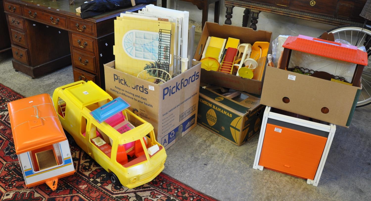 A large collection of Sindy and Barbie toys, dolls and accessories to include; furnishing items, dolls, Barbie dream store, camper van, caravanette etc. (B.P. 21% + VAT)
