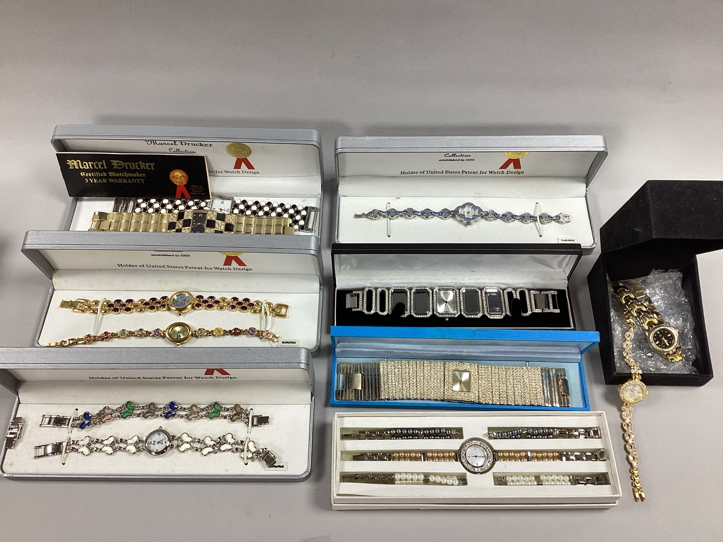 Assorted Modern Ladies Wristwatches, including Marcel Drucker, Dazzle, imitation pearl, etc, mainly boxed.