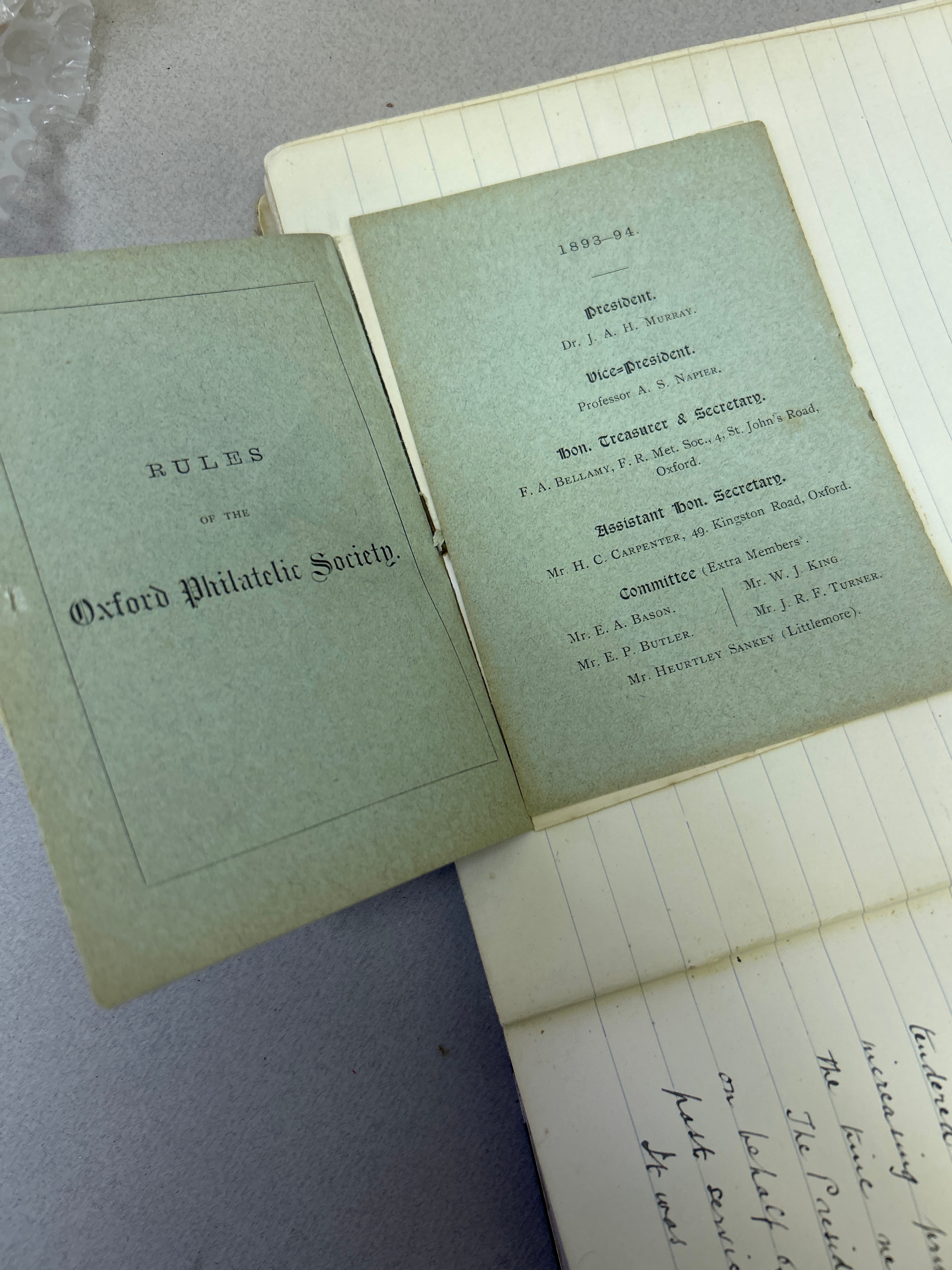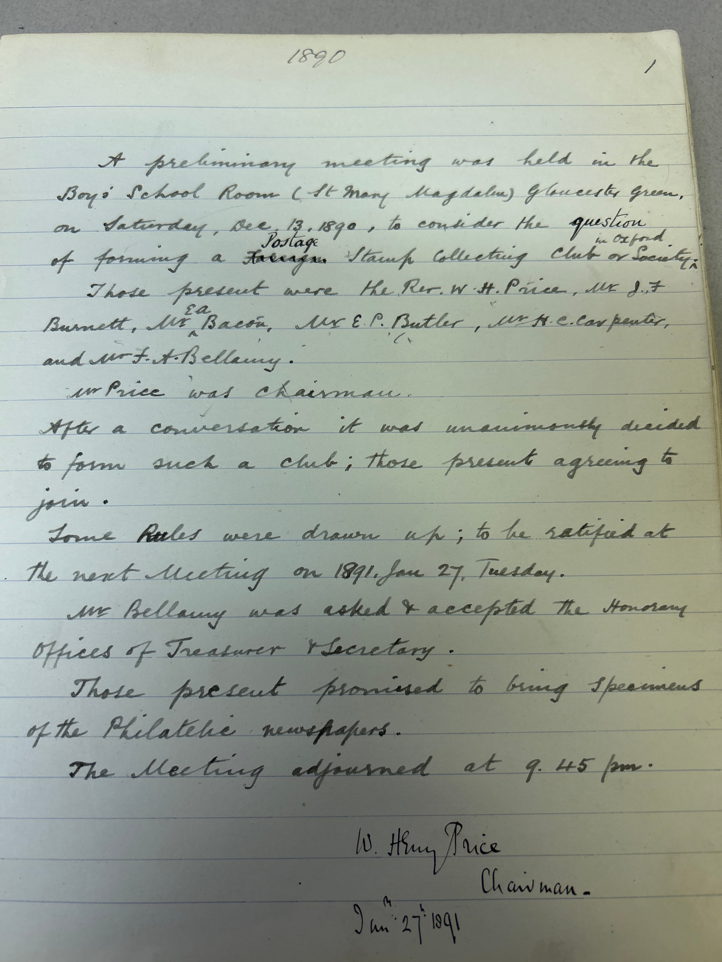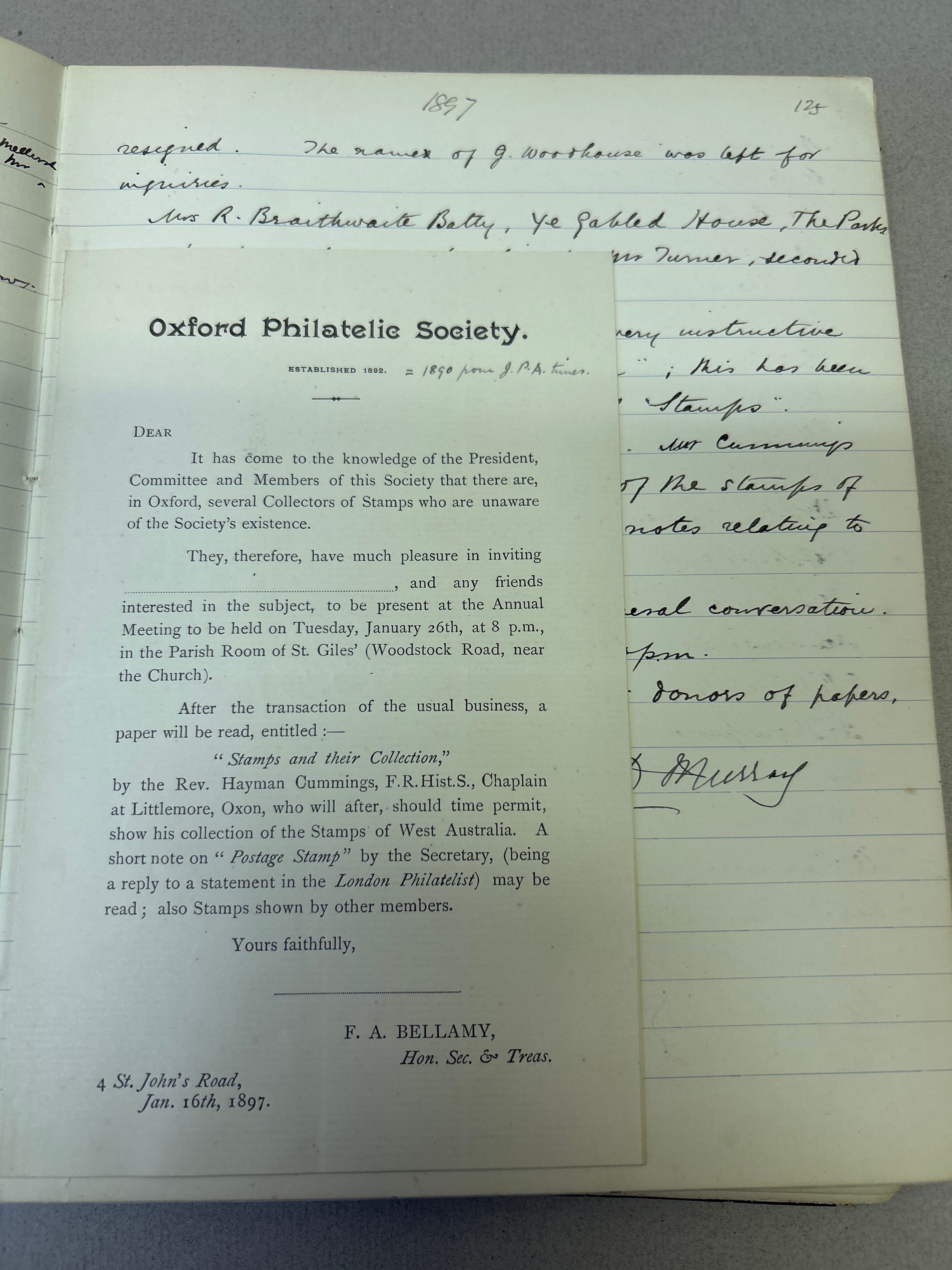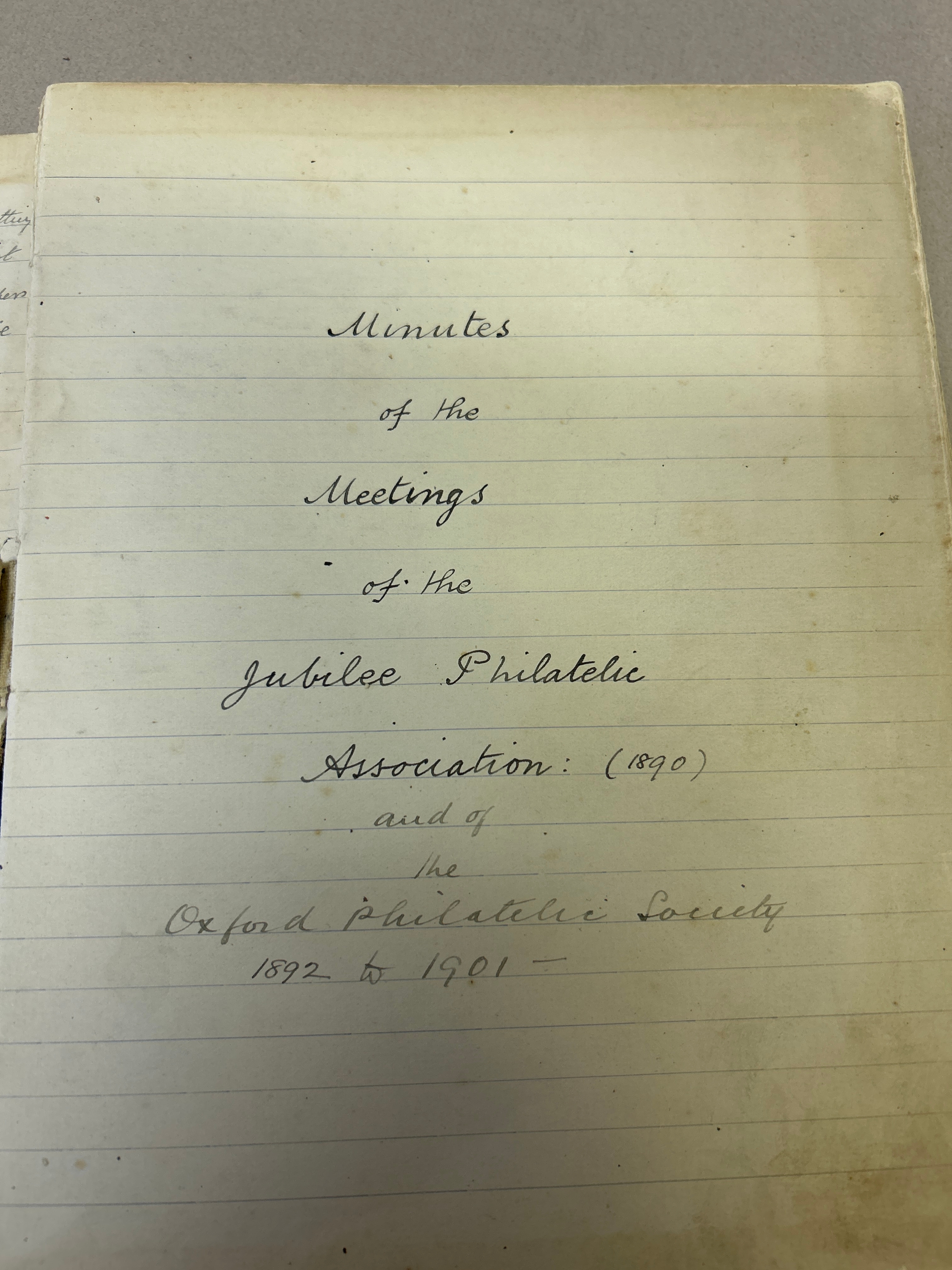 Stamp Collecting, Philately. An important 19th Century Minute Book of the Jubilee Philatelic Association (1890) and the Oxford Philatelic Society. The minutes cover the period January 1890 to December 1901. As well as minutes the book contains balance sheets, lists of members (included Mayor of Oxford), a Newspaper cutting, letter from a member (headed Oxford County Asylum Littlemore 1901), letter headings of other philatelic organisations in America etc