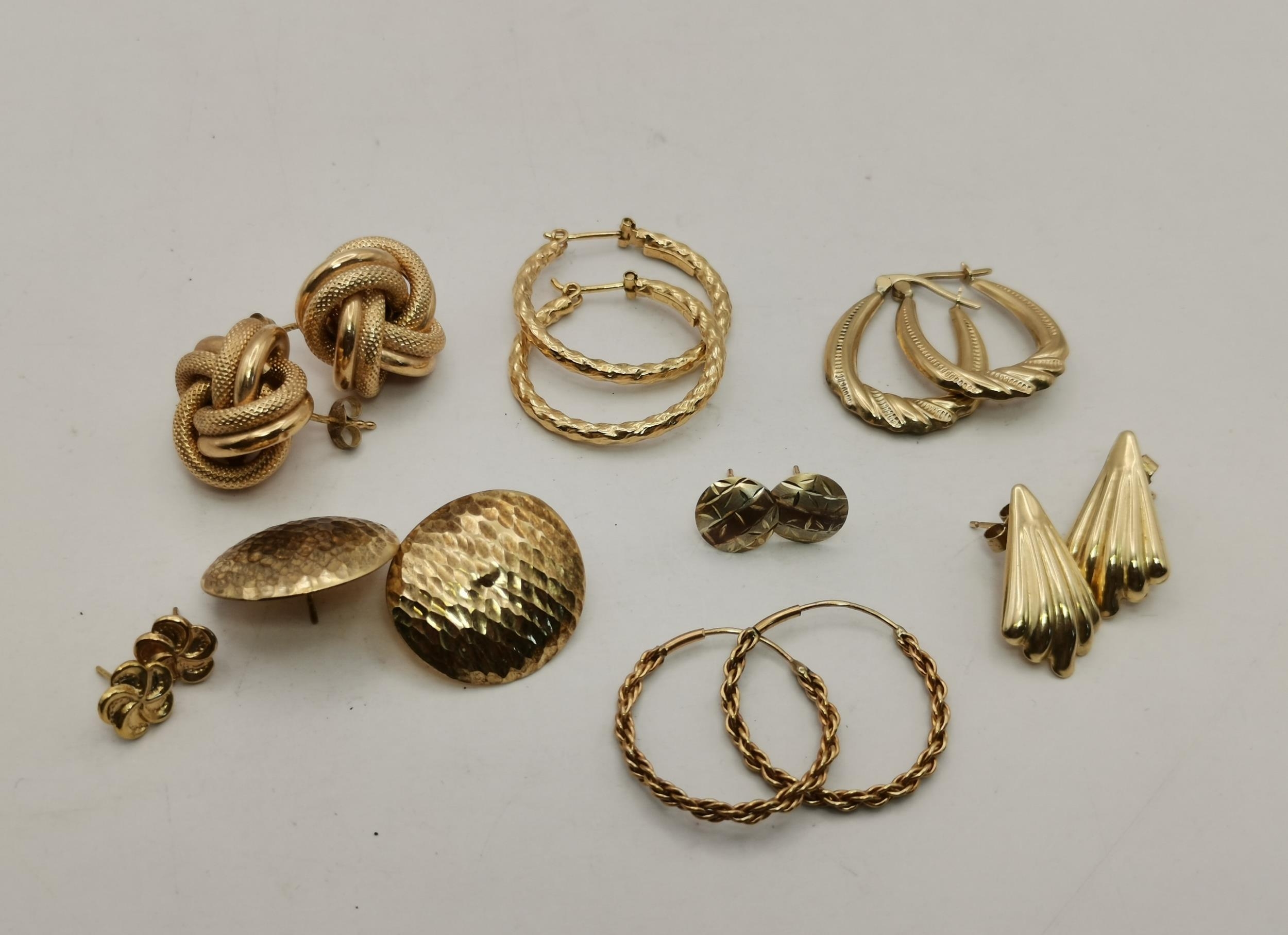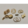 Five assorted pairs of 9 carat gold earrings, comprising hoops and studs; together with three further pairs of yellow metal stud earrings, unmarked. (8 pairs) Marked gold 10.1g gross (11.7g gross)
