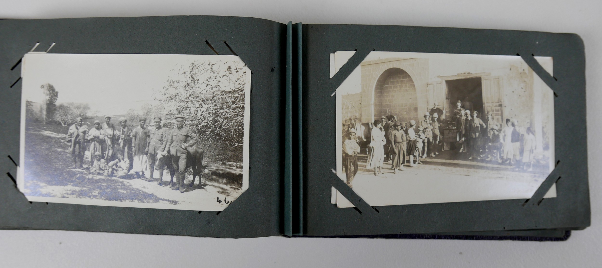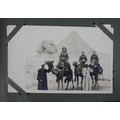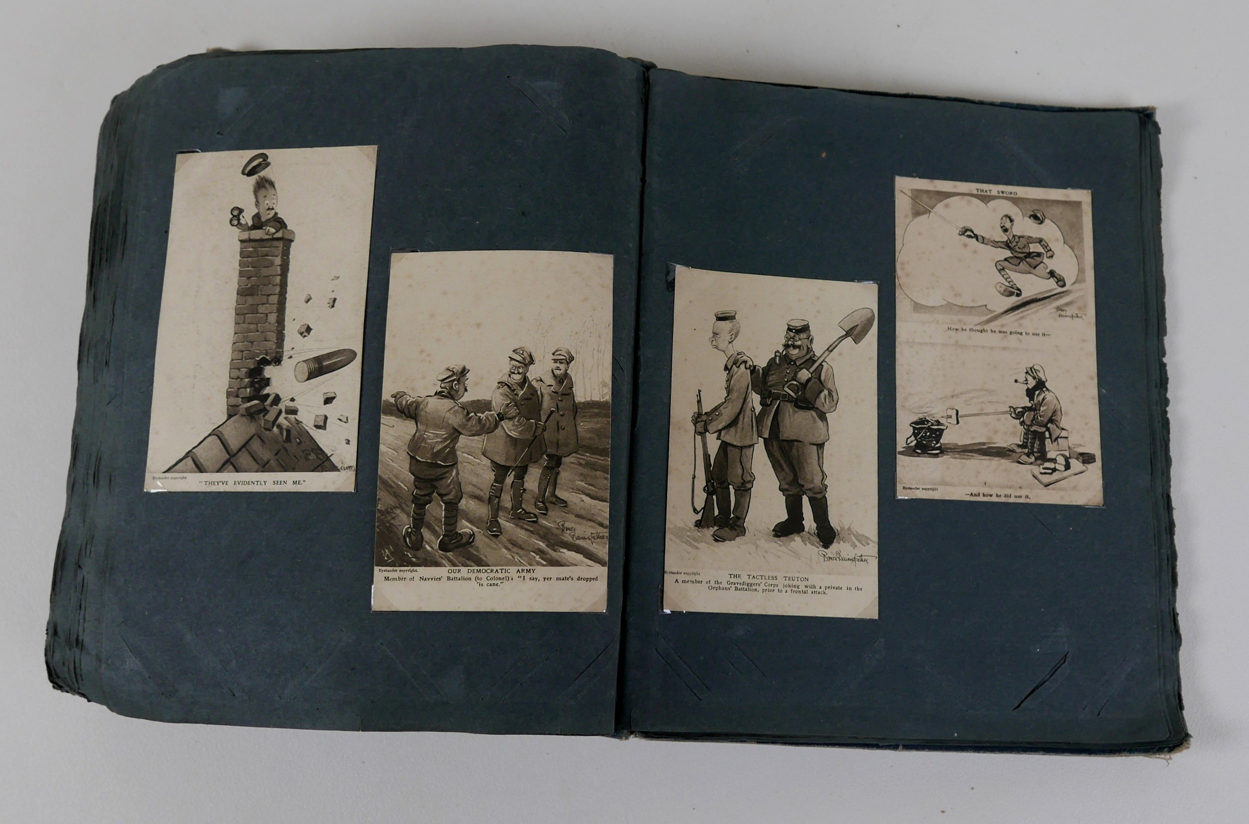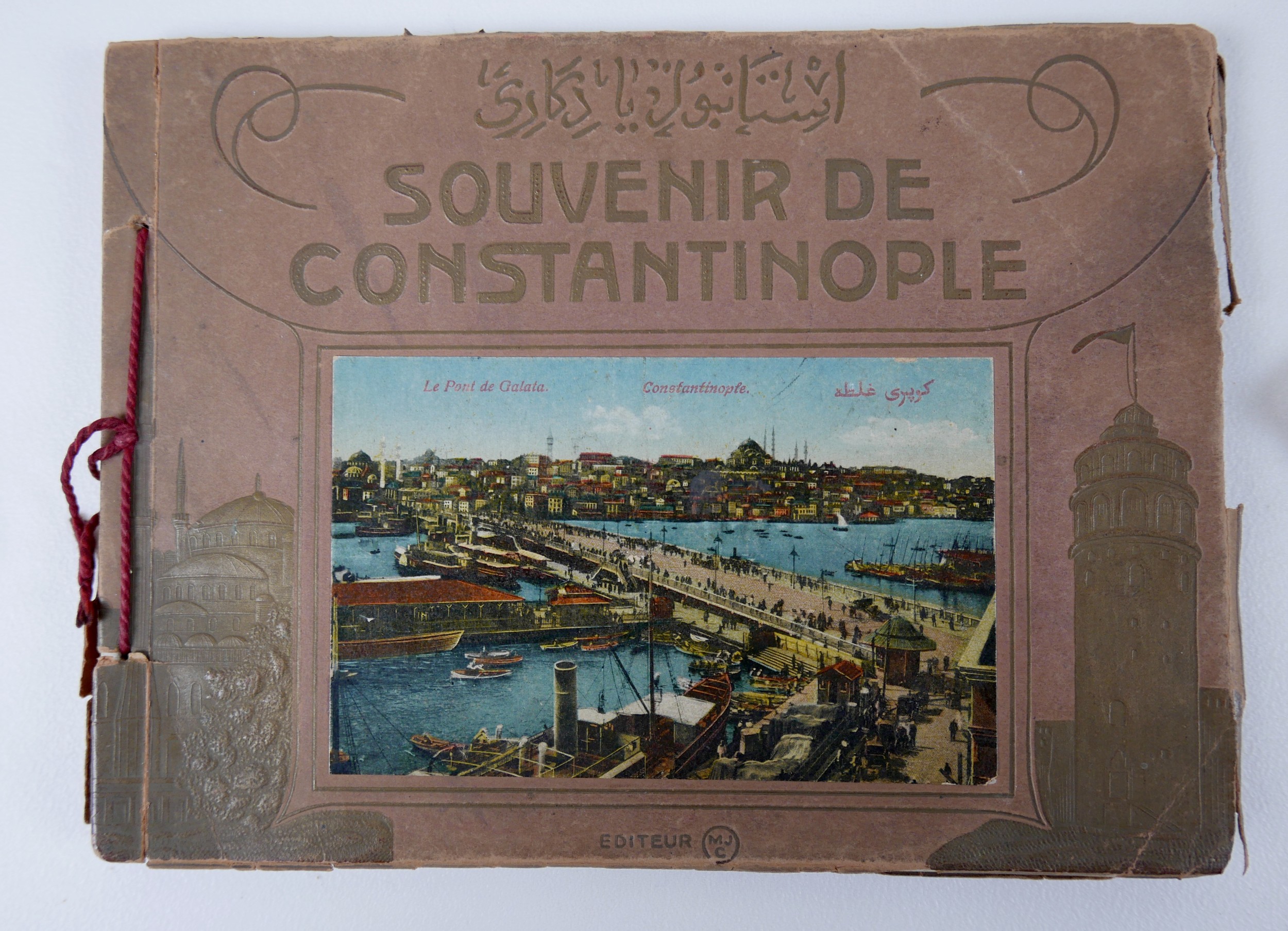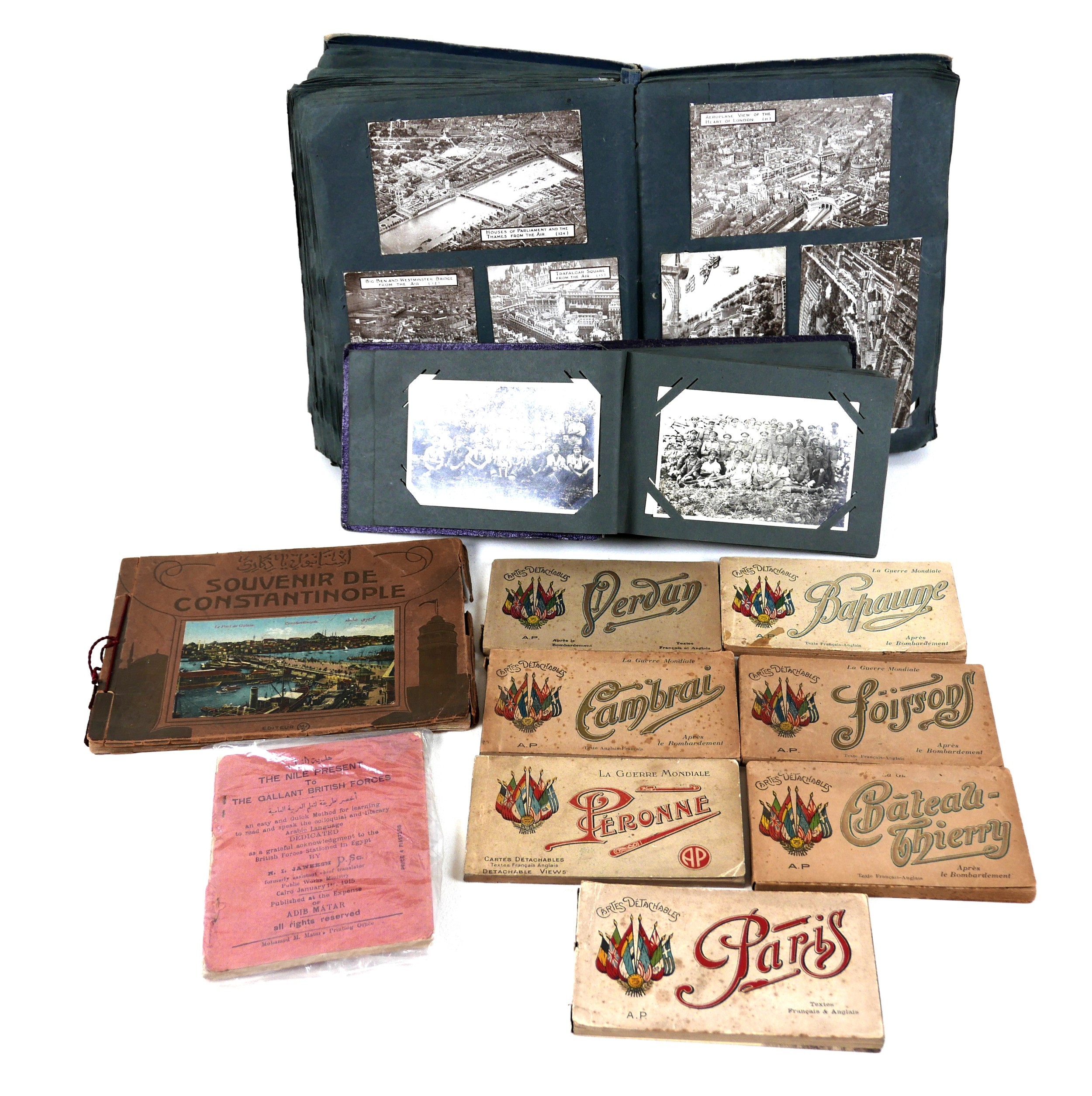 A postcard album, containing topographical and some humorous postcards, an album of early 20th century Egypt photo and postcards, seven WWI A. P. Cartes Detachables, a Souvenir de Constantinople, and an Arabic language book. (1 bag)