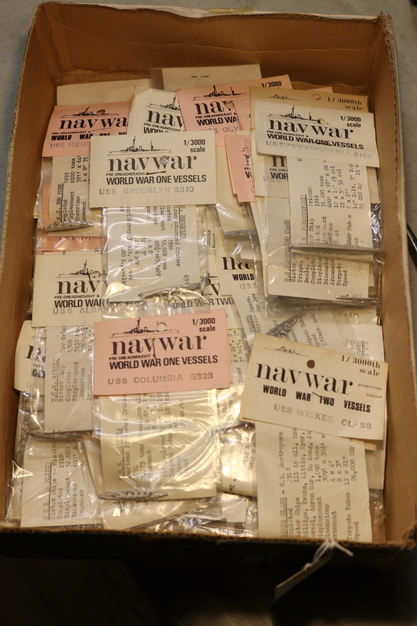 50 very small white metal and resin model ships. By Nav War and another unidentified maker. WWI and WWII Vessels, all1/3000 scale including mostly American examples - USS Brooklyn, Tennessee, Columbia, Olympia, California, Lexington, Helena, Oregon City, Pennsylvania, Wickes, Atlanta, etc. All still sealed in their packets with information sheets. VGC £40-60