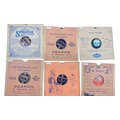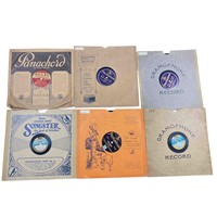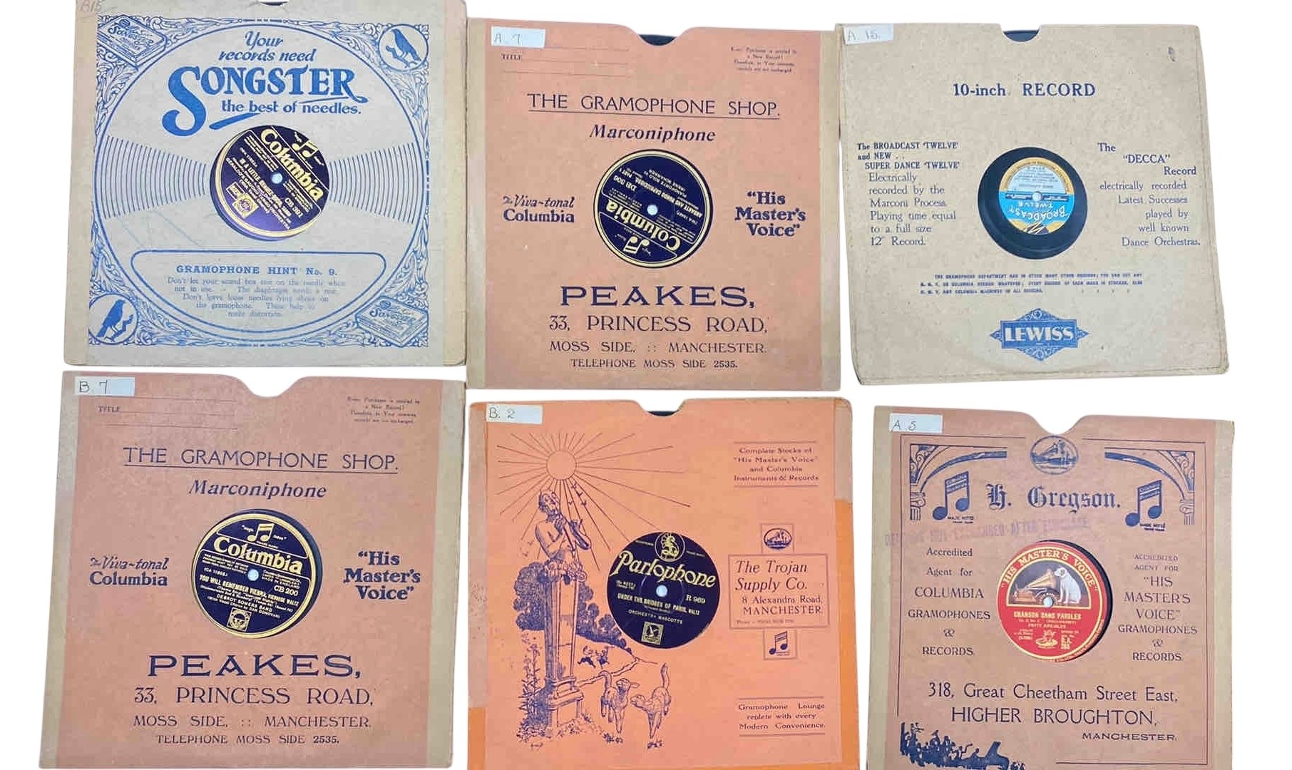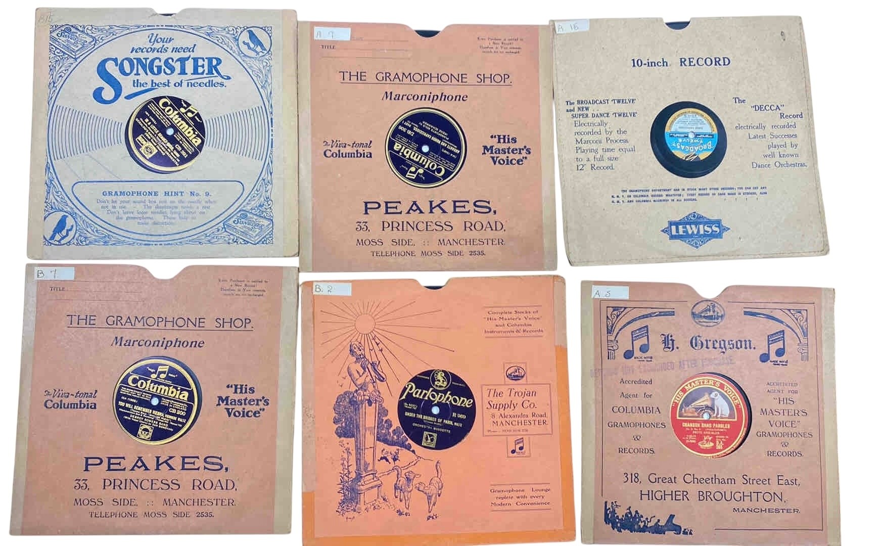 A group of early 20th-century gramophone record paper sleeves, including Columbia Songster needle advertisement designs, His Master's Voice, Pathéphone and Decca Broadcast Twelve examples, with Manchester retailer imprints.