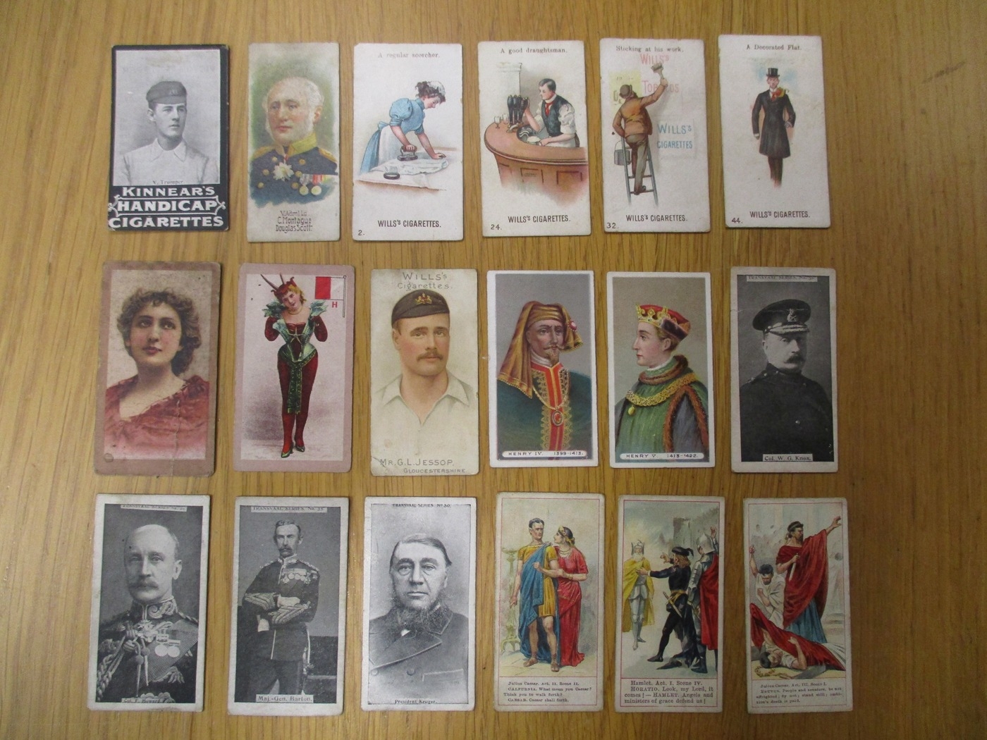 Collection of useful, good odds, including Kinnear Australian Cricket Team, V. Trumper, dry print, otherwise in fair to good condition plus ATC Beauties (1) and International Code Signals (1), Ogdens Shakespeare Series (unnumbered (3)), Players England's Naval Heroes narrow (1)), Wills 1901 Cricketers (with Vignettes (1)), Double Meaning (4), Transvaal Series (white border (4)), Ogdens Guinea Golds and Tabs ranges, etc, varying condition. Qty 100 (R)
